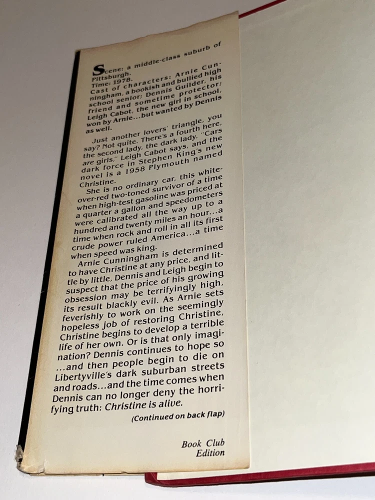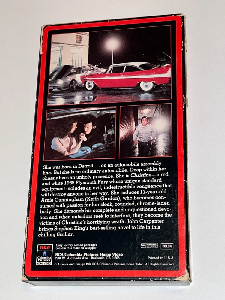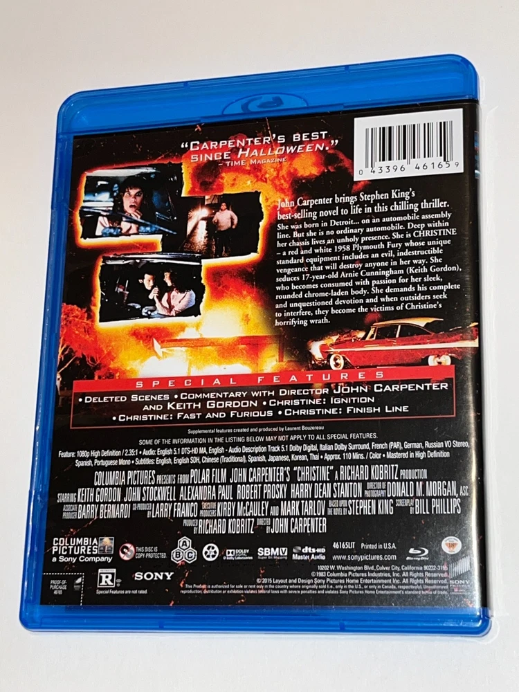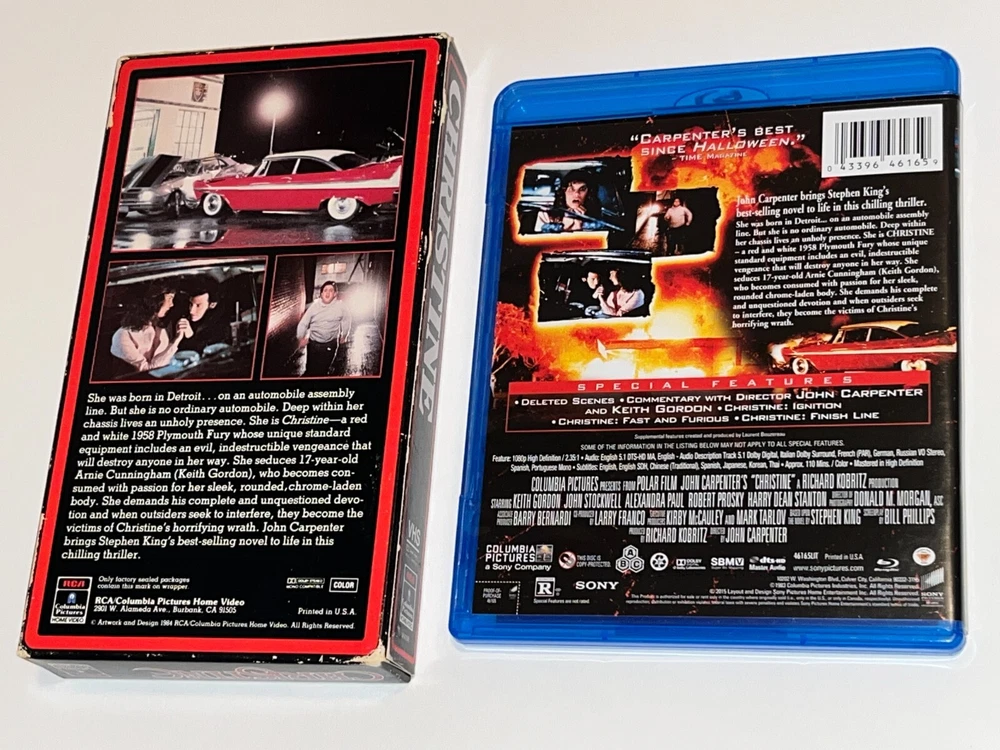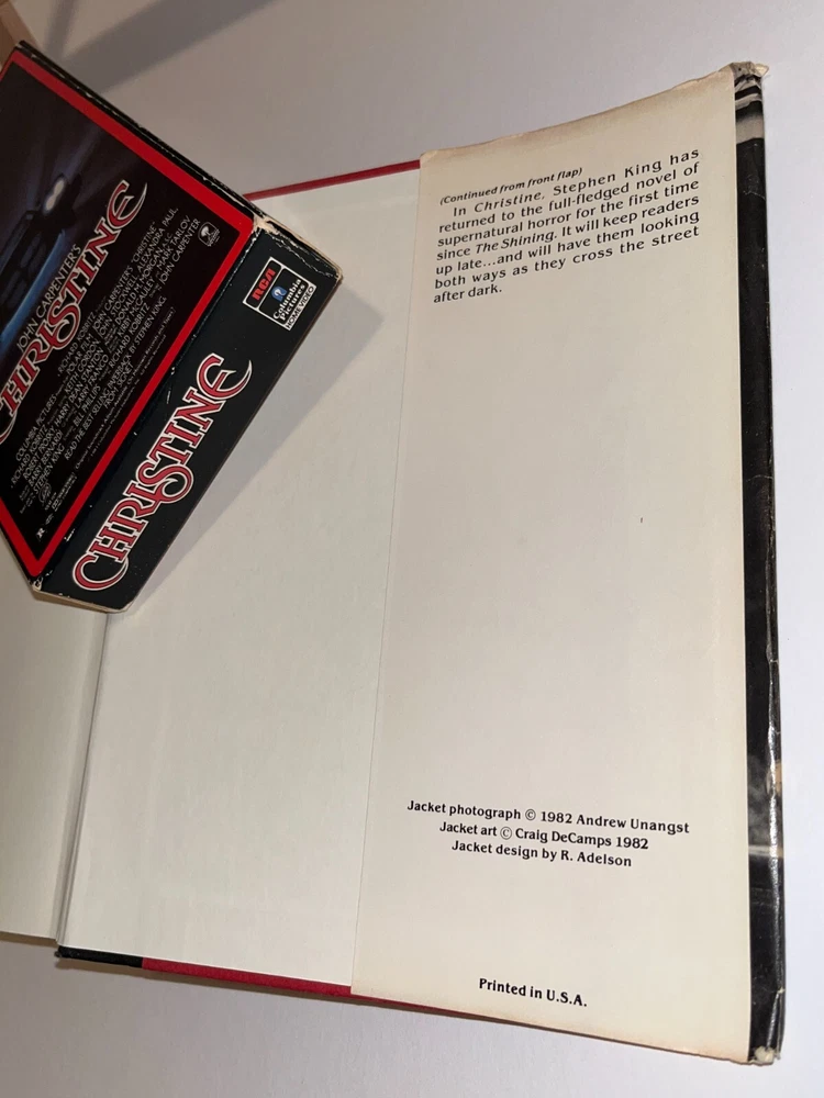 You are bidding on: A CHRISTINE Collection Lot of 4 items including the Stephen King Hardcover Book (1983 Book Club Edition, The Viking Press, NY.), a VHS (1984 release) & Blu Ray (2015 release) of the John Carpenter Movie, and ONE 8 inch by 10 inch original Lobby Card (Printed in 1983) of the gas station explosion from the film. Great HALLOWEEN Time Book & Movie! All Items are originals. A Perfect collection for Stephen King & John Carpenter fan. See ALL Photos of details of Blu Ray back cover to see what extras are included on the disc, including deleted scenes. Check out Photos of the the Hardcover Book to the see the Copyright page for original printing date. The Book slipcover has a bit of normal wear for a 41 year old book. The book itself & inside pages are in GREAT shape, with embossed title on binding and "SK" on front cover. Book may have musty oder from storage, which is typical of older original books. All Items are from a Pet-free & Smoke-free home. There are 3 different Shipping Options available, including Insurance. All may have different delivery times.