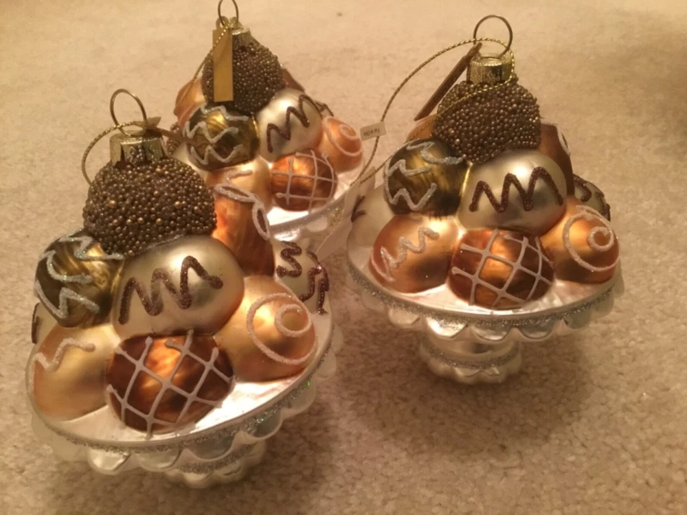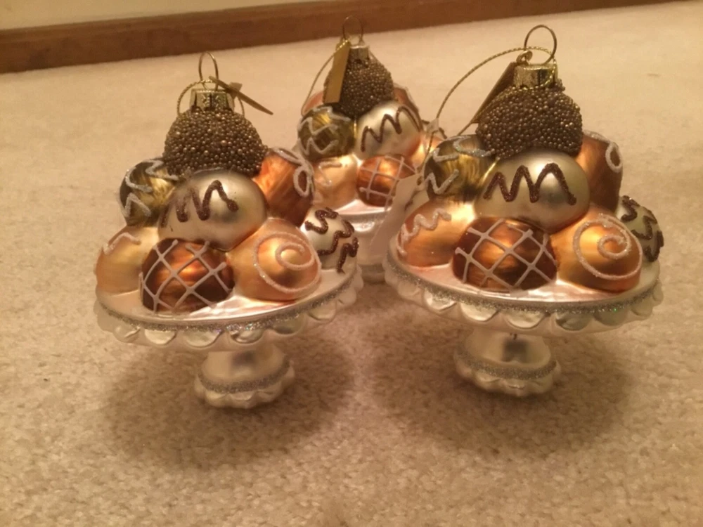 YOU ARE GETTING 3 OF KATHERINES GORGEOUS GINGERBREAD CHOCOLATE CANDIES OR BONBON PLATTER. THEY ARE ABOUT 4 1/2 IN Hgh X 4CIN WIDE. SO DETAILED WITH ALL THE GLITTER AND BEADING ON THESE PEDESTAL PLATES OF CHOCOLATES ON THESE HAND BLOWN ORNAMENTS. ADDITIONAL SHIPPING TO ALASKA OR HAWAII. PLEASE SEE MY LISTINGS FOR OTHER UNIQUE ITEMS AND MORE ORNAMENTS. YOU ARE GETTING THIS IS ABOUT HALF OF WHAT THE COST WOULD BE FOR KATHERINES COLLECTIONS.