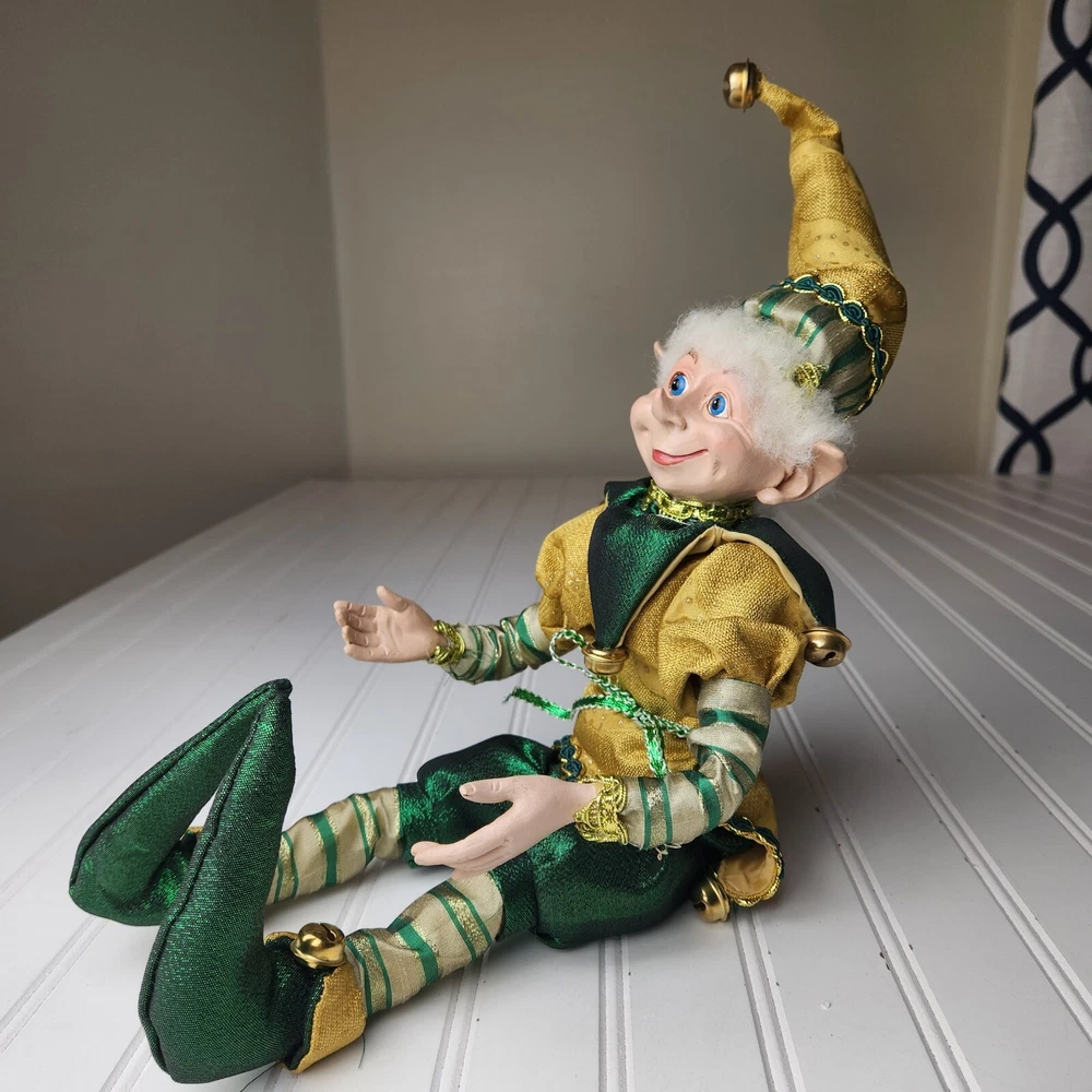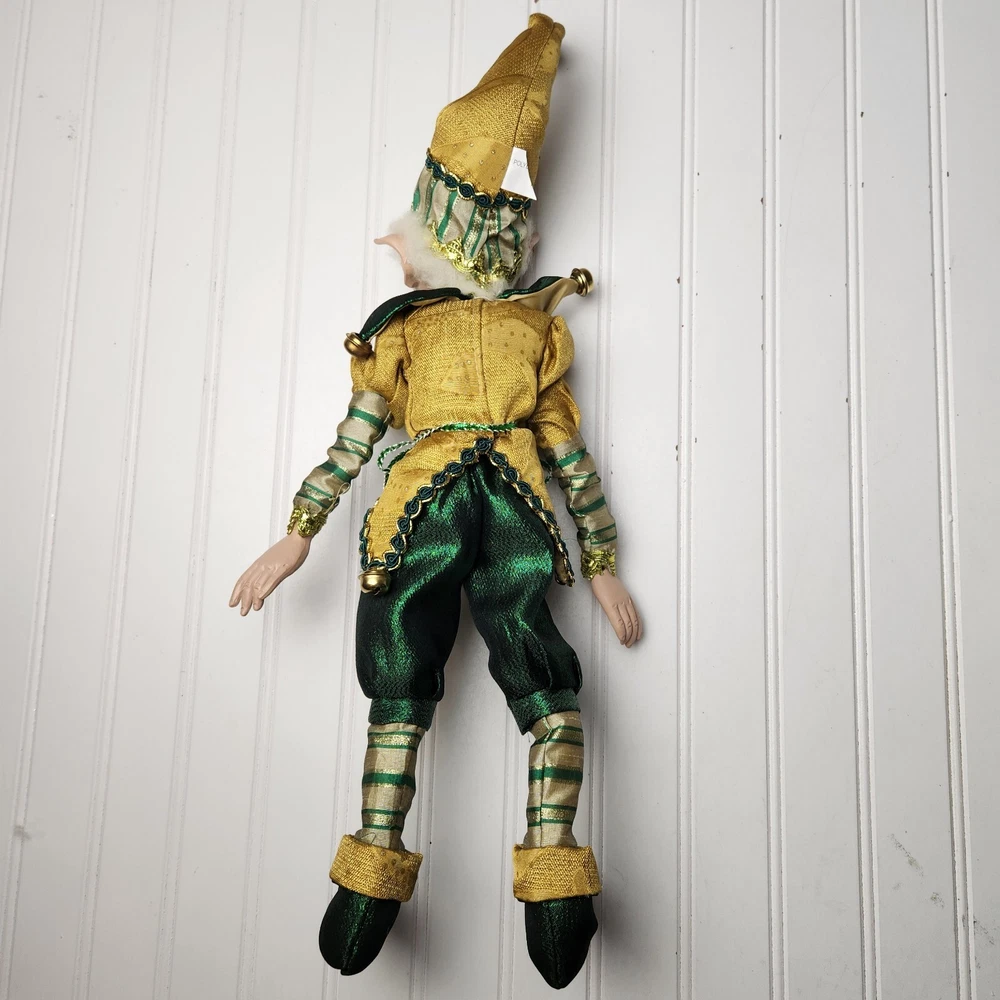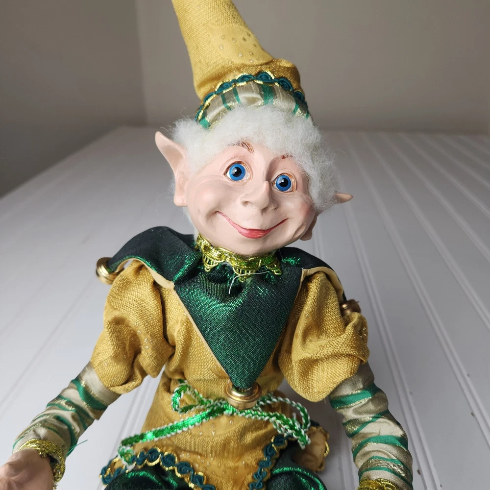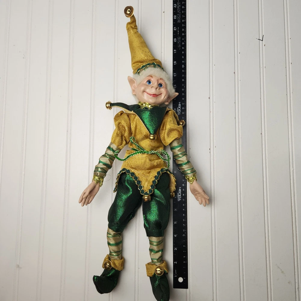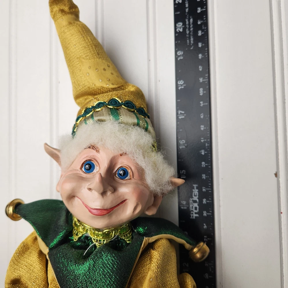 Bring some holiday cheer to your home with this charming 18" (to top of hair) posable elf doll from Raz Imports???. With its gold and green outfit and wire frame, this elf doll is perfect for Christmas decorating. The elf doll is bendable, making it perfect for creating unique and fun poses. Made with a mix of materials, this elf doll is a great addition to any collection. It features a multicolor design and is perfect for adults who love seasonal and elf fairy dolls. This elf doll is a must-have for anyone who loves collecting unique and fun holiday decorations. Great preowned condition. Maybe a few small stray marks. Will be shipped bent at the waist. Beautiful!