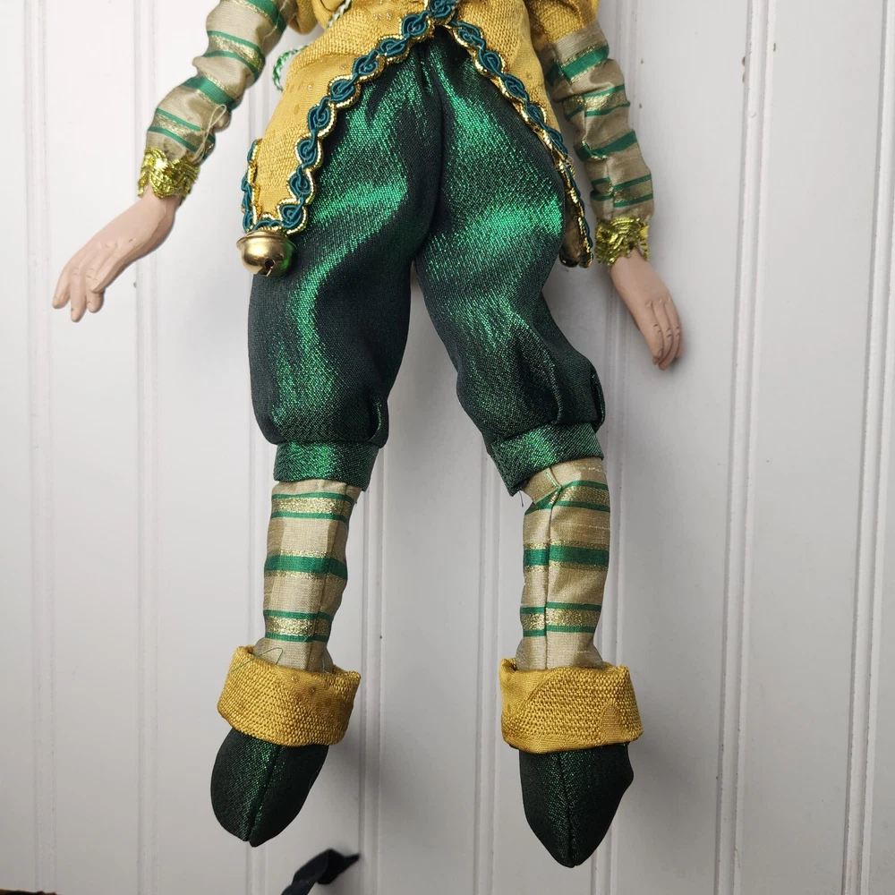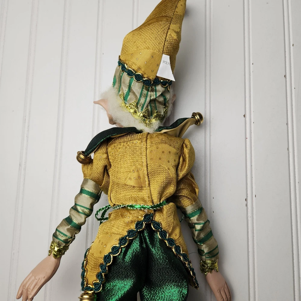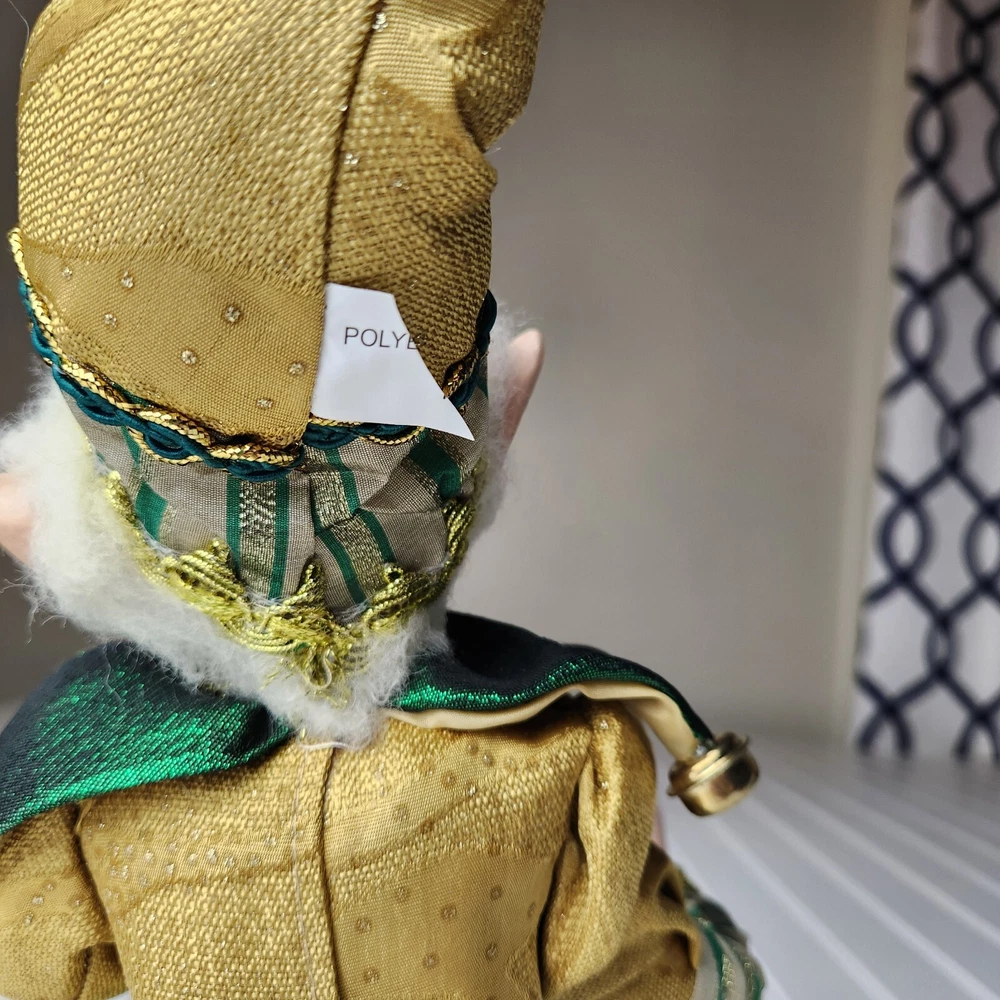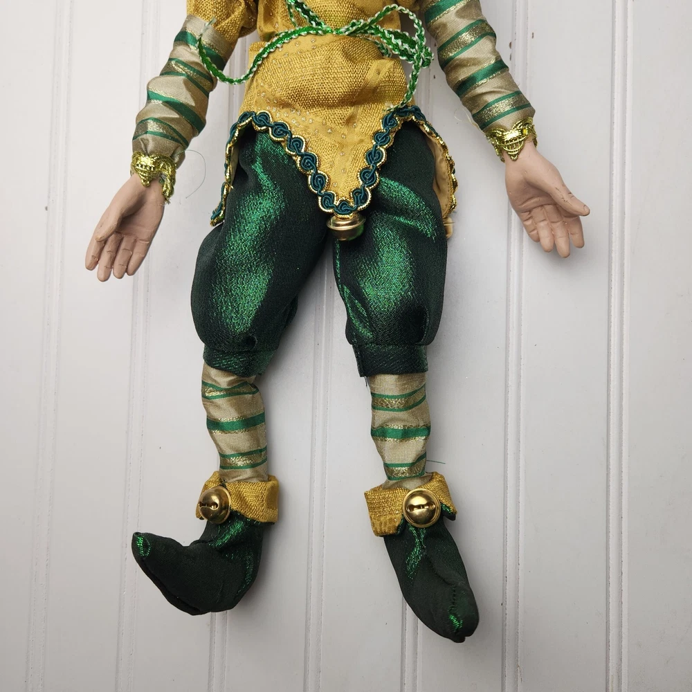 Bring some holiday cheer to your home with this charming 18" (to top of hair) posable elf doll from Raz Imports???. With its gold and green outfit and wire frame, this elf doll is perfect for Christmas decorating. The elf doll is bendable, making it perfect for creating unique and fun poses. Made with a mix of materials, this elf doll is a great addition to any collection. It features a multicolor design and is perfect for adults who love seasonal and elf fairy dolls. This elf doll is a must-have for anyone who loves collecting unique and fun holiday decorations. Great preowned condition. Maybe a few small stray marks. Will be shipped bent at the waist. Beautiful!