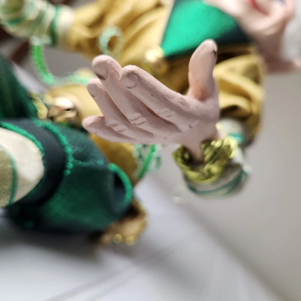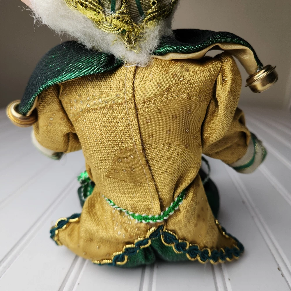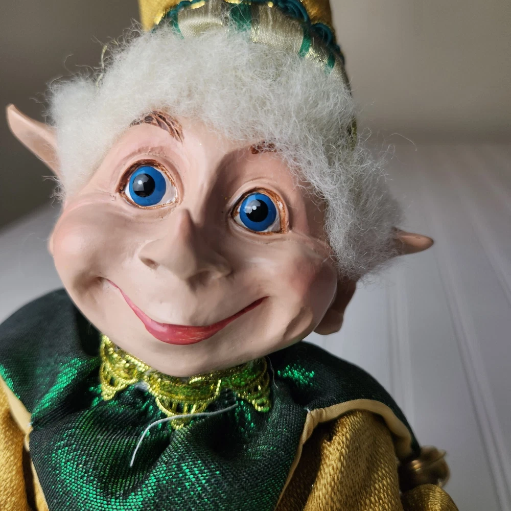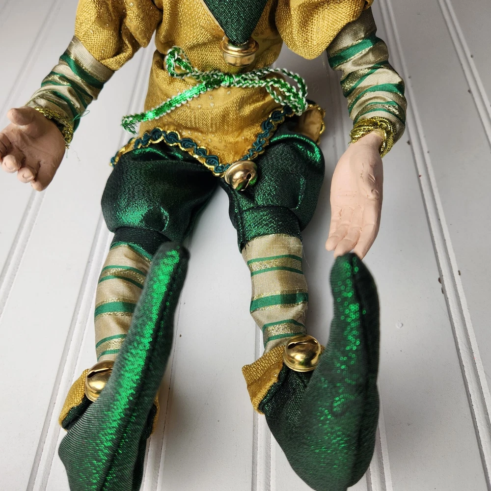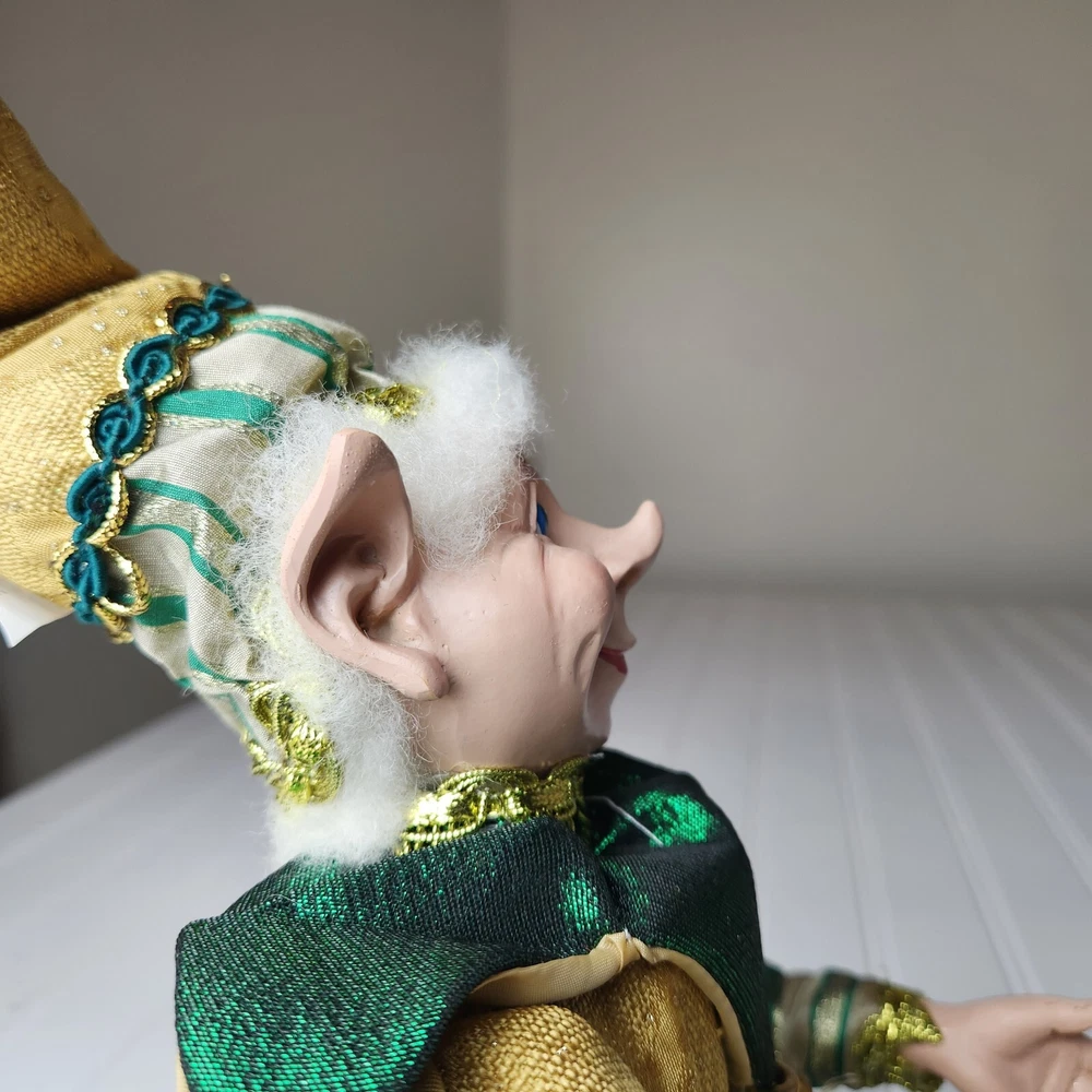 Bring some holiday cheer to your home with this charming 18" (to top of hair) posable elf doll from Raz Imports???. With its gold and green outfit and wire frame, this elf doll is perfect for Christmas decorating. The elf doll is bendable, making it perfect for creating unique and fun poses. Made with a mix of materials, this elf doll is a great addition to any collection. It features a multicolor design and is perfect for adults who love seasonal and elf fairy dolls. This elf doll is a must-have for anyone who loves collecting unique and fun holiday decorations. Great preowned condition. Maybe a few small stray marks. Will be shipped bent at the waist. Beautiful!