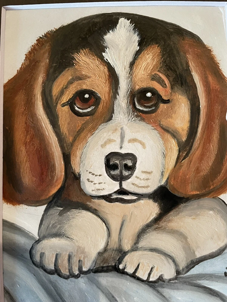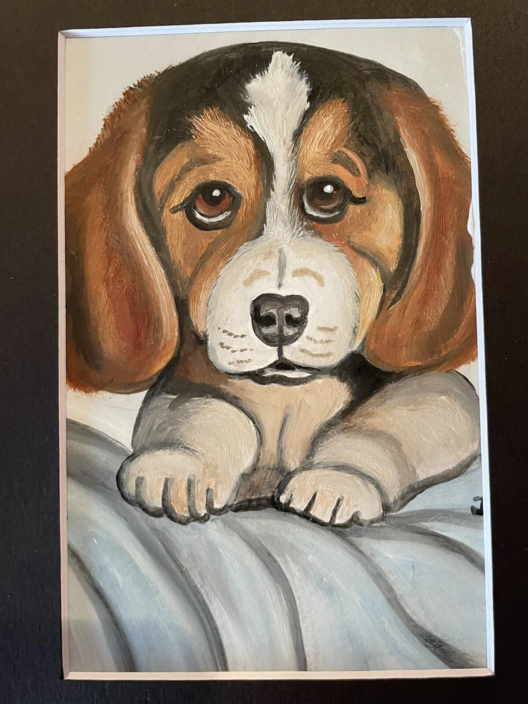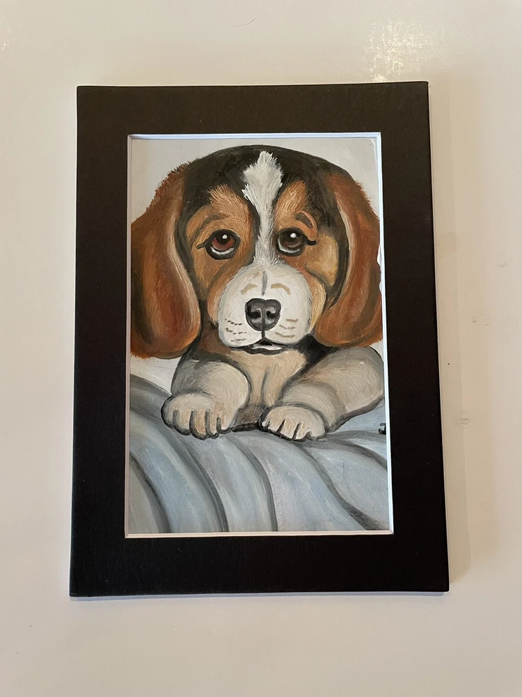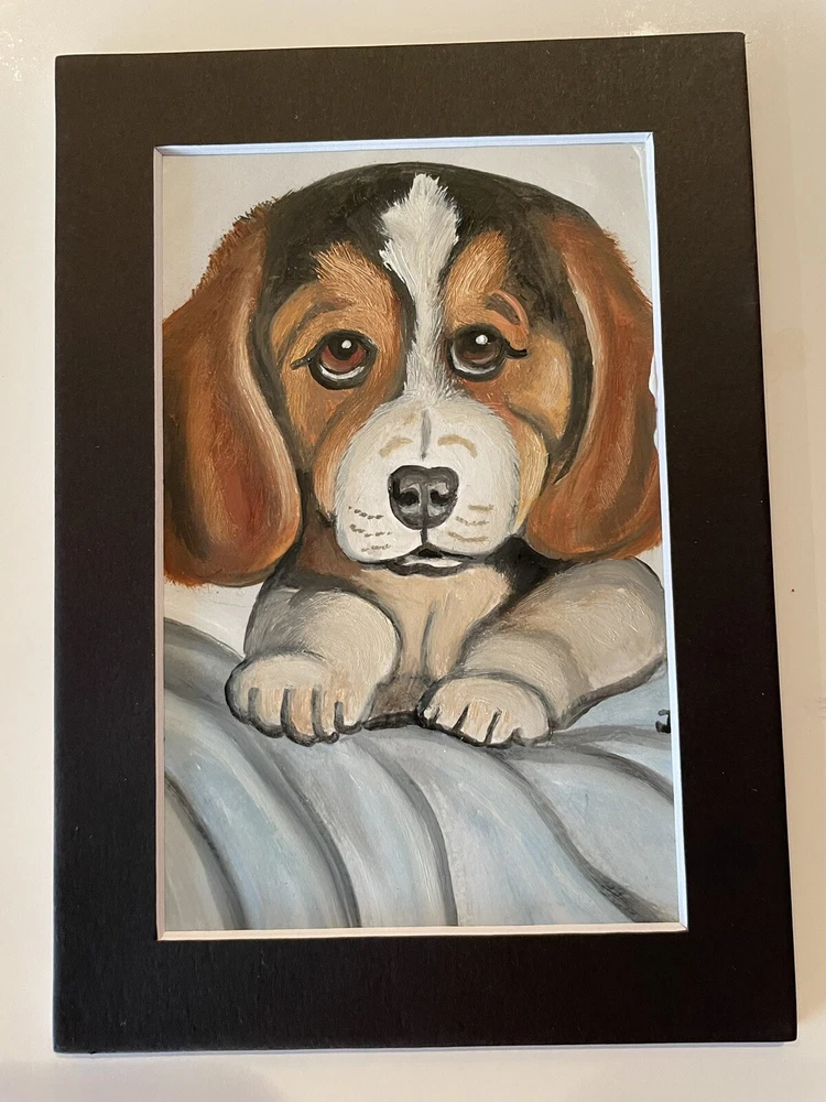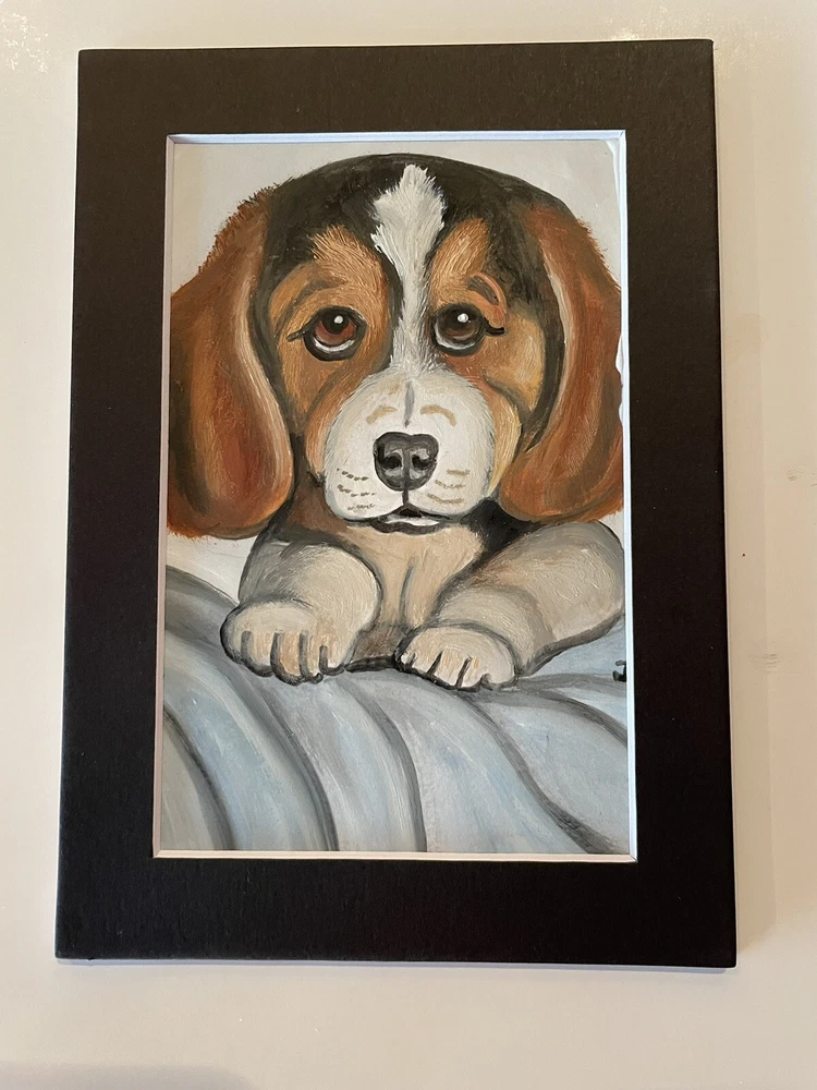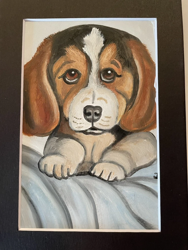 This adorable 5 x 7 oil painting depicts a cute beagle dog puppy in stunning detail. The painting is an original, one-of-a-kind piece that is perfect for any art lover or dog enthusiast. The artist, J Smith, carefully crafted the painting using high-quality materials such as cardstock and cardboard. The painting is unframed and comes with black matting, making it a great addition to any collection. Its realistic style and vibrant colors bring the puppy to life in a unique and captivating way. This piece is a must-have for anyone who appreciates art and wants to add a touch of whimsy to their home or office.