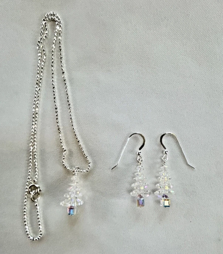 Closure: Hook and Spring Ring gtin13: Does not apply Metal Purity: Unknown Antique: No Color: Clear AB Brand: Handcrafted Wholesale: No Handmade: Yes Main Stone Color: Clear Item Length: 1 inch Setting Style: Bead Country of Origin: Handmade Occasion: Christmas UPC: Does not apply Main Stone Treatment: AB Vintage: No Type: Earrings and Necklace Customized: No Ear Area: Lobe Main Stone: Swarovski Crystal Shape: Tree Item Condition: New Features: Handcrafted Main Stone Shape: Round Seller Notes: “New Handcrafted Crystal Earrings and Necklace” Main Stone Creation: Crystal Material: Crystal / Silver Metal: Silver Theme: Holiday Gemstone & Stone: Swarovski Crystal Personalize: No Secondary Stone: Crystal Cut Grade: faceted Signed: No Style: Beaded