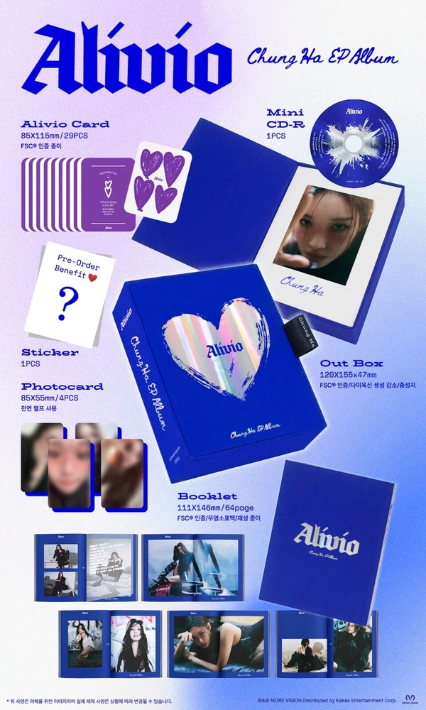 Item Information Please take an UN-BOXING video right after the delivery arrived in case of any defective or missing items inside. Artist : CHUNG HA Title : Alivio EP Format : CD Release Date : 2025.02.13 Condition : Brand New & Factory Sealed Package : Mini CD + 64p Booklet + Alivio Card (29ea) + Photocard (4ea) + Sticker (Pre-Order Benefit) ** Will be Count Towards Hanteo and Gaon Chart (Family Code : HF0082LES001) Track Listing Item Notes Your purchase quantity will be counted on Korea HANTEO Chart and GAON Chart . We are HANTEO and GAON CHART membership store in Korea. We will ship this item by Registered Postal Air Mail. TERMS Thank you very much for visiting our store! We are most famous CD wholesaler and on-line retailers in Korea. We guarantee our all items are 100% Original Brand New. We do not sell Bootleg or Used items! If you have questions please feel free to contact us by e-mail or eBay message . We usually send response within 24 hours. PAYMENT We accept PayPal only. We hope to recieve your payment within 3 days. SHIPPING All items shipped from Korea, South. We will more carefully packed your purchase item. We ships within 1~3 days after receiving cleared payment. ( Except Holiday ) Transit times may vary, particularly during peak periods. SHIPPING METHOD & ESTIMATED DELIVERY TIME We have two shipping method option as follows. INTERANTIONAL POSTAL REGISTERED AIR MAIL - US, Canada, Europ, Asia country, Australia (10-25 Business Days) - South America, Africa (20-40 Business Days) International Postal Air Mail Service are delivered through the postal delivery system. This service include a tracking number . You can track the tracking number through your post office website. FedEx INTERANTIONAL PRIORITY - Worldwide (2-7 Business Days) FedEx International Priority is, generally, delivered in just 2-7 business days after leaving our facility. FedEx International Priority is fully insured and is trackable online from the time that it leaves our facility until it arrives on your doorstep. International Shipments Please Note: Import duties, taxes, and charges are not included in the item price or shipping cost. These charges are the buyer's responsibility. Please check with your country's customs office to determine what these additional costs will be prior to bidding or buying. International Shipments also require the same billing and shipping address. COMBINE SHIPPING We always do Combined Shipping. The Highest shipping costs and Each additional costs will be calculated as total shipping. If you want buy several items, please contact to us after your bidding completed. Then we will send an revised combined shipping invoice to you. RETURN POLICY We accept Return for Buyer's any reason. But item must be Sealed and Un-used Original Condition. (If you already opened or used item, Return will be Not accepted) Shipping is NOT refundable. We will send refund as soon as refunded arrived. If you received wrong item, please let us know to resolve problem. We will exchange to correct item. (We will pay return shipping)