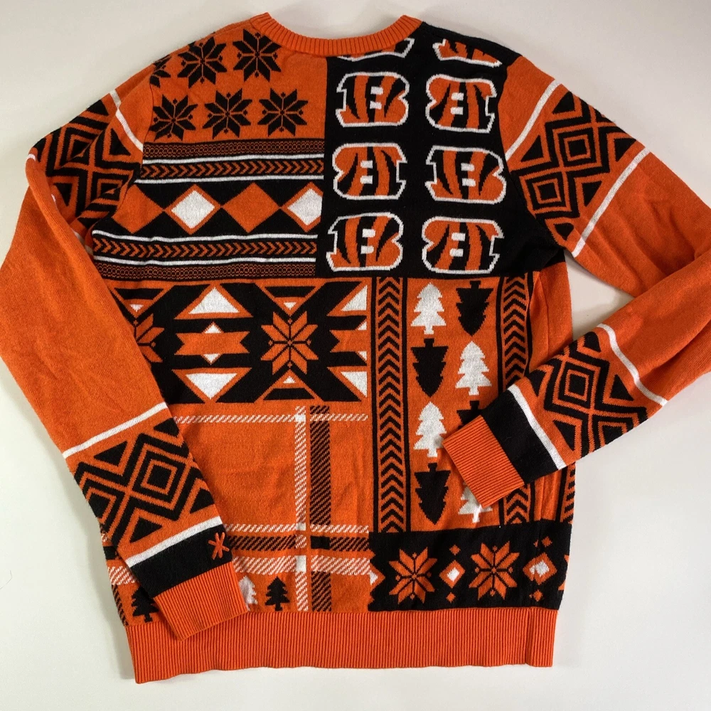 Show off your love for the Cincinnati Bengals with this officially licensed NFL Team Apparel sweater. Perfect for the holiday season, this unisex adult sweater features the team's iconic orange color and is available in size large. The sweater is made for football fans and carries the team's logo prominently on the front, making it a must-have for any fan. Celebrate Christmas in style with this comfortable and stylish sweater. It is perfect for both adults and teens and is a great addition to any sports fan's wardrobe. Get ready to cheer on your favorite team in the National Football League (NFL) and show off your love for the Cincinnati Bengals with this awesome sweater.