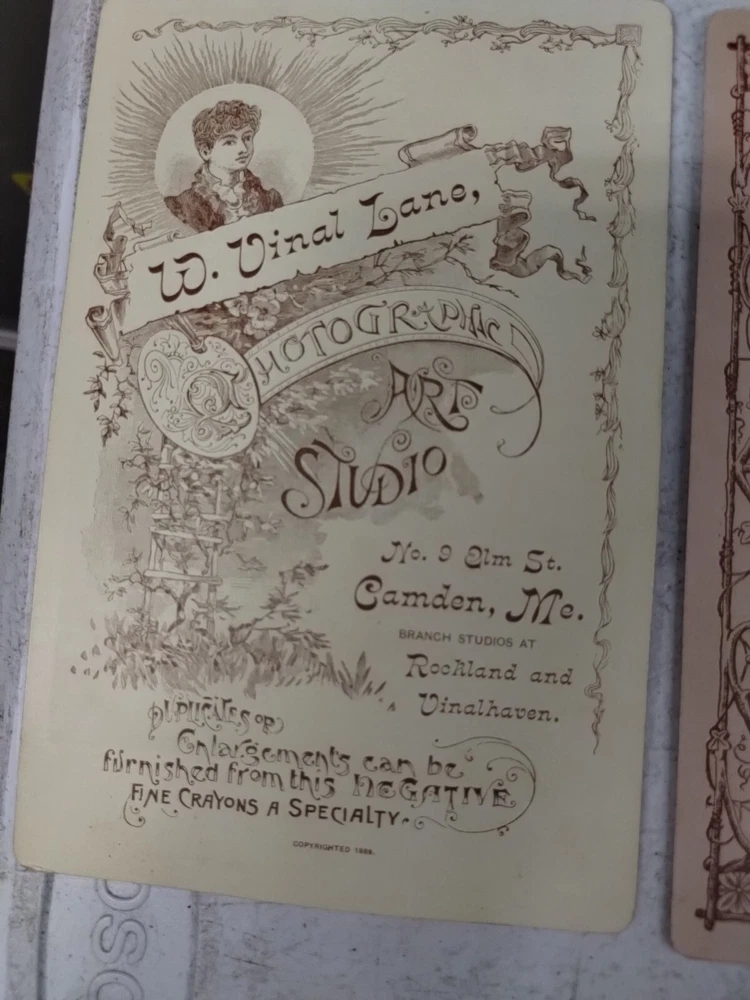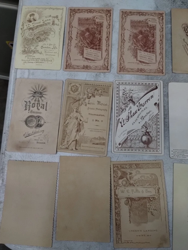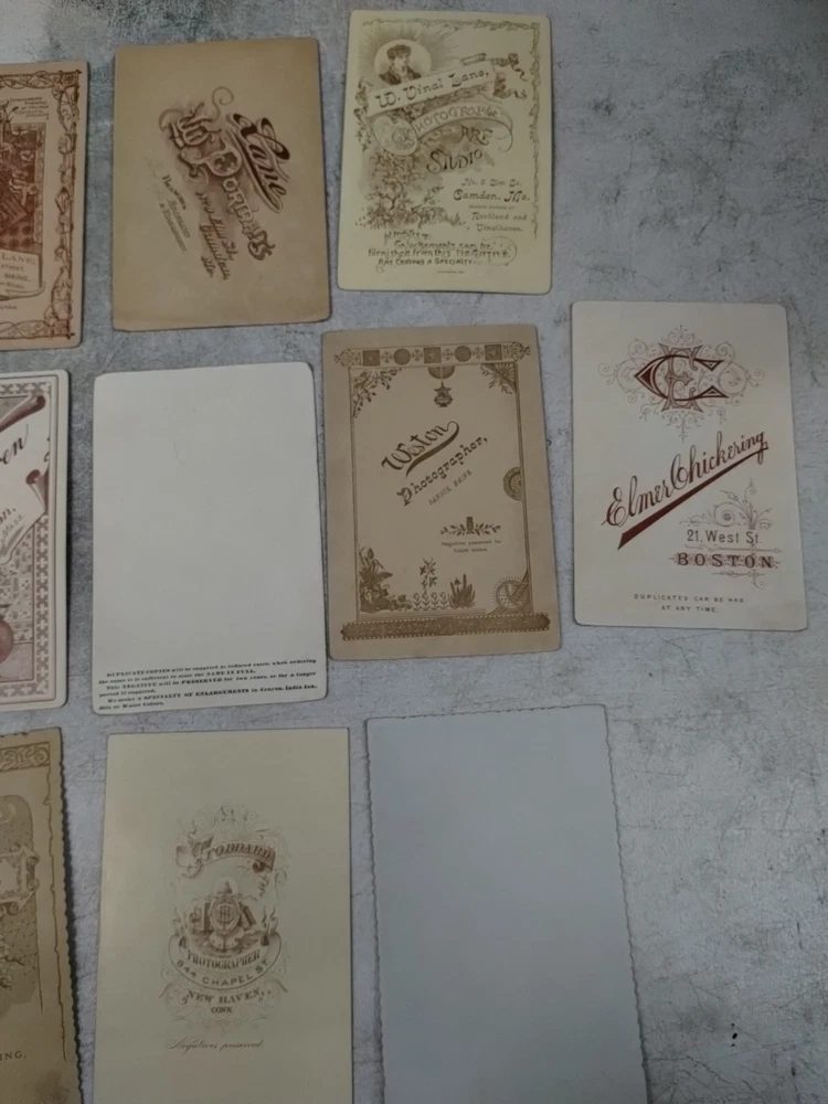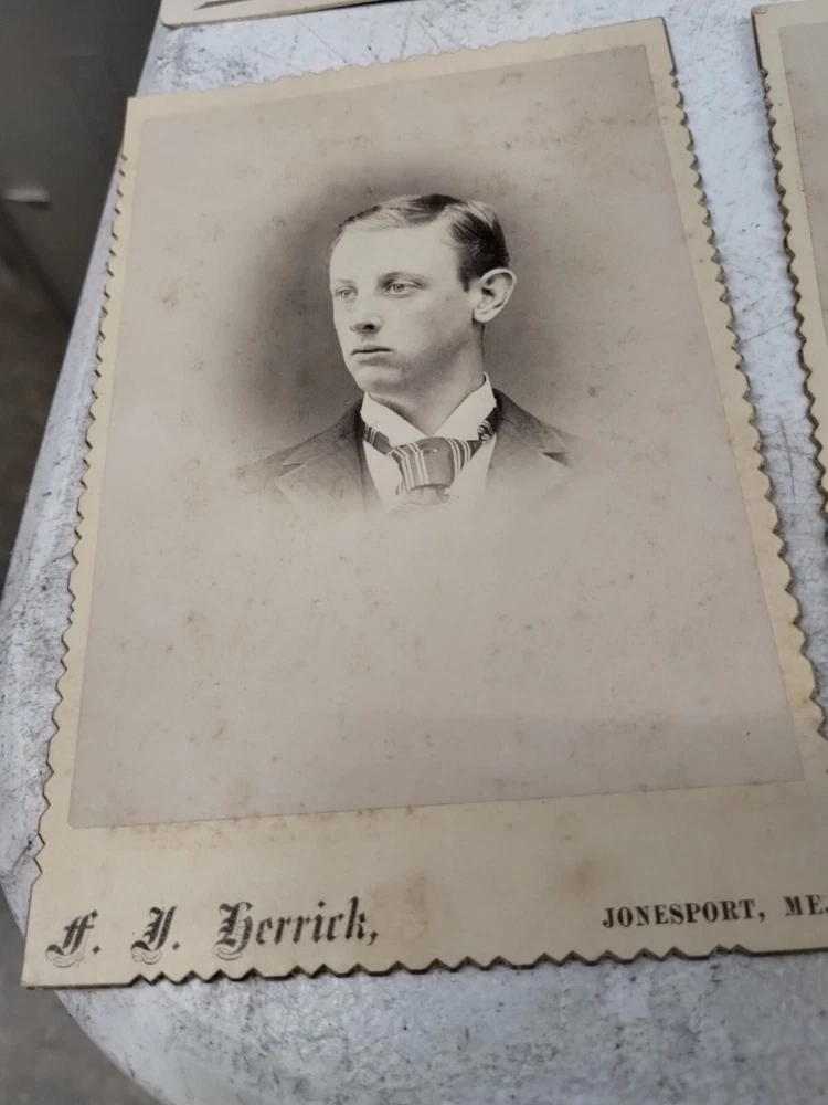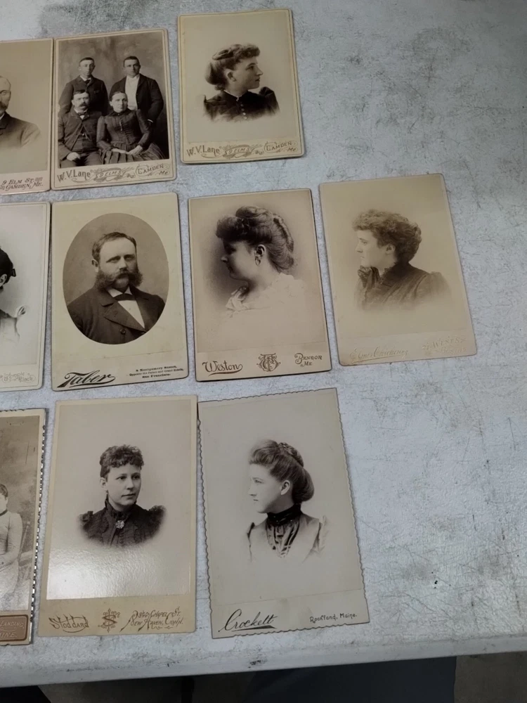 This is an antique Cabinet Cards photograph from the 1890s featuring a family group taken by multiple studios. The portrait is printed on glossy cardboard material in a portrait orientation. This original albumen print showcases men and family members in a vintage style typical of the late 19th century United States, making it a unique and historical piece of photographic memorabilia. Locations Crockett Rockland, Maine F J Derrick Jonesport, ME Sroddard. New Haven, Conn W v lane. Camden, Maine W C Tuttle & son Green's Landing ME W Shaw Warren. Boston, Mass Elmer Chickering. Boston, Mass The Royal Studio Weston photography. Bangor, Maine Taber. San Francisco, CA Levi Morse. Thomaston, Me