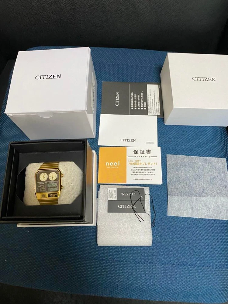 Watch Shape: Square Band Color: Gold Reference Number: JG2103-72X UPC: 4974375486584 Department: Men's Case Material: Stainless Steel Type: Wristwatch Brand: CITIZEN Style: Casual Movement: Quartz Case Size: 35 mm Age Group: Adult Dial Color: Brown gtin13: 4974375486584 Vintage: No Display: Analog & Digital Customized: No Band Material: Stainless Steel With Original Box/Packaging: Yes