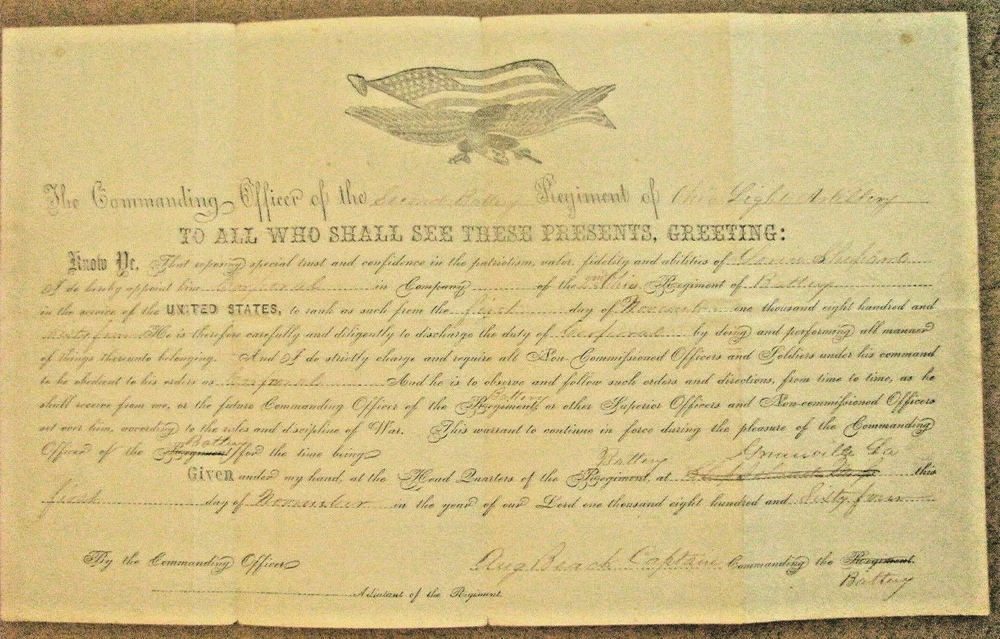 Corporal Lorin Shepard served in the 2nd Ohio Artillery Battery, and saw action at the Battles of Red River Campaign. An original Civil War NCO Officer Commission issued to promote Private Lorin Shepard to Corporal, issued Nov 1, 1864 , signed by Battery Commander Augustus Bech, at HQ Greenville, Louisiana. The 1p 8 x 14" ptd/ink commission bears a handsome early War illus of the American federal eagle with a US flag. The 2nd Ohio Battery of Light Artillery took part in the Battles including Pea Ridge, Arkansas , Port Gibson Louisiana, the Vicksburg campaign and the Red River Campaign; after the battle the unit served in Plaquemine, Louisiana and Ship island, Mississippi until the End of the War. Comes w service info- Captain Beach served 1861-65 with the 2nd Ohio Battery Age stains, edge wear, Overall VG. Comes with a postwar n original pension form for his widow. EBAY MY NOTICE FOR MY LISTED ITEMS Welcome to my Ebay Auctions and Ebay Store. I am a specialist in early American Military & Historical items, especially American Civil War ephemera- letters, military & historic documents including broadsides, commissions, General Orders and other imprints. I have been collecting and selling original American Civil War & US Military memorabilia for 35 years My customers have included some of the leading names in collecting and selling American History items, as well was as a wide range of novice & advanced collectors in addition to some 30 US federal, state, public and private university & municipal museums and libraries. All items are unconditionally guaranteed to be authentic and in the condition as described. I am a longtime member of the Company of Military Historians, the New England Antique Arms Association, the Ephemera Society of America & the Civil War Veterans Historical Assn. NOTE: Any repair to a paper item is listed. I use only museum curator approved archival repair tape. I SELL ONLY ORIGINAL ITEMS, AND HAVE BEEN A PROFESSIONAL FULL TIME SELLER OF ANTIQUE HISTORICAL ITEMS SINCE 1980. PLEASE SEE MY EBAY STORE FOR OTHER LISTINGS. PLEASE READ DETAILS OF THE ITEM DESCRIPTION. I TRY TO DESCRIBE ALL ITEMS ACCURATELY U.S. SHIPPING ONLY I ship only USPS priority mail with insurance If you would like to Add Me as a Seller You Follow, Go to the Seller Information Bar on the Middle Right Side of the Page and click ‘Follow This Seller” If you would like to Add Me as a Seller You Follow, Go to the Seller Information Bar on the Middle Right Side of the Page and click ‘Follow This Seller”