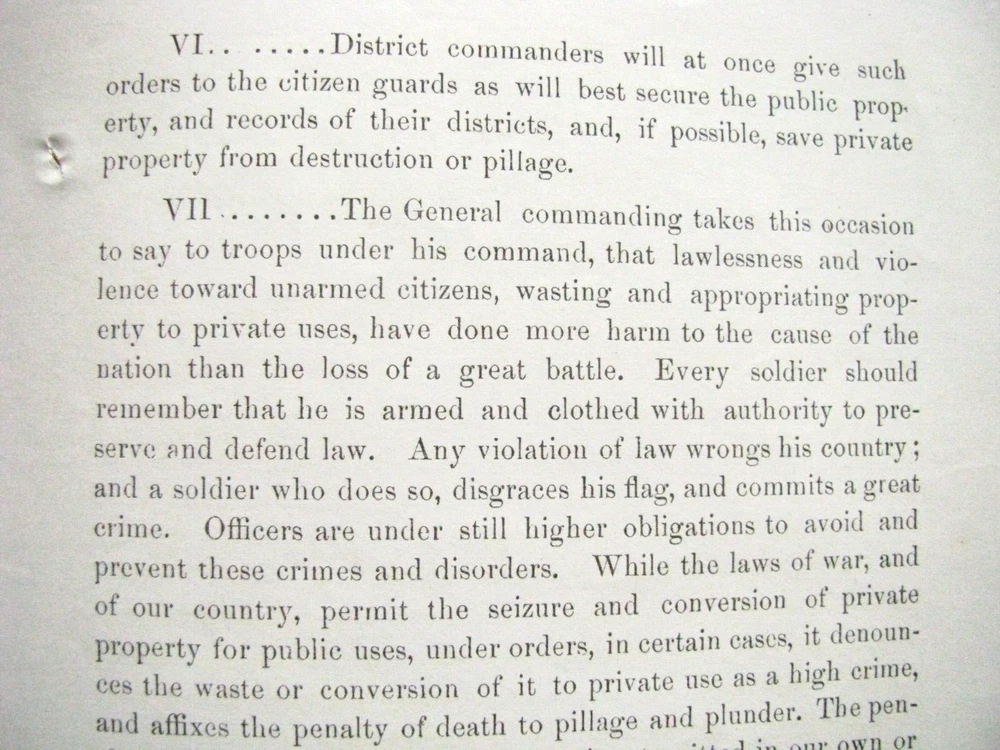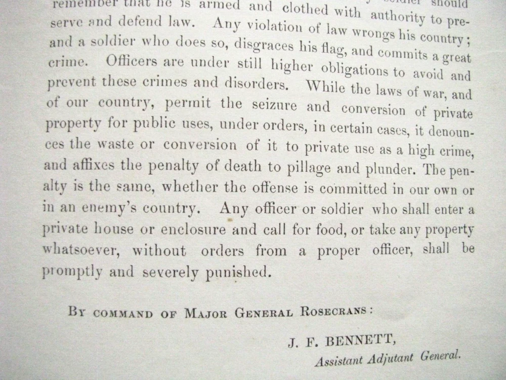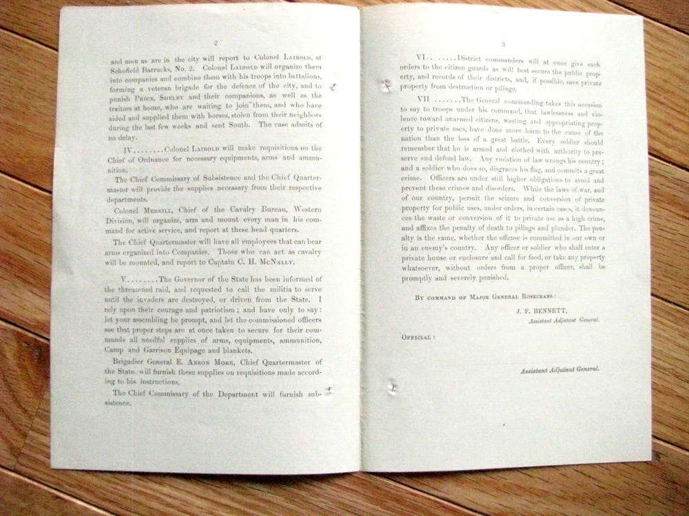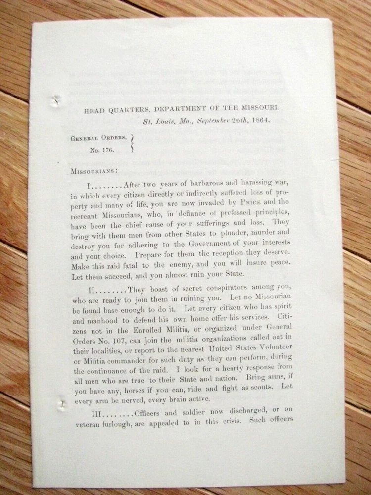 In 1864 Confederate forces under General Sterling Price invaded Missouri. An original Civil War General Order, issued HQ Dept of the Missouri, St Louis, September 26, 1864- General WS Rosecrans calls on Loyal Missourians to resist "Price & the Miscreant Missourians", to defend their homes from Jo Shelby & "the traitors among us", for Missouri Militia & furloughed veterans to secure arms and horses, to fight and ride as scouts, and for loyal citizen bands to report to Schofield Barracks for duty. The Union Forces defeated Price in battle at Independence, Westport, &Marais des Cygnes, ending the last Confederate Trans-Mississippi Expedition 3pp ptd. 8 x 5" . 2 Punch holes in left margin, overall Exc. General & Special Orders were issued to communicate commands and information to the Army. Each order, issued in writing by a commander, was then printed for distribution to each unit, either at an army department headquarter or by commanders at local headquarters, sometimes in the field on portable printing presses. The orders were then issued to regiments, often to be read aloud to the troops. General Orders were printed as issued with date & location; at the end of a year the regimental adjutant might retain them loose or simply string bind them by punching holes and stringing on ¼” red cloth string tape (the source of the old expression "government red tape"). Sometimes an officer or HQ clerk might take a group of orders to a local print shop or bookbinder and have an accumulation bound with leather or cloth covers. Usually, American Military Orders of the 19 th century including Civil War era were printed on an 8 x 5” sheet of quality rag paper. Welcome to my Ebay Auctions and Ebay Store. I am a specialist in early American Military & Historical items, especially American Civil War ephemera- letters, military & historic documents including broadsides, commissions, General Orders and other imprints and badges. I have been collecting and selling original American Civil War & US Military memorabilia for 41 years. PLEASE SEE MY EBAY STORE FOR OTHER CIVIL WAR AND EARLY AMERICAN MILITARIA LISTINGS. I am a longtime member of the Company of Military Historians, the New England Antique Arms Association, the Ephemera Society of America & the Civil War Veterans Historical Assn. My customers have included some of the leading names in collecting and selling American History items, as well was as a wide range of novice & advanced collectors in addition to some 30 US federal, state, public and private university & municipal museums and libraries. NOTE: Any repair to a paper item is listed. I use only museum curator approved archival repair tape. All items are unconditionally guaranteed to be authentic and in the condition as described. . I ship only USPS priority mail with insurance Mike Brackin