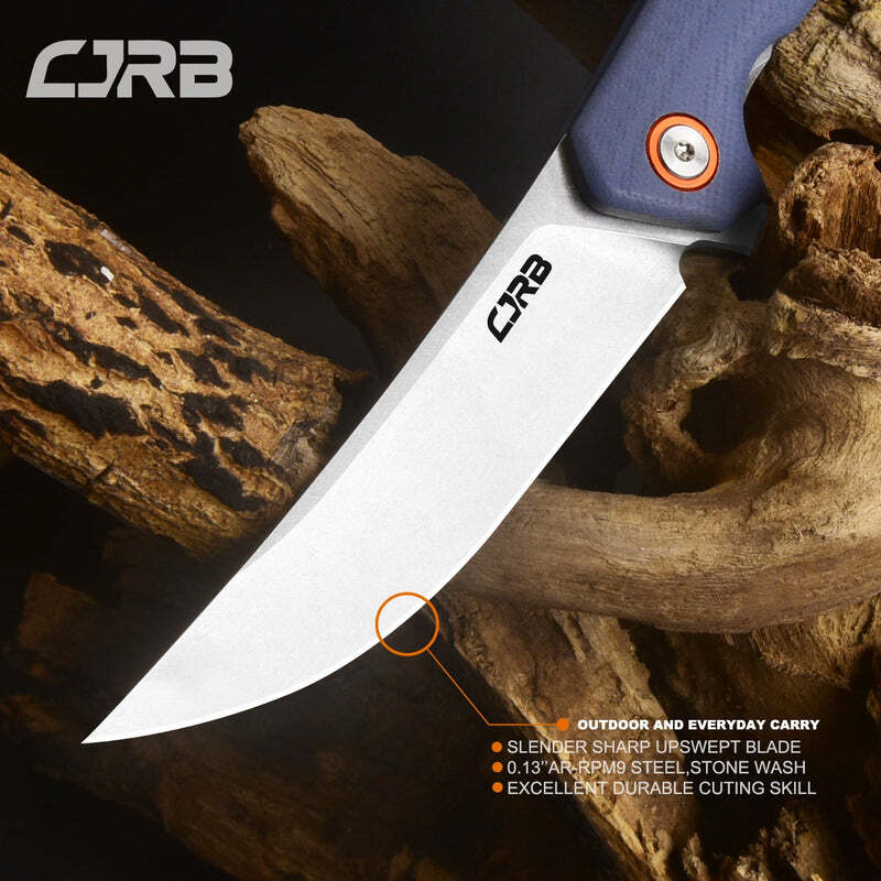 Folding Knife with Cjrb Gobi J1906 D2/AR-RPM9 Blade G10 Handle For all of your culinary needs, the Cjrb Gobi J1906 D2/AR-RPM9 Blade G10 Handle Folding Knife is a dependable and adaptable instrument. Important attributes: Stainless Steel Construction: This knife is made of premium stainless steel and is intended to last for many uses. Precision Cutting: This knife is an indispensable tool for a variety of culinary activities because it is ideal for precision cutting. Durability: This knife is perfect for camping, outdoor cooking, and other activities because it is made to resist regular use. Versatile Use: An essential tool for every kitchen, this knife may be used for a wide range of culinary tasks. The Cjrb Gobi J1906 D2/AR-RPM9 Blade G10 Handle Folding Knife is your go-to tool for accuracy and dependability whether you're cooking or going on outdoor excursions. The name of CRJB's folding pocket knife, the Gobi, comes from the immense desert that stretches across a large portion of the Chinese mainland. Traditional desert knives served as the model for this knife. Its trailing point blade and deep belly make it a great tool for precise cutting. The ergonomic curvature of the handle allows you to comfortably hold on for extended periods of time.Qualities: includes a 3.5-inch upswept-shaped stone-finished blade for accurate tasks like filleting fish or skinning small game. The blade is meticulously machined from D2 steel to help you maintain attention to detail, remarkable longevity, and corrosion resistance. The sharp blade is kept in position while in use by the straightforward liner lock mechanism, and opening and closing the blade is exceptionally smooth thanks to the ceramic ball bearing pivot assembly. The textured G10 handle makes it easier to hold, and the steel clip makes it easy to secure the knife to your pocket or belt. The knife measures 4.72 inches long when closed and 8.23 inches long when open.