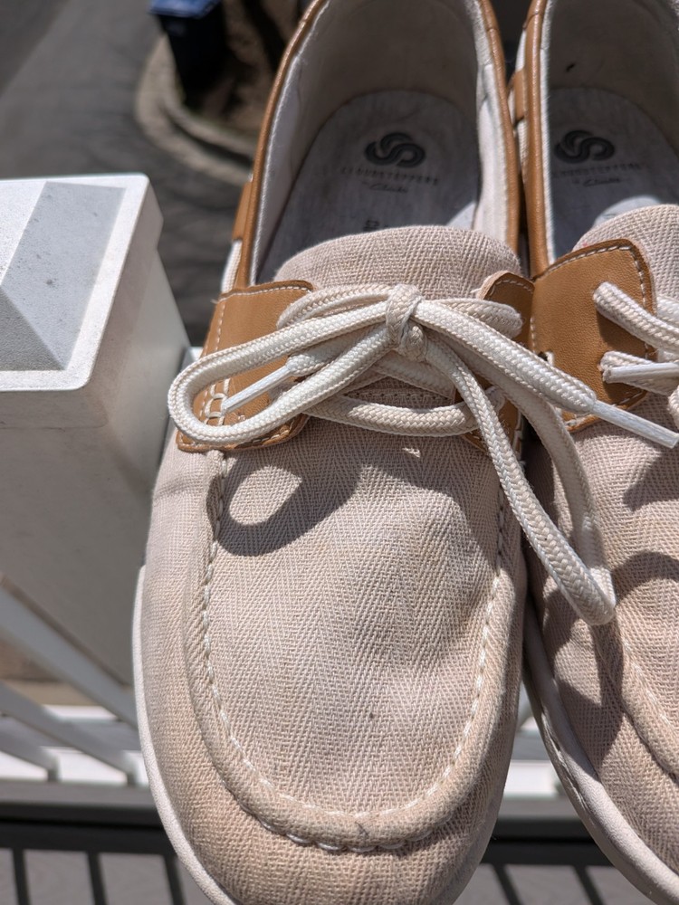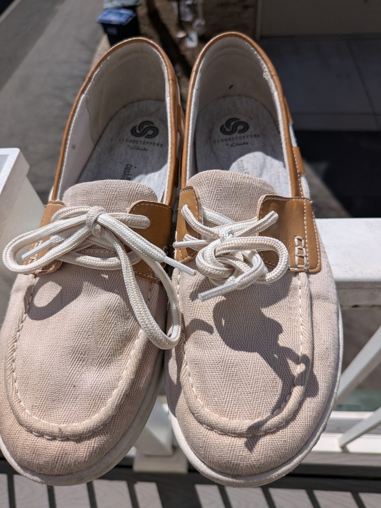 The CLARKS Cloud Steppers women's shoes in size 9 are a comfortable and stylish choice for women. These slip-on flats feature beige leather uppers and a flat sole, making them perfect for everyday wear. With the trusted Clarks brand and high-quality materials, these shoes offer both style and durability. Ideal for women looking for a versatile and practical footwear option.
