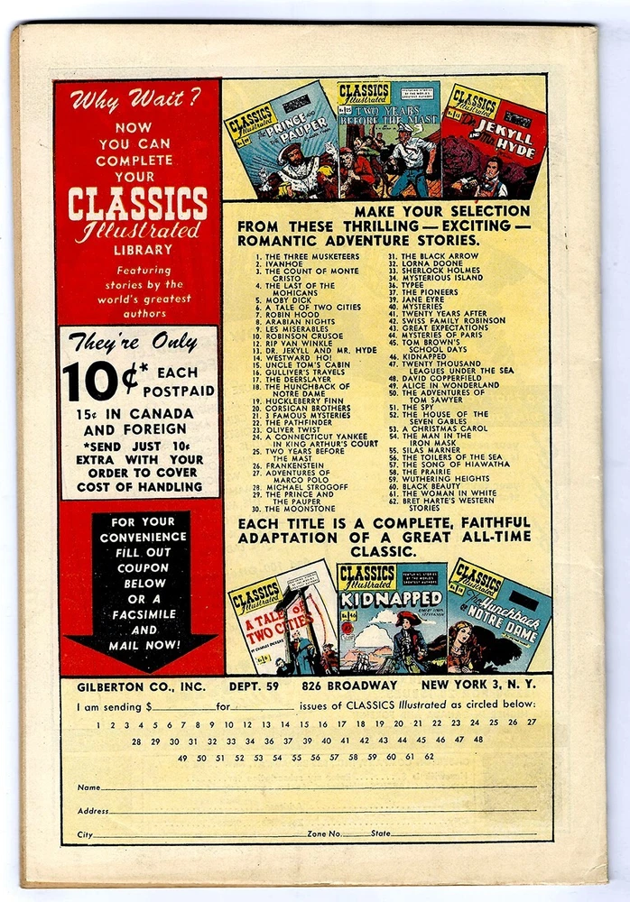 CLASSICS ILLUSTRATED #62 HRN 62 A Classics Illustrated comic. 1st edition. VF/VF- condition A well above average condition comic with a glossy cover and very nice eye appeal. Cover and centerfold are attached. Interior pages are complete and cream colored. (Please review all scans carefully). Please view carefully all pictures! Stored in a non smoker home.