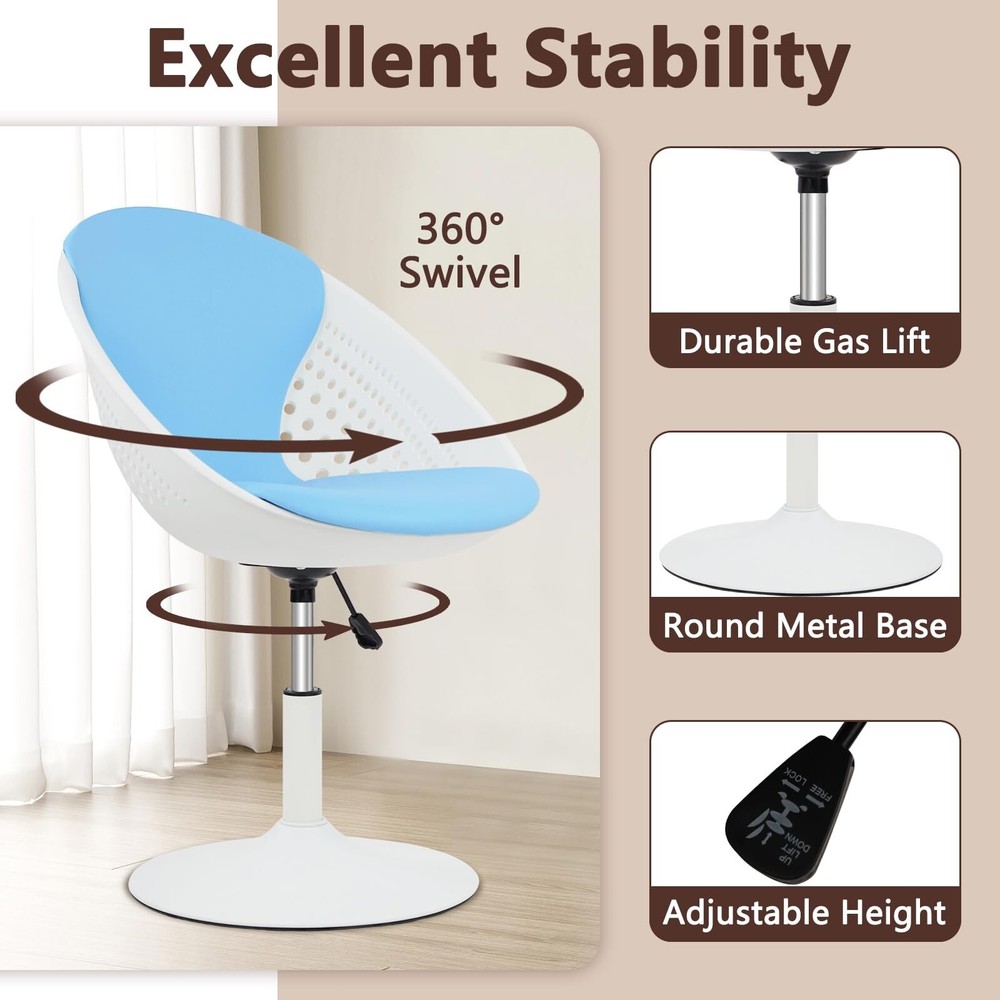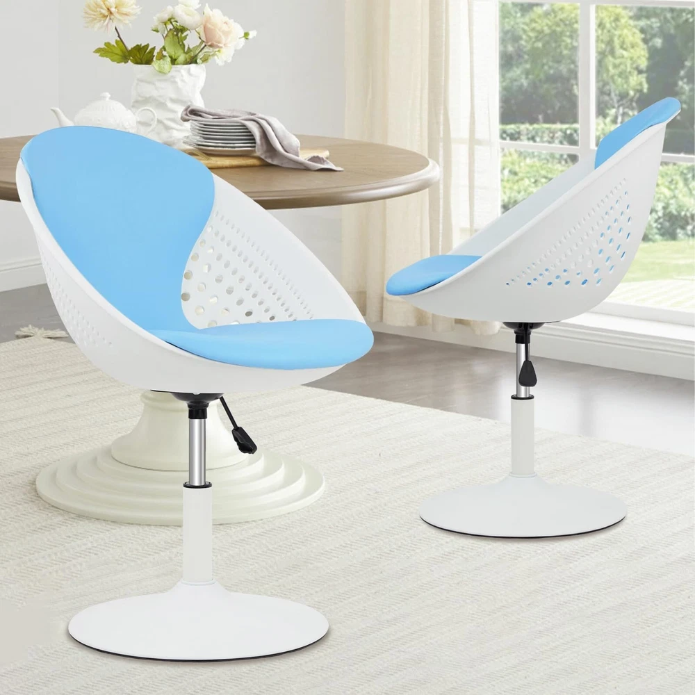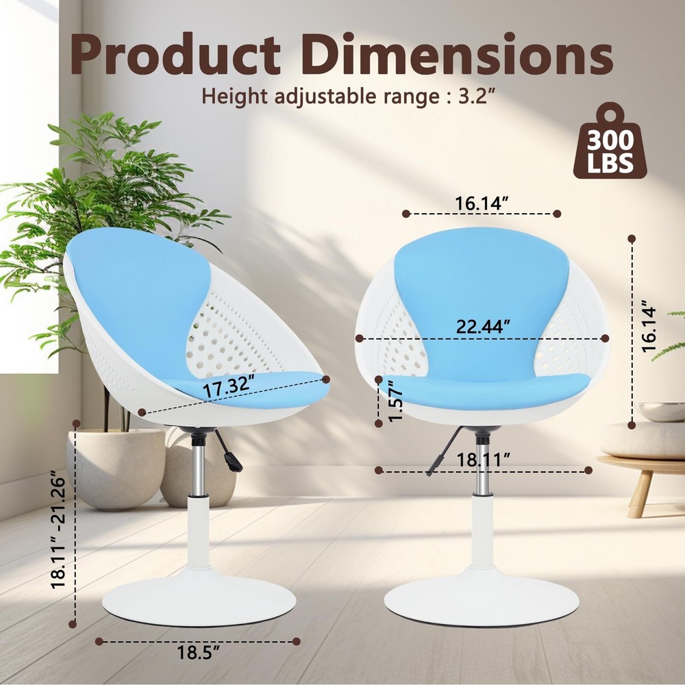 Product Description: CLATINA Adjustable Height 360° Swivel Waiting Chairs with Round Metal Base, Leather Comfy Cushion Egg-Shaped Lounge Side Chair for Guest Reception Living Balcony Dressing Dining, White, Set of 2 Specification: Brand: KLASIKA Color: Blue White Back: Continuous Back Material: Polypropylene , Metal Room Type: Office, Bedroom Indoor/Outdoor Usage:Indoor Product Dimensions: 17.32"D x 18.11"W x 34.25"H About this item : 【360° Swivel&Height Adjust】: Still looking for a height adjustable waiting chair? This CLATINA waiting room chairs provide flexible height adjustment and smooth 360° rotation to meet different user needs, whether in the office or at home. Sturdy&Durable】: Our swivel guest chairs feature a heavy duty round metal base and durable PP plastic frame. These reception chairs offer enhanced stability and support, making them ideal office chair no wheels for high-traffic areas. Built to last in busy environments. 【Comfortable&Breathable】: Our white and blue vanity chairs features a PVC leather cushion filled with high-density sponge. These leather waiting chairs have side ventilation holes for air circulation, ensuring comfort during extended use. Perfect for waiting rooms or workspaces where long-term seating is required. 【Versatile&Stylish】: Our lobby chairs blend modern design and comfort. These comfortable accent chairs feature a sleek wrap-around backrest and an egg-shaped seat that adds sophistication to any space. Perfect as a side chair in your living room or as a stylish office chair, they effortlessly match a variety of furniture styles. 【Easy&Comprehensive】: Our adjustable desk chair no wheels assembles easily, ideal for busy executives, reception rooms, offices, bedroom, clinics, business, dining, conference, balcony, libraries and remote workers. Perfect as lobby chairs, papasan chair or waiting room seating. A versatile solution for any environment.