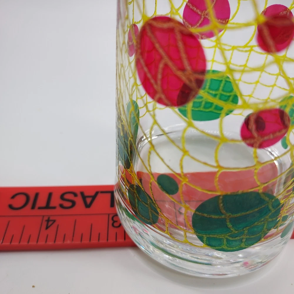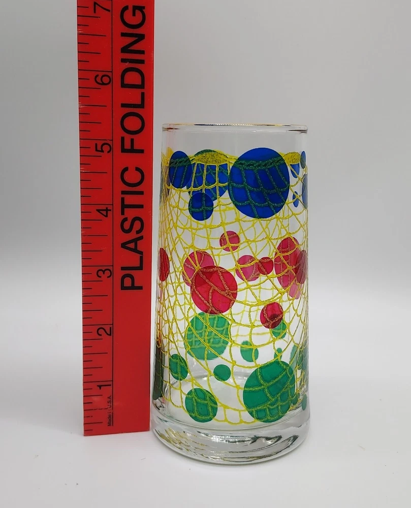 Add some vintage charm to your drinkware collection with this four-piece Bartlett Collins glass tumbler set. Each tapered glass stands 5-1/4 inches tall and has a 8 Oz capacity, perfect for all occasions. The mid-century modern style features a fun fish net dots theme in multicolor that adds a decorative touch to any table setting. Crafted in the 1950s using fused glass production technique, these original Bartlett Collins glasses are a piece of history. The elegant glass material and production style make them a unique addition to your barware collection. Embrace the vintage vibes and enjoy your favorite beverages in style with these beautiful glasses. Excellent condition