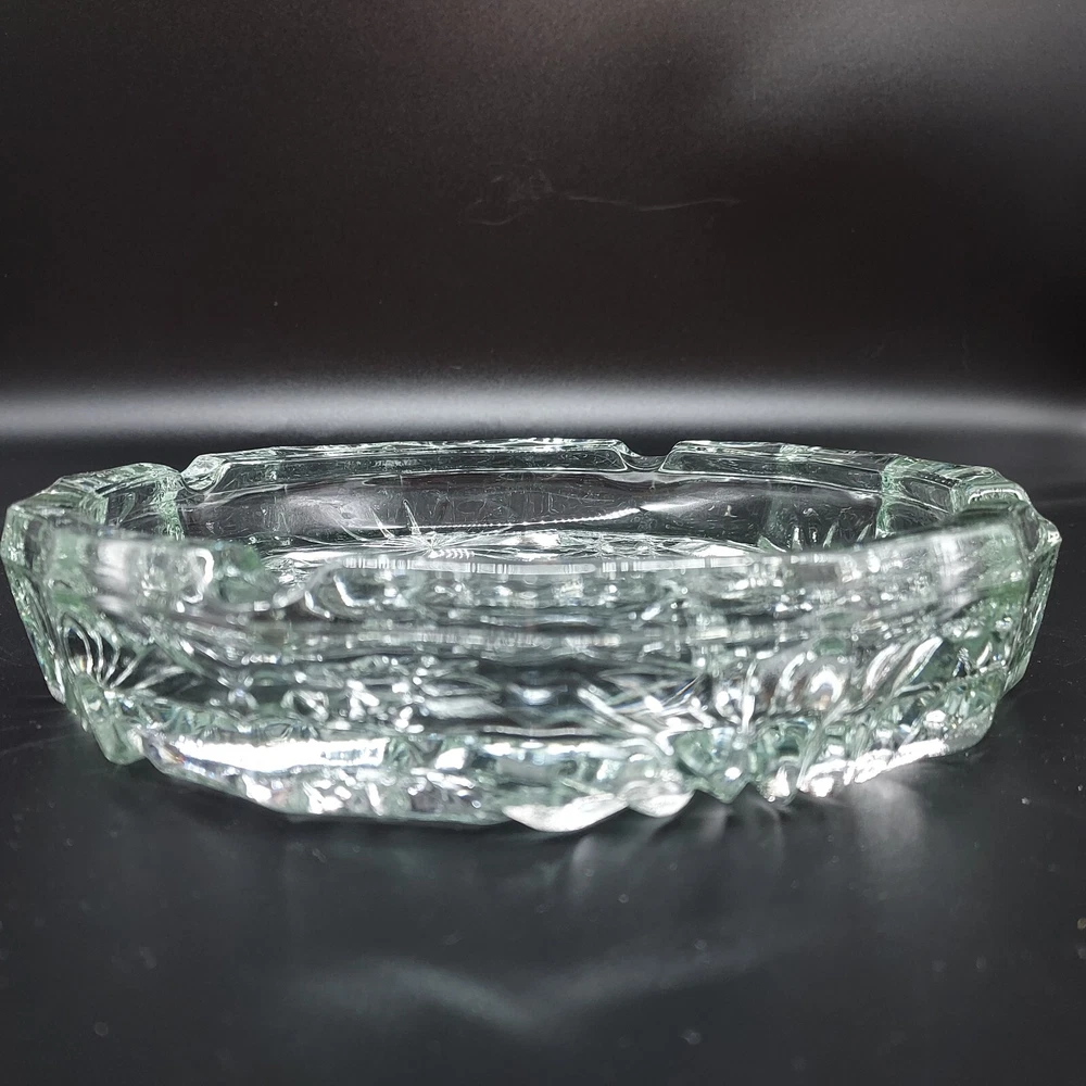 This vintage Anchor Hocking EAPC Prescut ashtray is a beautiful addition to any collection. With a diameter of 8 inches, this round ashtray features a stunning Star of David design and is made of clear glass with a glossy finish. The mid-century modern style and decorative features make it perfect for display or for use with cigarettes and cigars. The ashtray is an original piece from the 1960s and was manufactured in the United States using pressed glass production technique. It is part of the Early American Prescut/EAPC product line and is in mint condition. The ashtray is suitable for collectors and enthusiasts of vintage glassware and pottery.