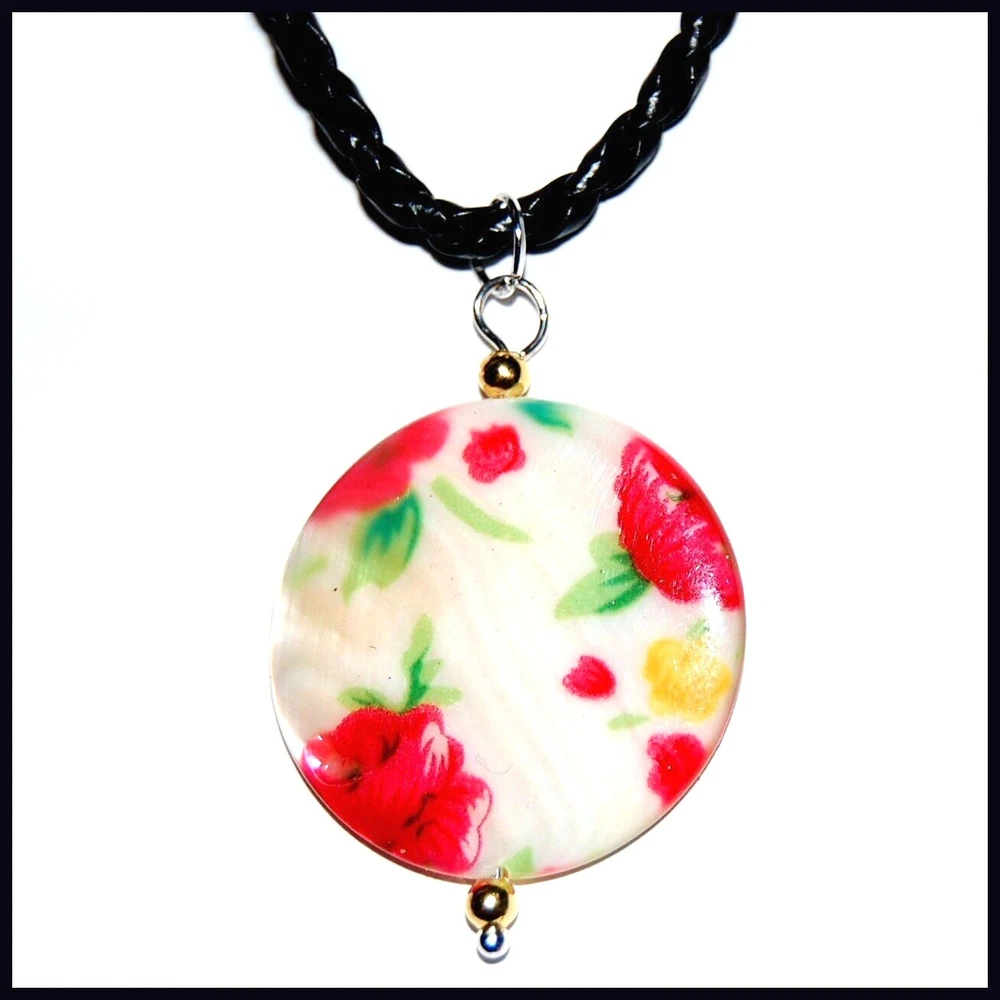 These beautiful shell pendants in colorful prints range in size from 3/4" to 1 1/8". They are displayed on 18" genuine leather braided cord (Black cord on all but Tan/Ivory Floral, and that one is brown) with lobster claw clasps. No two are exactly alike but yours will be very similar to those pictured. Sparkling crystals and gold plate or silver beads accent the shell bead pendants. Many of these have matching earrings or bracelets in my store. Pendant size - Red/yellow Rose - 1 1/8" Red Floral - 3/4" Black Floral - 1" Tan Floral - 1 1/8" MADE IN THE U S A ! Pendant A (Red & Yellow Roses) has a natural gold colored shell place on the back side. The front side is as shown. VISIT MY STORE for more great jewelry ~I combine shipping! REQUEST A TOTAL BEFORE PAYING so I can adjust your invoice. * This item is made in the U S A . Not intended for small children. From a clean, SMOKE FREE environment, shipped FAST!! ! ALPINE ADE DESIGNS ~ A trusted A m e r i c a n eBay seller for over 20 years <>< Thank you for buying from an A m e r i c a n small business owner! Thanks for looking!