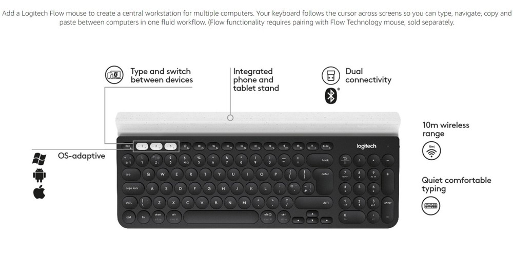 Logitech K780 (920-008041) Multi-Device Keyboard CORPORATE CLEARANCE LIMITED STOCK Brand New Sealed Logitech Stock RRP £89.99 On Logitech Website Limited Stock Fast Free Shipping About this item Multi-Device Productivity: Pair your wireless keyboard with up to 3 devices and switch between them with the touch of a button. Logitech Options let you customize keys, create hotkey shortcuts, and get notifications for device battery level, backlighting levels and more Slim Quiet Keyboard: The Logitech PerfectStroke key system provides precision and quiet typing, solidly designed with thin, laptop-like, carefully crafted concave keys and shortcuts Reliable Connectivity: Choose how you want to connect your device, whether via Bluetooth or Unifying receiver. This wireless keyboard has an integrated rubber cradle that carefully holds a variety of devices, from smartphones to a 12" iPad Pro, at a comfortable reading angle Adaptive Layout: Compatible with Windows, Mac, Android and Apple iOS, this Logitech wireless keyboard recognises the device it's connected to so all the keys and keyboard shortcuts are exactly where you expect them to be. Can be used with wired, wireless, Bluetooth or gaming mice The USB Dongle is located inside the battery compartment. In order to make the most of the K780 functionalities, it is recommended to install the Logitech Options software