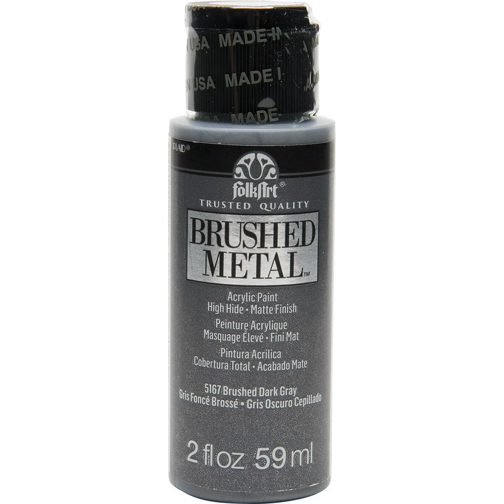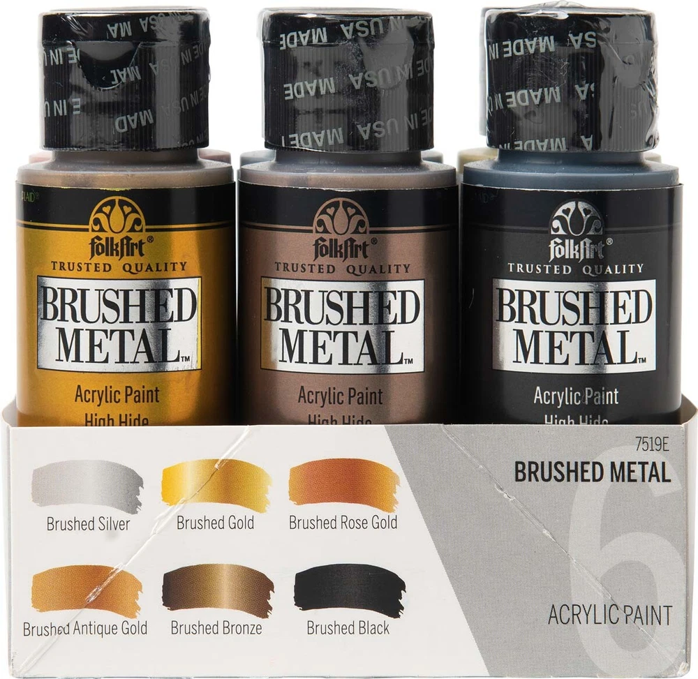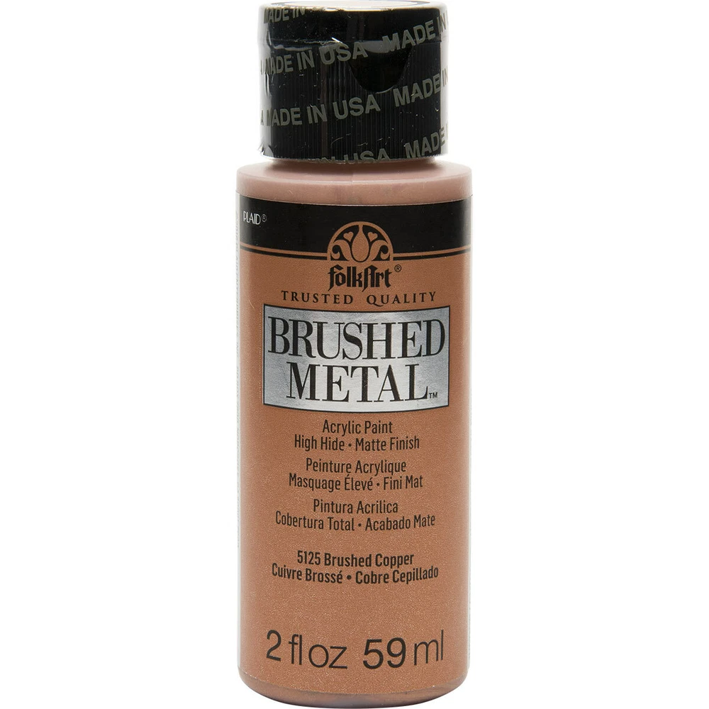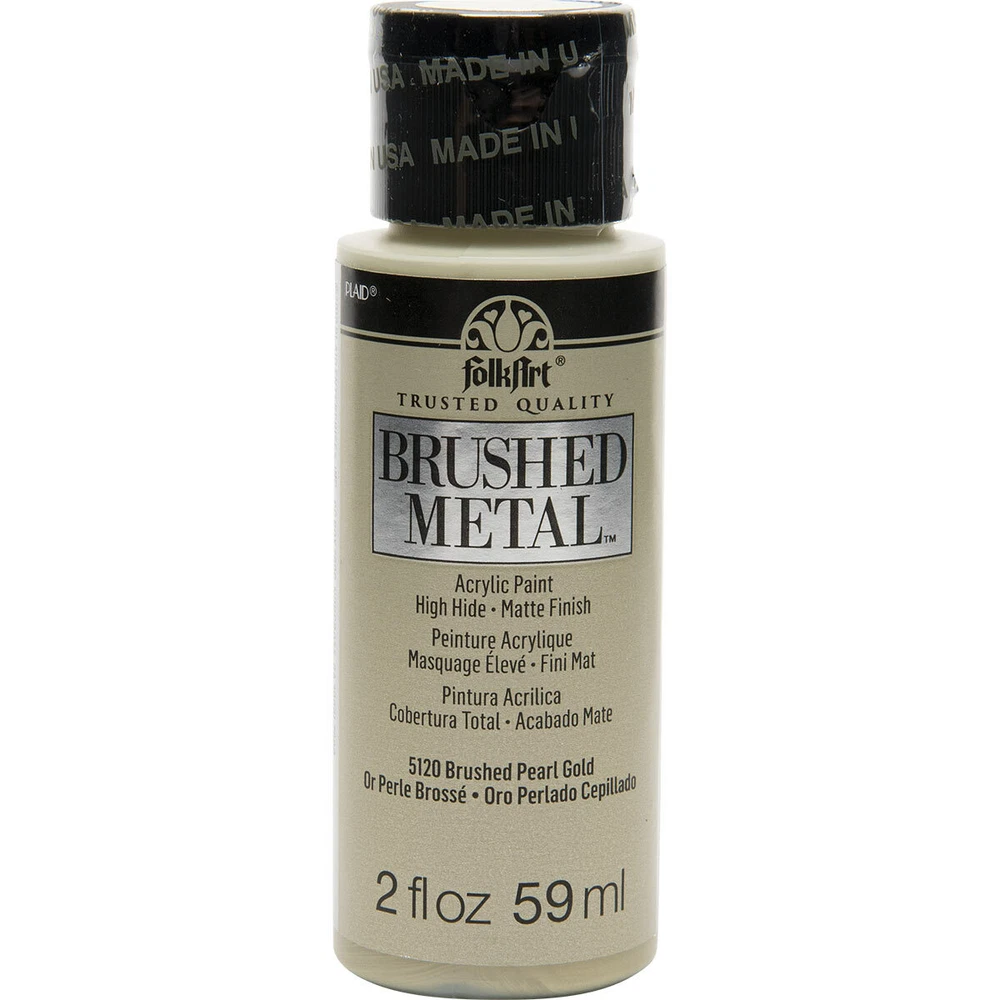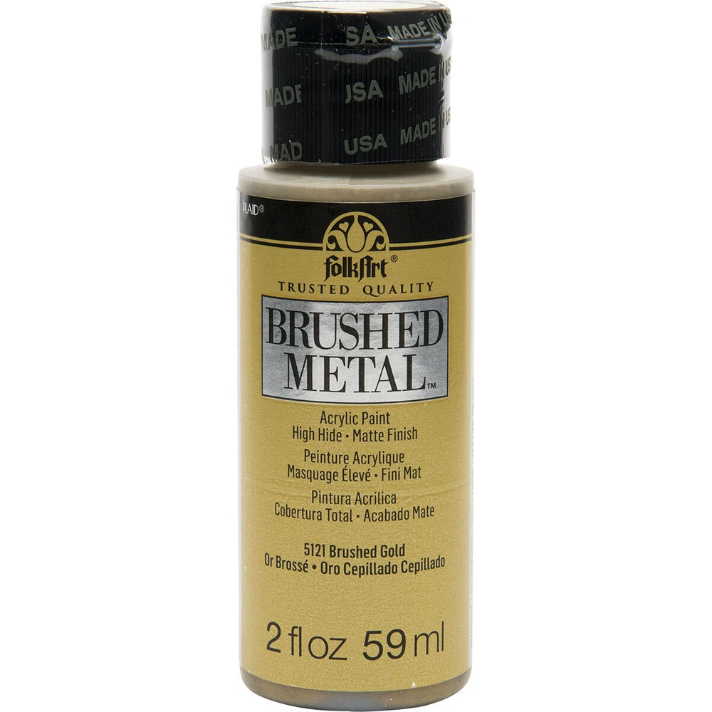 FolkArt Brushed Metal MATTE finish Give your next DIY craft project a brushed finish effect with FolkArt Brushed Metal Metallic Acrylic Paint! Thanks to an easy-to-use brush-on formula, Brushed Metal paints offer superior coverage and high hide. FolkArt Brushed Metal Metallic paints dry to a sophisticated matte finish and can be used on indoor and outdoor projects. Part of the artist-trusted FolkArt creative system of paints and finishes FolkArt Brushed Metal Metallic Acrylic Paint is made in the USA. 10 Colour Options: Brushed Silver 2oz 59ml Matte finish Brushed Gold 2oz 59ml Matte finish Brushed Antique Gold 2oz 59ml Matte finish Brushed Black 2oz 59ml Matte finish Brushed Bronze 2oz 59ml Matte finish Brushed Rose Gold 2oz 59ml Matte finish Brushed Dark Grey 2oz 59ml Matte finish Brushed Pearl Gold 2oz 59ml Matte finish Brushed Copper 2oz 59ml Matte finish Brushed Pale Silver 2oz 59ml Matte finish Q and A Does FolkArt Brushed Metal Acrylic Paint hold up well on outdoor surfaces? Absolutely. FolkArt Brushed Metal Acrylic Paint is formulated so that it can be used on interior surfaces as well as a permanent outdoor paint By the nature of the acrylic polymers used to make FolkArt Brushed Metal, it is weather resistant. FolkArt Brushed Metal Acrylic Paint dries to a brushed metal finish that reflects a soft polished effect. When properly cured to the surface, (approximately 48 hours), it is self-sealing and does not require a sealing topcoat. Give your next DIY project a brushed finish effect with the FolkArt Brushed Metal 6 piece Brushed Metal Paint Set . This set of 6 realistic metal colors has an easy-to-use, brush-on formula. FolkArt Brushed Metal Metallic paints offer superior coverage and dry to a sophisticated matte finish and can be used on indoor and outdoor projects. Part of the artist-trusted FolkArt creative system of paints and finishes, FolkArt Brushed Metal Metallic Acrylic Paint is made in the USA. Add this set of metal-like paints to your collection for a professional finish to your decor. Includes six (6) 2 fl oz bottles in Silver, Gold, Rose Gold, Black, Bronze, and Antique Gold Creates a matte, brushed metal finish Superior coverage Indoor/outdoor Water-based and non-toxic, made in the USA We would like to thankyou for taking time to view our listing