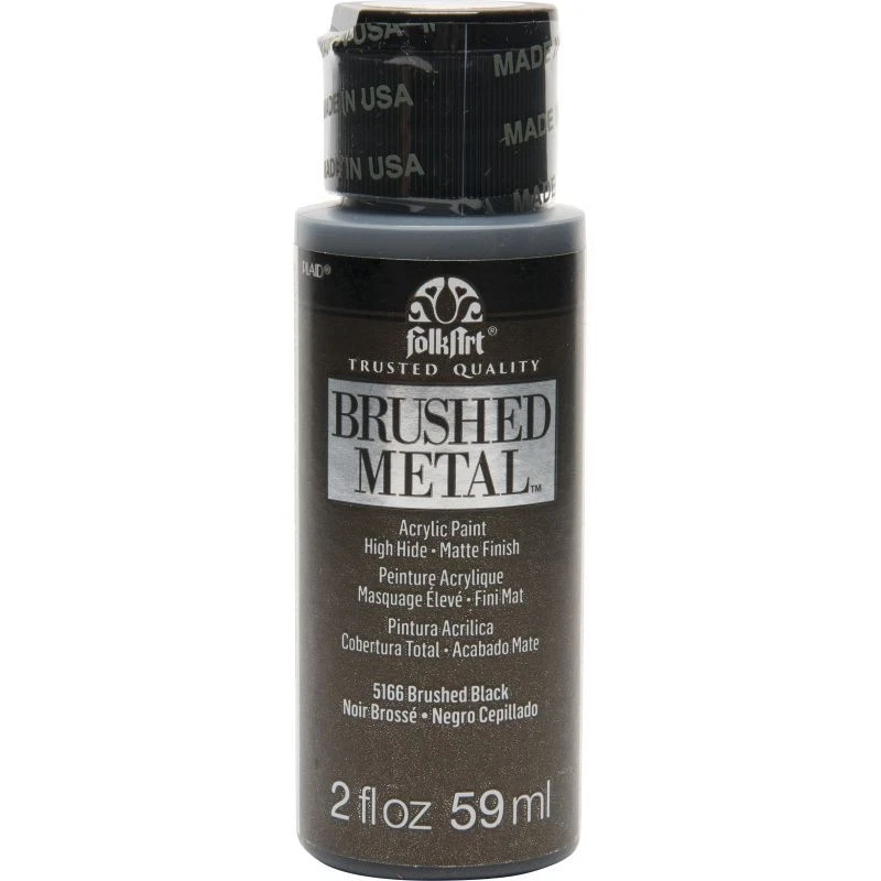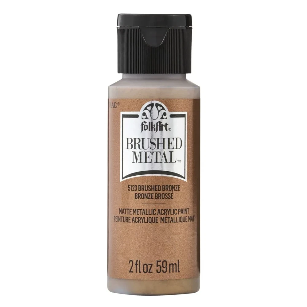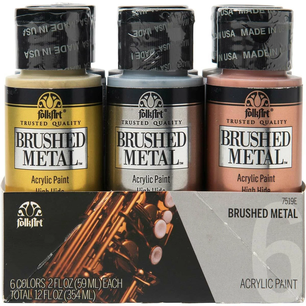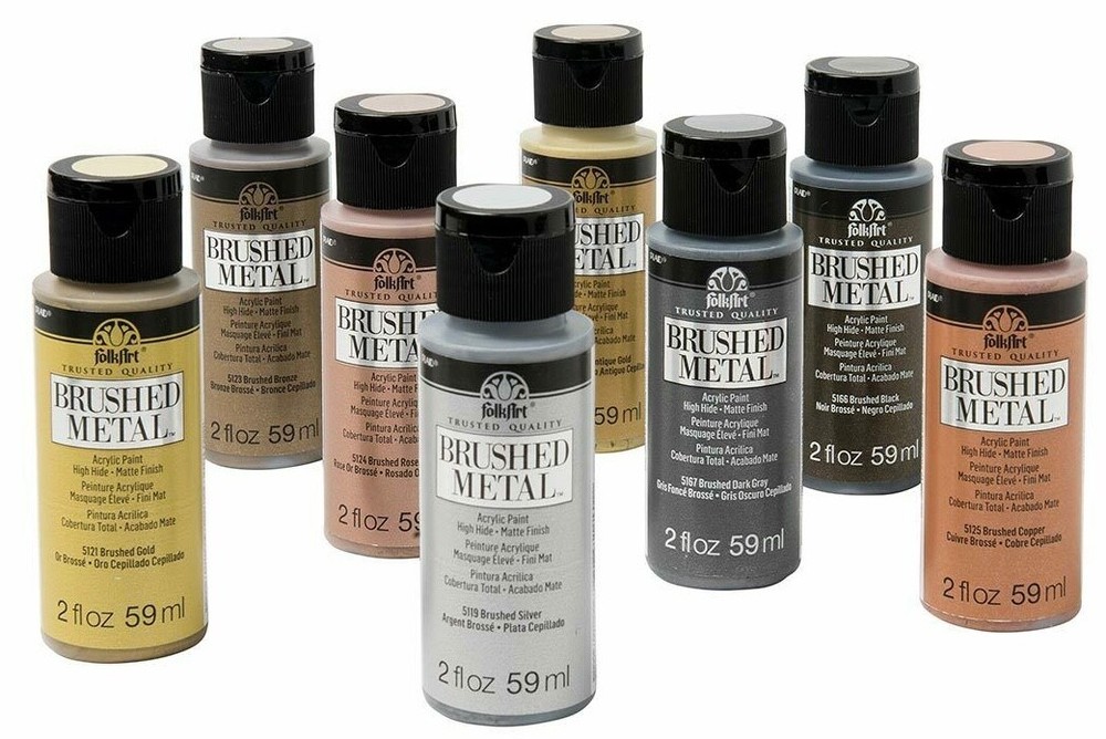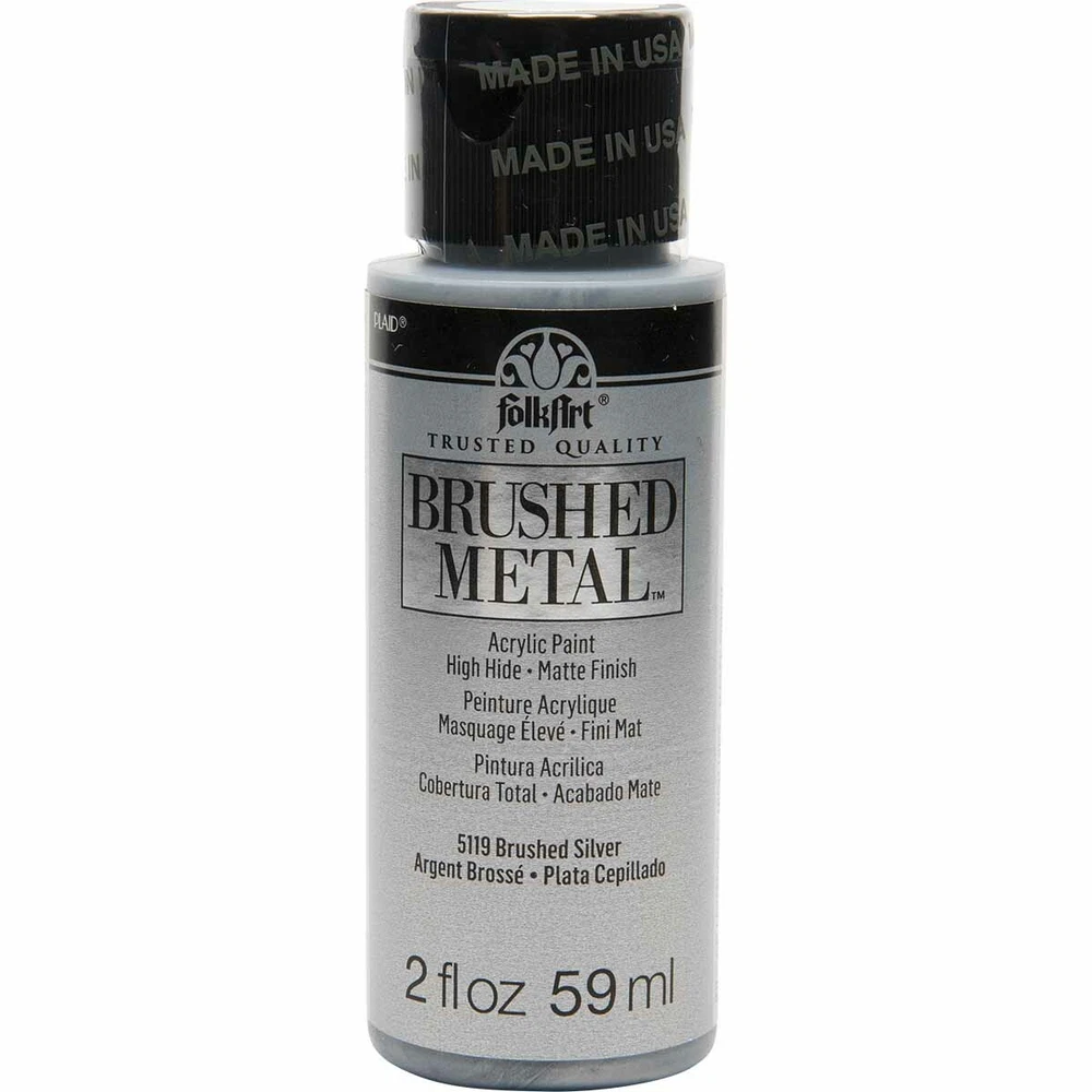 FolkArt Brushed Metal MATTE finish Give your next DIY craft project a brushed finish effect with FolkArt Brushed Metal Metallic Acrylic Paint! Thanks to an easy-to-use brush-on formula, Brushed Metal paints offer superior coverage and high hide. FolkArt Brushed Metal Metallic paints dry to a sophisticated matte finish and can be used on indoor and outdoor projects. Part of the artist-trusted FolkArt creative system of paints and finishes FolkArt Brushed Metal Metallic Acrylic Paint is made in the USA. 10 Colour Options: Brushed Silver 2oz 59ml Matte finish Brushed Gold 2oz 59ml Matte finish Brushed Antique Gold 2oz 59ml Matte finish Brushed Black 2oz 59ml Matte finish Brushed Bronze 2oz 59ml Matte finish Brushed Rose Gold 2oz 59ml Matte finish Brushed Dark Grey 2oz 59ml Matte finish Brushed Pearl Gold 2oz 59ml Matte finish Brushed Copper 2oz 59ml Matte finish Brushed Pale Silver 2oz 59ml Matte finish Q and A Does FolkArt Brushed Metal Acrylic Paint hold up well on outdoor surfaces? Absolutely. FolkArt Brushed Metal Acrylic Paint is formulated so that it can be used on interior surfaces as well as a permanent outdoor paint By the nature of the acrylic polymers used to make FolkArt Brushed Metal, it is weather resistant. FolkArt Brushed Metal Acrylic Paint dries to a brushed metal finish that reflects a soft polished effect. When properly cured to the surface, (approximately 48 hours), it is self-sealing and does not require a sealing topcoat. Give your next DIY project a brushed finish effect with the FolkArt Brushed Metal 6 piece Brushed Metal Paint Set . This set of 6 realistic metal colors has an easy-to-use, brush-on formula. FolkArt Brushed Metal Metallic paints offer superior coverage and dry to a sophisticated matte finish and can be used on indoor and outdoor projects. Part of the artist-trusted FolkArt creative system of paints and finishes, FolkArt Brushed Metal Metallic Acrylic Paint is made in the USA. Add this set of metal-like paints to your collection for a professional finish to your decor. Includes six (6) 2 fl oz bottles in Silver, Gold, Rose Gold, Black, Bronze, and Antique Gold Creates a matte, brushed metal finish Superior coverage Indoor/outdoor Water-based and non-toxic, made in the USA We would like to thankyou for taking time to view our listing