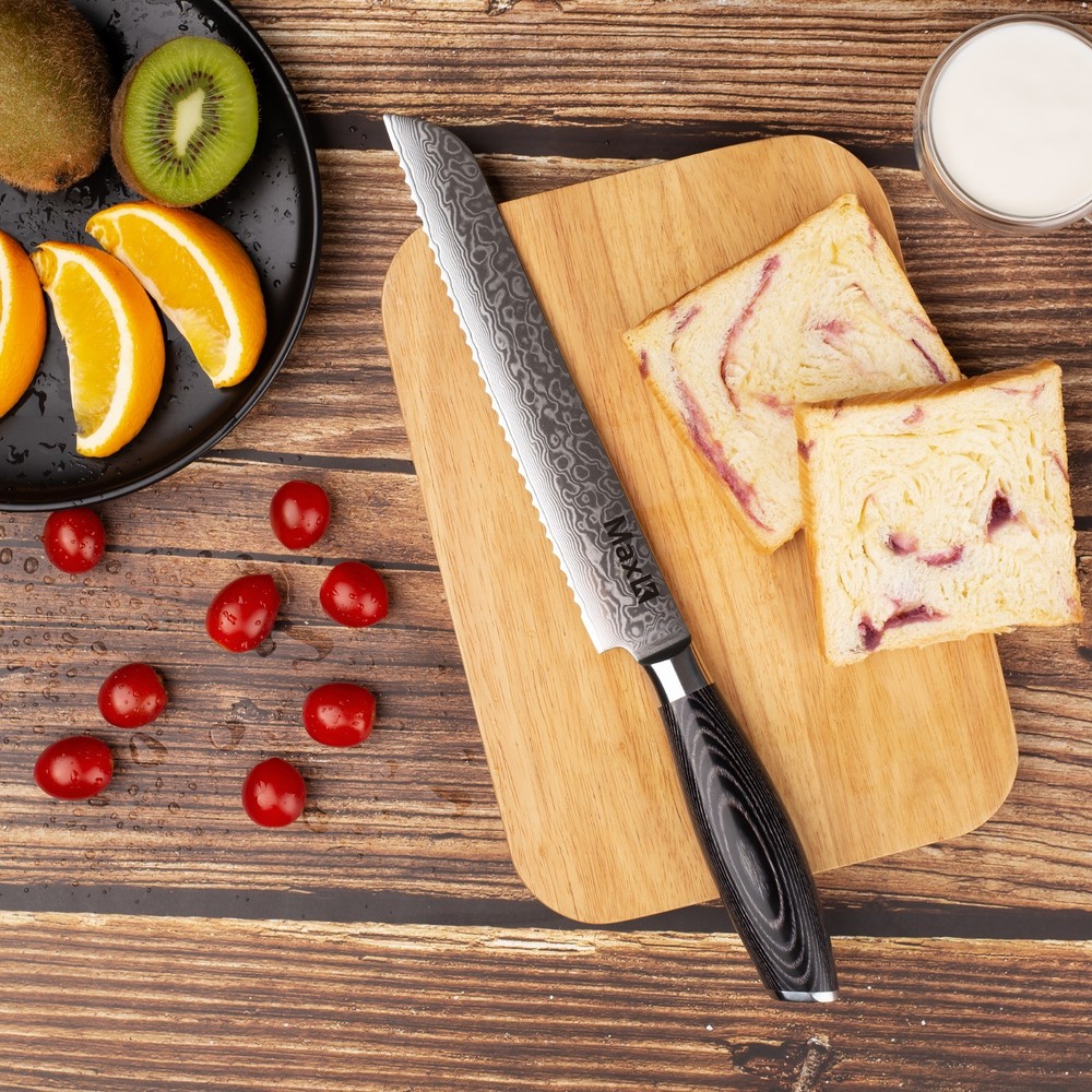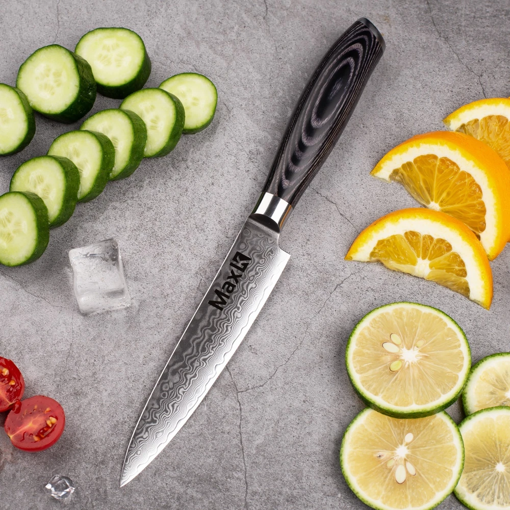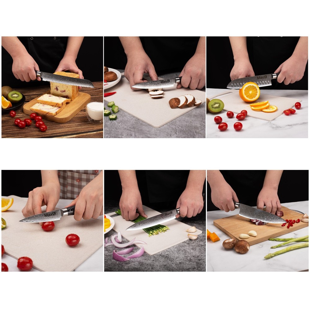 Max K 6 Pcs Knife Set with Pakka Handle & Bonus Knife Stand - Cutting Kitchen Utensil with Razor Sharp Blade and 67 Layers of Forged Steel - Slicing, Dicing, Chopping Meat, Vegetables, Fruit Product Details Blade Material: Alloy Steel Brand: Max K Color: Multicolor Handle Material: Alloy Steel Blade Edge: Plain, Serrated Blade Material: Alloy Steel Brand: Max K Color: Multicolor Handle Material: Alloy Steel Blade Edge: Plain, Serrated Construction Type: Forged Is Dishwasher Safe: Yes Number of Pieces: 6 UPC: 742833324532 Package Dimensions: 17.6 x 12.76 x 6.77 inches Item Weight: 8.69 pounds COOK LIKE A PRO - Every chef needs a trusty knife. Our handmade Damascus knife is balanced yet sharp and built to last. Prepping meat, fish, chicken, and vegetables has never been easier! BEAUTIFULLY CRAFTED BLADE - Our 67-layer knife is made with premium Damascus steel wrapped around a superior VG10 core. It has the right thickness that doesnt sacrifice any of its cutting power. EXCELLENT WEIGHT & GRIP - Handling our Damascus chef knife is easy, thanks to its ideal weight, dimensions, and full tang grip. It feels like an extension of your arm, making it comfortable to use. ENDURING SHARPNESS - We hand sharpened the blade and made sure that the sharpness lasts. Youll be finding this Damascus kitchen knife handy for long before you ever need to sharpen it again! SATISFACTION GUARANTEED - If by any chance this Damascus steel knife isn't up to your expectations, let us know and well handle it. Well facilitate your refund or replacement immediately. LIFE’S TOO SHORT TO ENDURE USING A DULL KNIFE. Every chef worth their salt would tell you that the most important thing in the kitchen is a reliable knife. It’s an extension of your arm that allows you to slice, chop, dice, julienne, or mince the ingredients you need for any dish. If these ingredients aren’t prepared right, it could affect the taste or texture of your food. So, if you want to make your home-cooked meals at par or even better than what you have outside, you’d want the perfect culinary tool at your disposal. And you won’t need to look far for it. The Max K 6 Pcs Knife Set with Pakka Handle is your perfect companion for slicing, dicing, and chopping! FAST FREE SHIPPING
