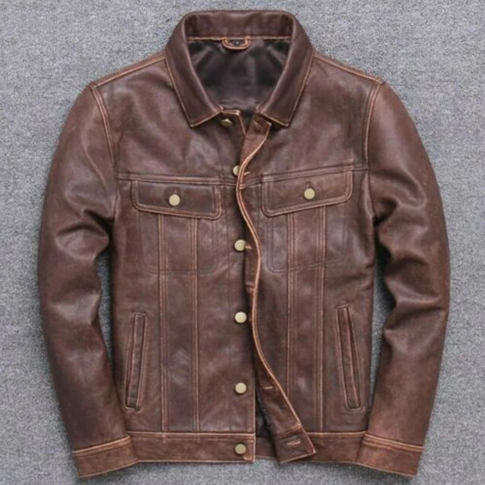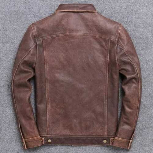 This Men's Vintage Distressed Brown Crackled Leather Trucker Jacket is made of real leather with a solid pattern and a mid-length design. The jacket features a button closure, suitable for casual occasions. It comes in sizes S-3XL and has a polyester lining and insulation, making it perfect for the winter, fall, and spring seasons. Handmade and with an 80s theme, this denim style jacket is a stylish and durable addition to any man's wardrobe. Please Note : The actual color of the product may vary slightly due to screen resolution, camera lights and such...