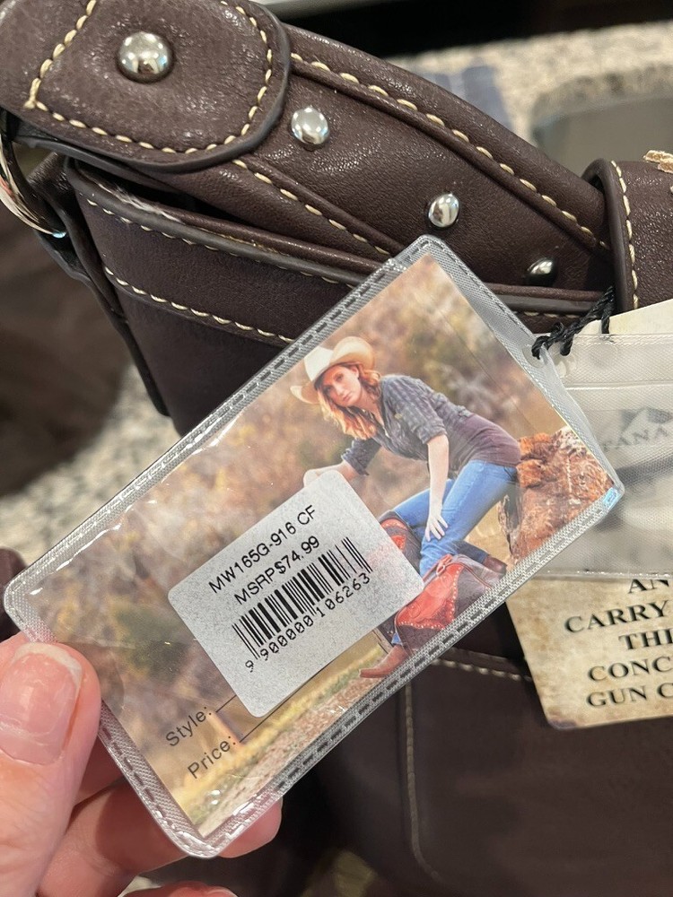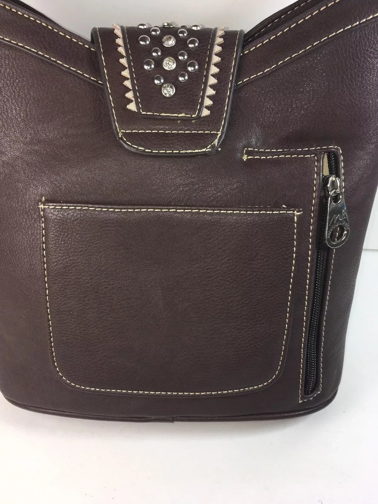 Accented with multi studs and rivets Top zipper closure Accented with sliver studs and crystals Inside single compartment divided by a medium zippered pocket Inside of bag include a zippered pocket and 2 open pockets A zippered pocket on the back to conceal the handgun (9.5"x 5") Single flat strap