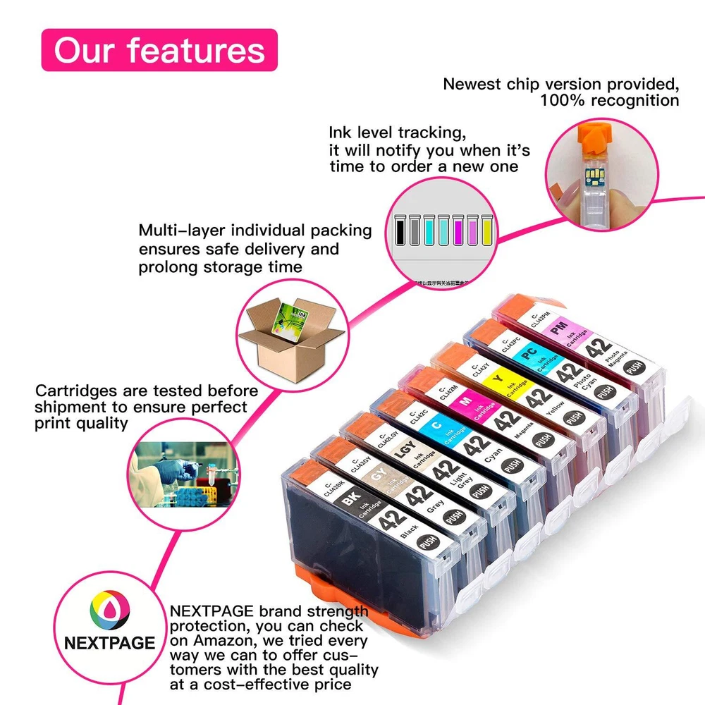 PRINTER COMPATIBILITIES PIXMA Pro-100/100S BRILLIANT PRINT QUALITY When you choose to use cartridges, you are getting a top quality ink at a fraction of the price. These cartridges are designed to give you printing results that are true to color, resistant to fading for years, smudging and bleeding. You can safely trust these ink cartridges to print important documents, true-to-life photos, vivid images, and laser quality text. PROMISE We believe in the quality of our products, and that is why we offer a 2 year no hassle warranty. If you are not fully satisfied with your ink cartridge purchase, return it to us for a 100% Money Back Guarantee. To ensure our consumers are receiving the best products on the market, we remanufactured our ink cartridges to meet or even exceed OEM specifications. PROTECTING THE FUTURE is a proud manufacturer of recycled ink cartridges. Not only does it help cut costs for consumers, it also decreases the amount of waste going into a landfill. Go Green. Package Contents: 3 x CLI 42 Light Gray Ink Cartridges (Canon compatible ink cartridges, NON-Original). Compatible Printer: 100% Compatible with Canon PIXMA Pro-100 printers, PIXMA Pro-100S printers. Please check the compatible printer model before placing order. Page Yield & Ink Volume: Each Compatible Canon CLI42 LGY Ink Cartridges (14ml) prints approximately 835 pages (Letter/A4, at 5% coverage); As a third party seller, we are incentivized to fill our cartridges to the brim to compete with original manufacturers. Reduce your expenditures to preserve your fortune. Featuring Monitor Chip: Our Compatible Canon Pro 100 Ink Cartridges come equipped with a monitor chip that tracks ink levels and provides proactive reminders for timely cartridge replacement. ChromaLife 100+: Premium Quality: PIXMA Pro 100 Ink are manufactured in an ISO9001 & ISO14001 certified facility. Each cartridge is fully tested prior to leaving the factory.he combination of inks & media deliver exceptional beauty and longevity. Reliable Customer Support: For any our CLI-42 Ink Cartridges related concerns within the two-year duration, please don't hesitate to contact us by Amazon. All emails will be responded within 24 hours. Our team is here to provide prompt assistance and address your needs.