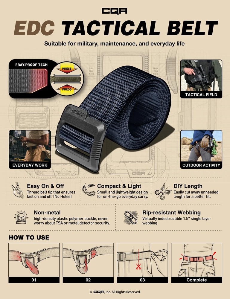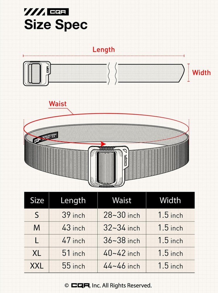 Tactical Belt Series designed for law enforcement, military, and outdoor activities. [Metarial] The Polyester fabric is rip-resistant and lightweight to allow on-the-go everyday carry. [Plastic Buckle] High-density non-metal buckle does not need to worry about metal detector security. [DIY Length] It is easy to customize the length for making a perfect fit for yourself. It is suitable for tactical training, hunting, camping, maintenance, and everyday life. *Please see below for Size Chart