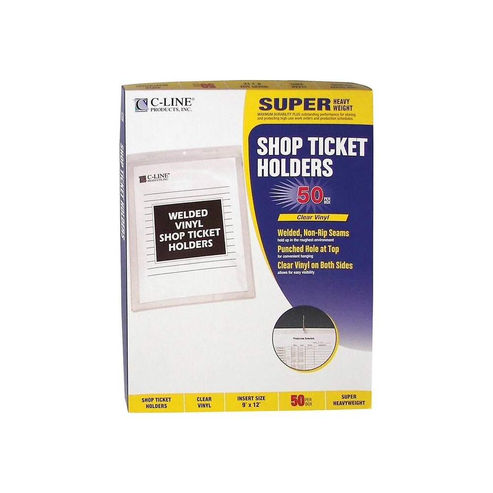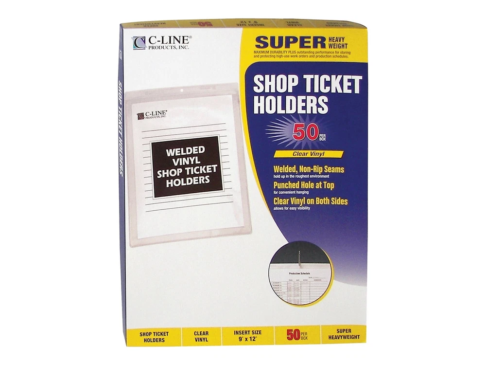 Post signs, work orders, or other reference information with these C-Line clear 9 x 12-inch vinyl job ticket holders. Attach repair orders, warranty information, or other notices to inventory with these job ticket holders. Welded seams prevent rips and tears, while the vinyl construction stands up to frequent handling. The clear construction keeps documents visible from both sides, so you can quickly reference notes or memos. These C-Line job ticket holders come with hole-punch tops for easy hanging. • Job ticket holder is perfect for storing and protecting work orders, production schedules, inventory cards, restaurant menus, and more... eBay STORE ABOUT US SAVE SELLER CONTACT US C-Line Clear Vinyl Shop Ticket Holder Both Sides Clear 50" 9 x 12 50/BX 80912 - Sold as 50/Box Post signs, work orders, or other reference information with these C-Line clear 9 x 12-inch vinyl job ticket holders. Attach repair orders, warranty information, or other notices to inventory with these job ticket holders. Welded seams prevent rips and tears, while the vinyl construction stands up to frequent handling. The clear construction keeps documents visible from both sides, so you can quickly reference notes or memos. These C-Line job ticket holders come with hole-punch tops for easy hanging. • Job ticket holder is perfect for storing and protecting work orders, production schedules, inventory cards, restaurant menus, and more. • Clear vinyl construction provides easy viewing from both sides. • Insert size: 9"W x 12"L; holds up to 50 sheets. • 50 job ticket holders per box. • Welded, heavyweight graded job ticket holder with short-side load orientation and convenient eyelet at top for hanging. • 7.5 mil. Welded vinyl shop ticket holder is great for 2-sided documents because both sides of holder are clear!. • Sold as 50/Box. You may be interested in our other listings on eBay.