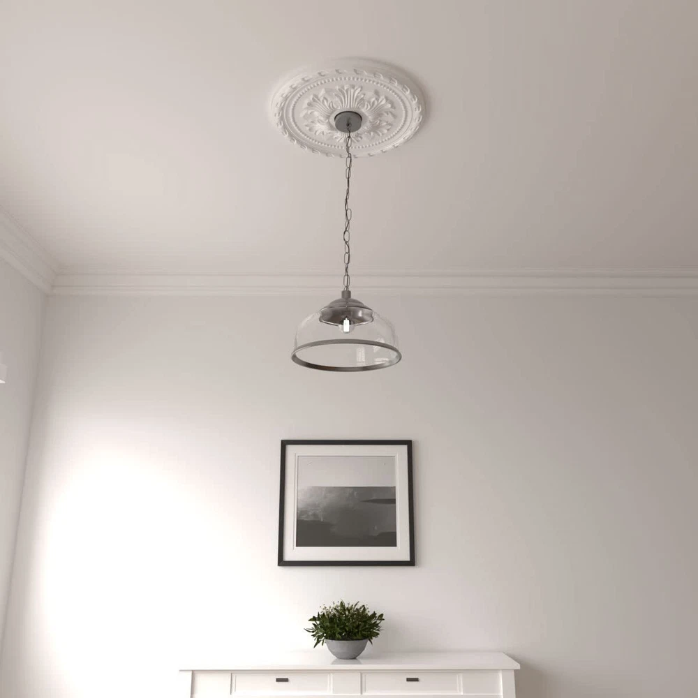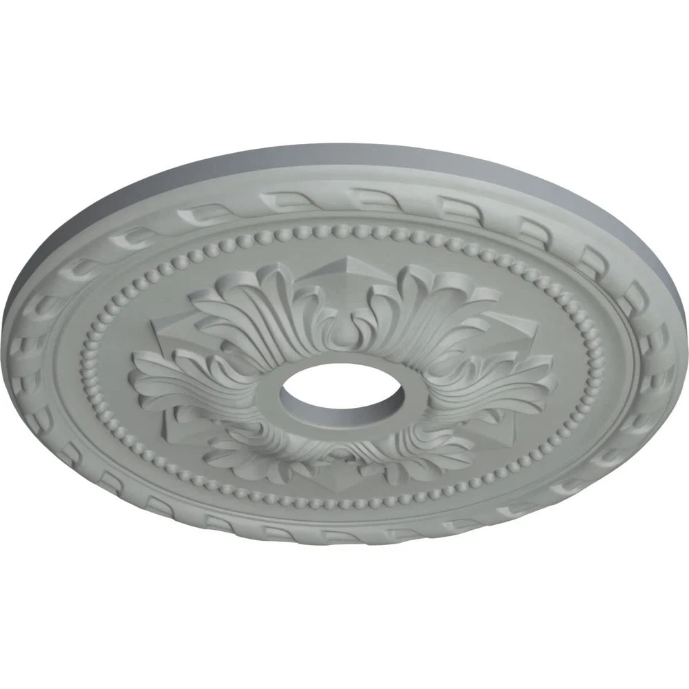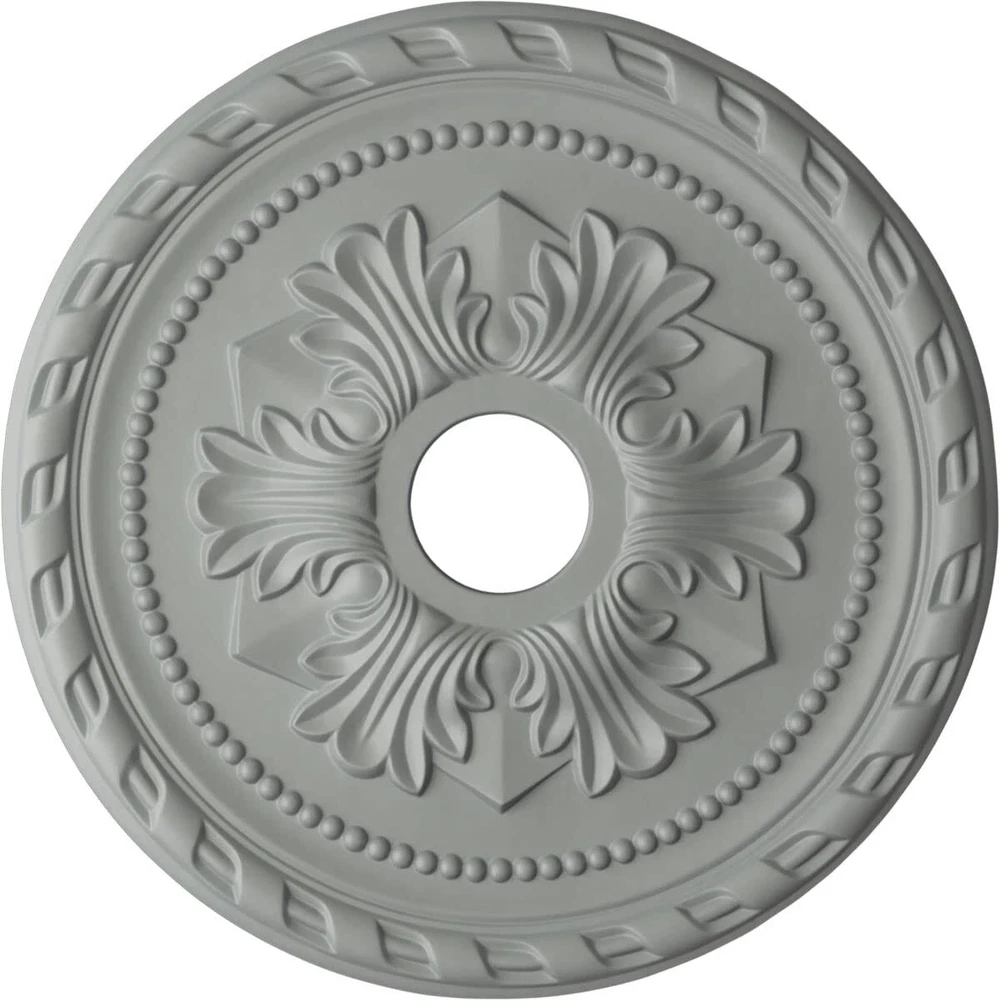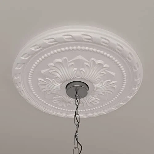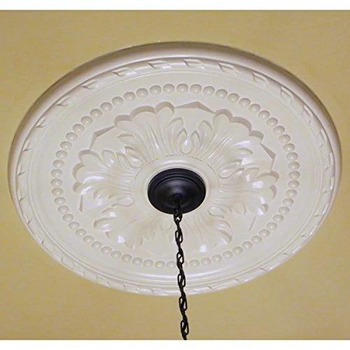 Our sturdy medallions are made of the highest quality material, for a fraction of the cost of traditional plaster or wood. Our green, environmentally friendly material can be painted, stained, marbleized or faux finished making it ideal for a variety of interior and exterior applications. Easy installation using common woodworking tools and adhesive, provides a dramatic change with instant elegance and personality. Add luxury and attractiveness to an average ceiling fan, uninspiring light fixture, or get creative by mounting them on the wall for an innovative look. We offer -piece ceiling medallions for ease of installation and abstract design options as well. With more than 400 styles to choose from and simple installation we are sure to have the perfect medallion to inspire a new project for the designer in you. Dimensions: 20-7/8 in. Outside Diameter x 3-5/8 in. Inside Diameter x 1-5/8 in. Projection x 5 in. Canopy Lightweight for quick and easy installation Exquisite detail with huge collection of exclusive designs Can be cut, drilled, glued or screwed with common tools. Factory primed and ready for paint or faux finish Add a high-end upgrade inexpensively. Instant renovation with minimal time and effort