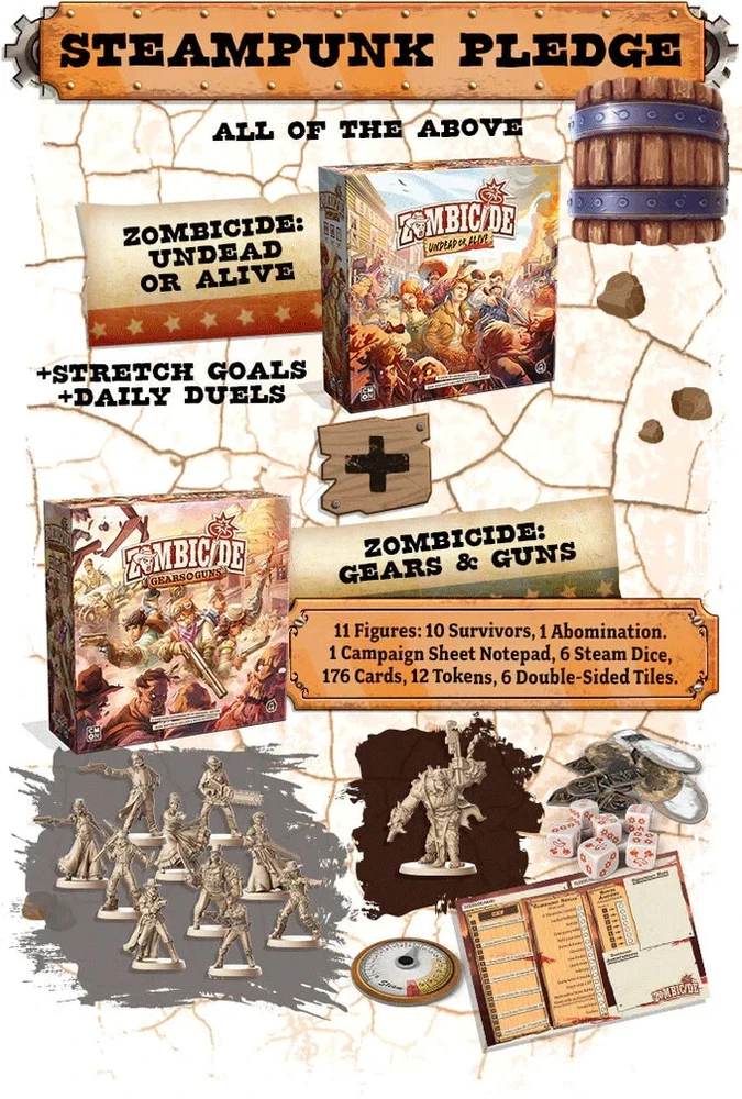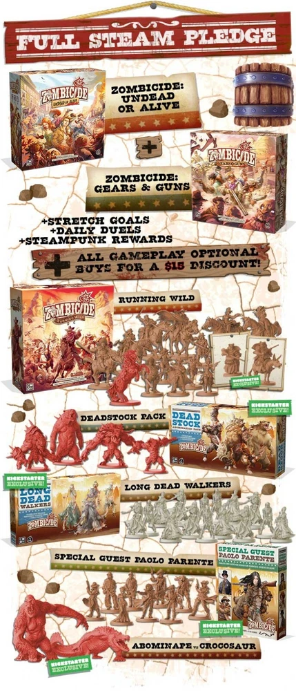 Kickstarter Exclusive Zombicide: Undead Or Alive "Full Steam Pledge" Board Game Bundle by CMON. Includes Core Board Game, KS Exclusive Billy the Kid Survivor, Gears and Guns Campaign Expansion, Running Wild Expansion, Deadstock Abomination Pack, Long Dead Walkers, Special Guest: Paolo Parente, Abominape vs Crocosaur, Steampunk Rewards, Daily Duels, and all unlocked stretch goals (combined in stretch goal box). Please note: unless otherwise stated paid add ons from the Kickstarter Campaign are not included. The Full Steam Pledge contains all of the gameplay expansions in this campaign. This includes: Zombicide: Undead or Alive Core Box Zombicide: Gears & Guns Campaign Expansion Running Wild Deadstock Pack Long Dead Walkers Special Guest: Paolo Parente Abominape vs Crocosaur ALL unlocked Stretch Goals, including those that are exclusive to the Steampunk Pledge. All Daily Duel figures