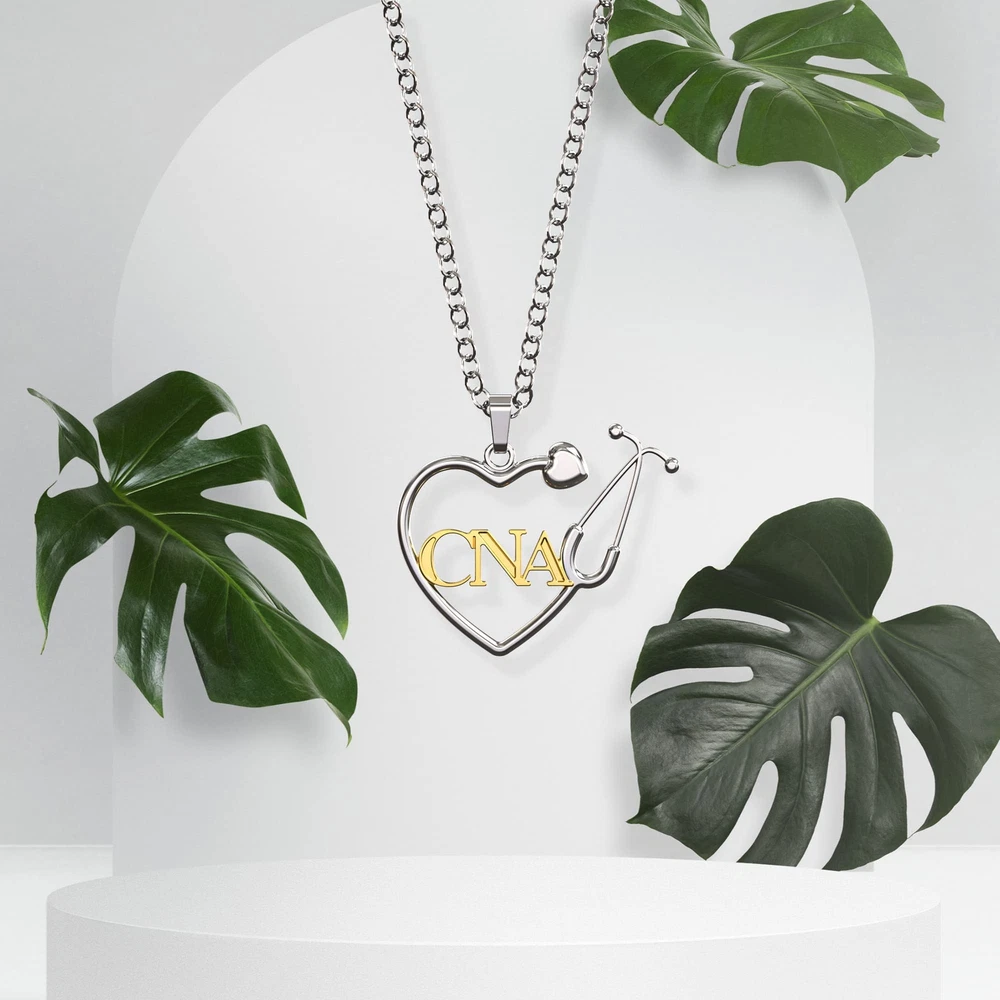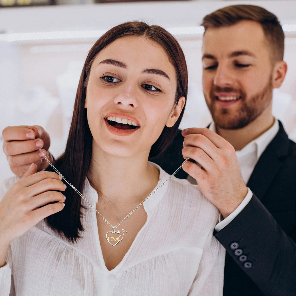 Description This unique pendant design makes a great gift for any nurse. The end of the stethoscope has a cute little heart. This necklace comes in a nice black velvet bag for storage and presentation. This necklace is silver plated but it is not suggested that you wear it in the bath or while working out. Cleaning; Just wipe with a soft cloth. 18k Sterling Silver Plated Alloy Pendant Strong necklace if breaking occurs within three years we offer free replacement. Chain Length:457mm (18"), Pendant dimensions: 25.4mm x 20mm Packing: Nice Black Velvet Bag with Logo Perfect nurse gift for any registered nurse in the medical profession. Expressing love to sweethearts, spouses or friends. Beautiful Heart Shaped Stethoscope Necklace with "RN" Registered Nurse letters. This is a wonderful gift for a nurse. This necklace honors their achievements and can be given as a nursing school graduation gift. This stylish necklace features a lovely heart shaped stethoscope that makes a personal, close gift for any loved one.