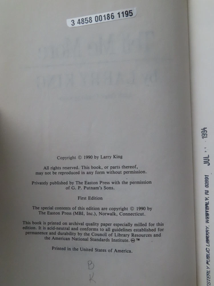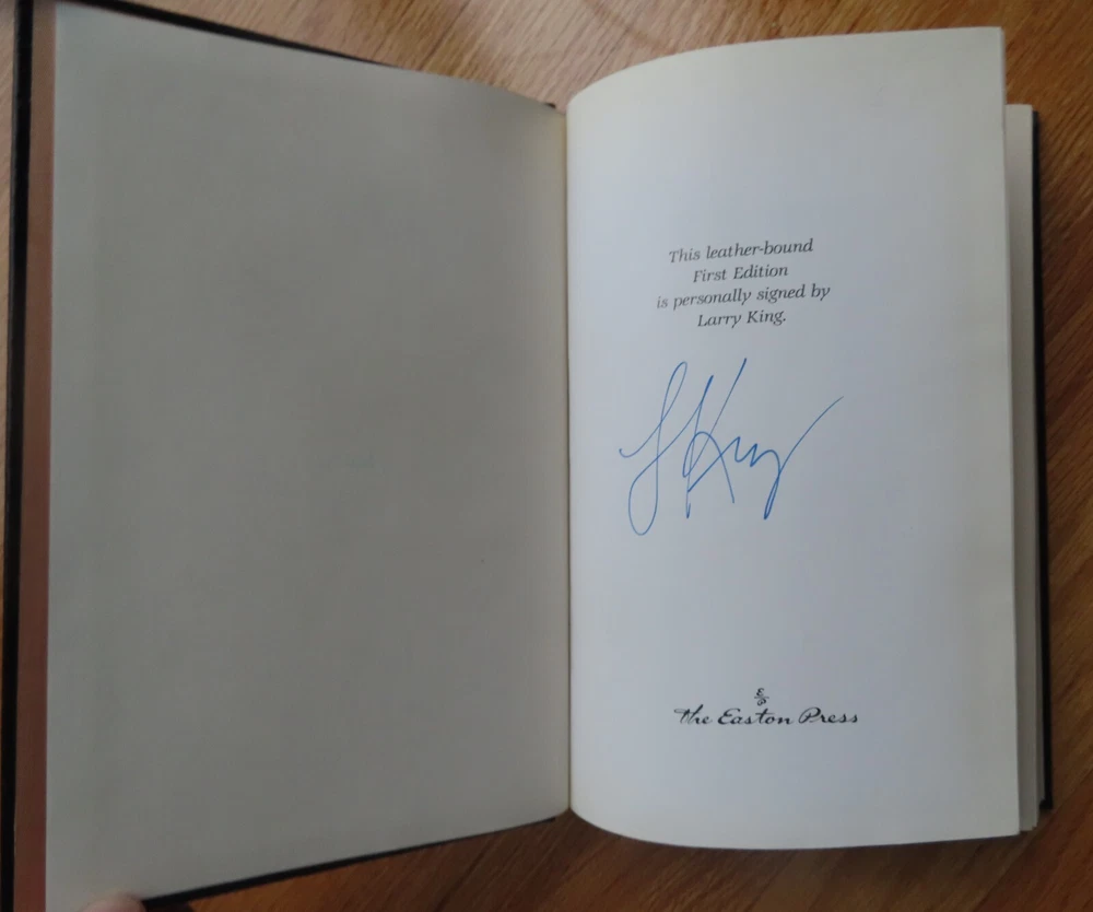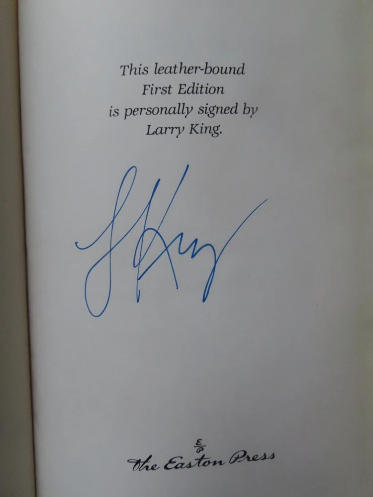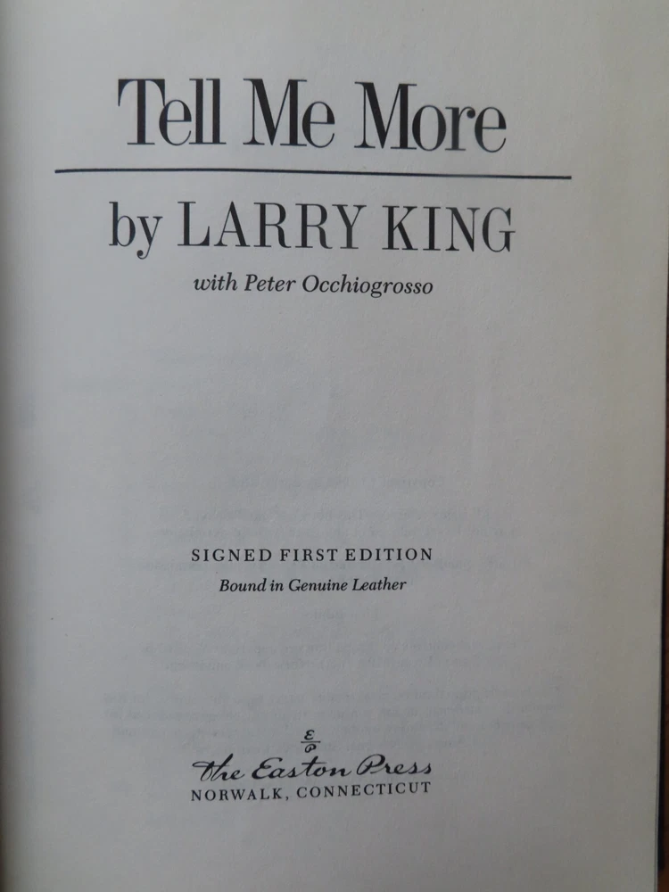 Ex-Library Book (See Photos) CNN LARRY KING signed TELL ME MORE 1990 Eastern Press 1st Edition Hard Cover Book with Dust Jacket in Excellent Condition. All Autographs obtained in person through Show Signings, Before at Sporting Event, Golf Tournaments and Special Dinner & Charity Events. Comes with My Certificate of Authenticity (COA) from Glenn's Stadium Heroes. SEE More POLITICAL Memorabilia and Other SPORTS MEMORABILIA in My EBAY STORE. Click on EBAY STORES Logo after my USER ID to see my OTHER SPORTS MEMORABILIA AUCTIONS Specializing in BOSTON SPORTS sorted by Sport Categories!