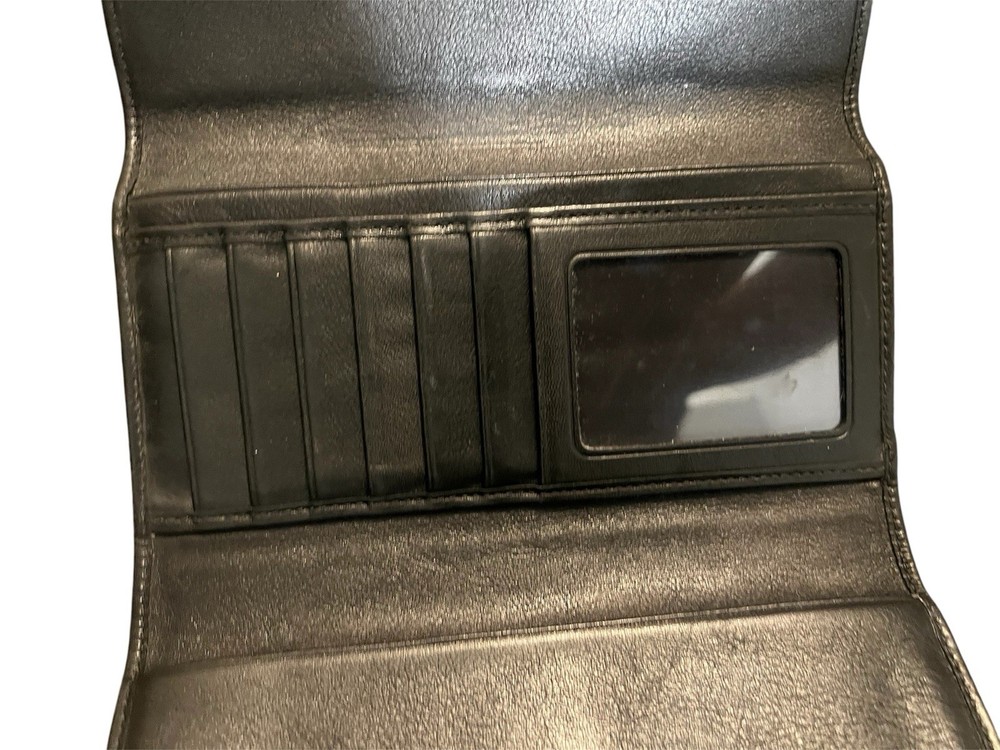 Experience the blend of sophistication and functionality with this COACH Black Leather Wallet. A versatile accessory designed to keep your essentials organized, this trifold wallet folds smoothly, revealing a neat arrangement of credit card slots, a coin compartment, a pen holder, an ID card window, and a checkbook area. Accented with a sleek zipper detail, the wallet's checkered pattern exudes a timeless elegance. Crafted from premium leather, the wallet measures 8 inches in length and 4.5 inches in width, making it an ideal size for everyday use without being bulky. Its classic black color ensures it matches any outfit, making it a must-have for those who appreciate both style and practicality in their accessories.