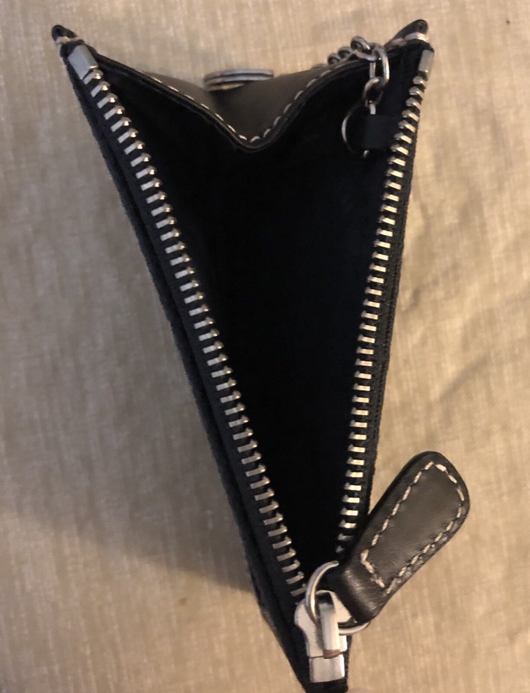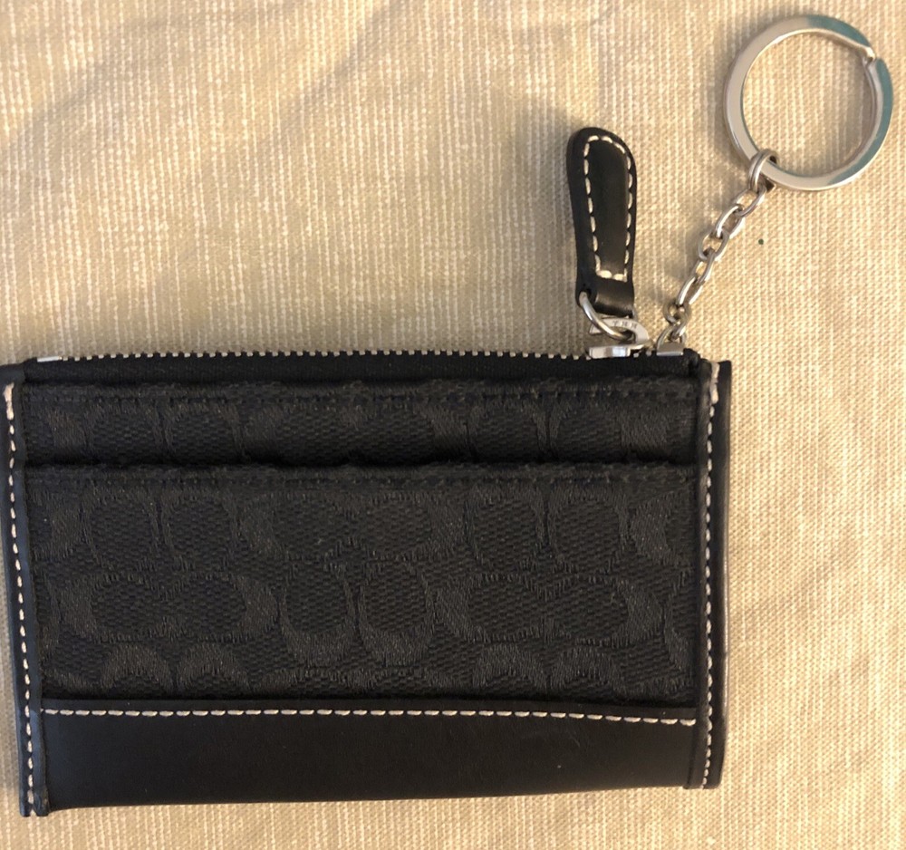 This is a small black pouch wallet by Coach, featuring the brand's logo on canvas and leather material. It has a key chain attachment and two pockets for storing coins and keys. The design is stylish and functional for women who want a compact accessory to keep their essentials organized. 4-1/2 x 3”