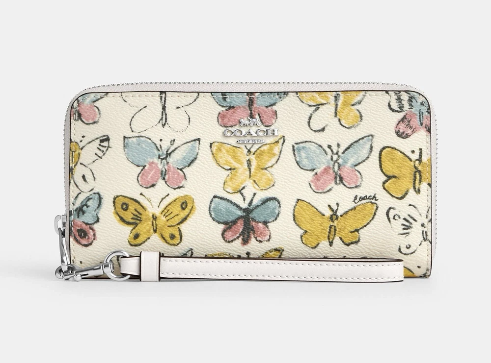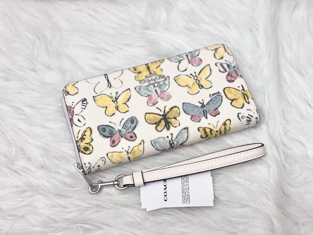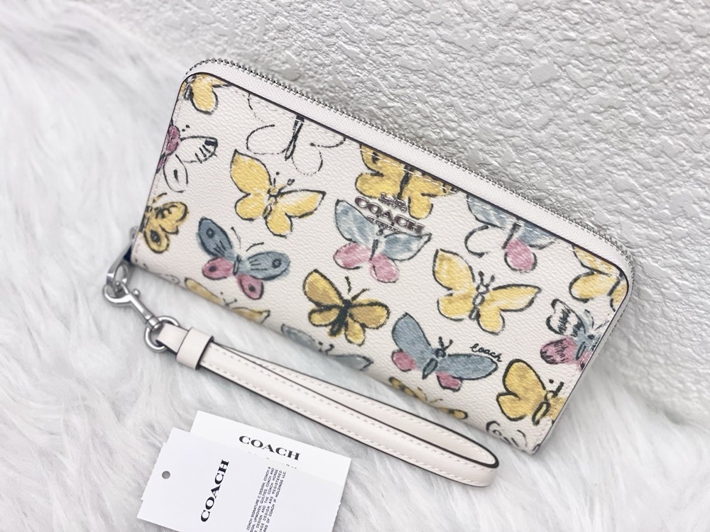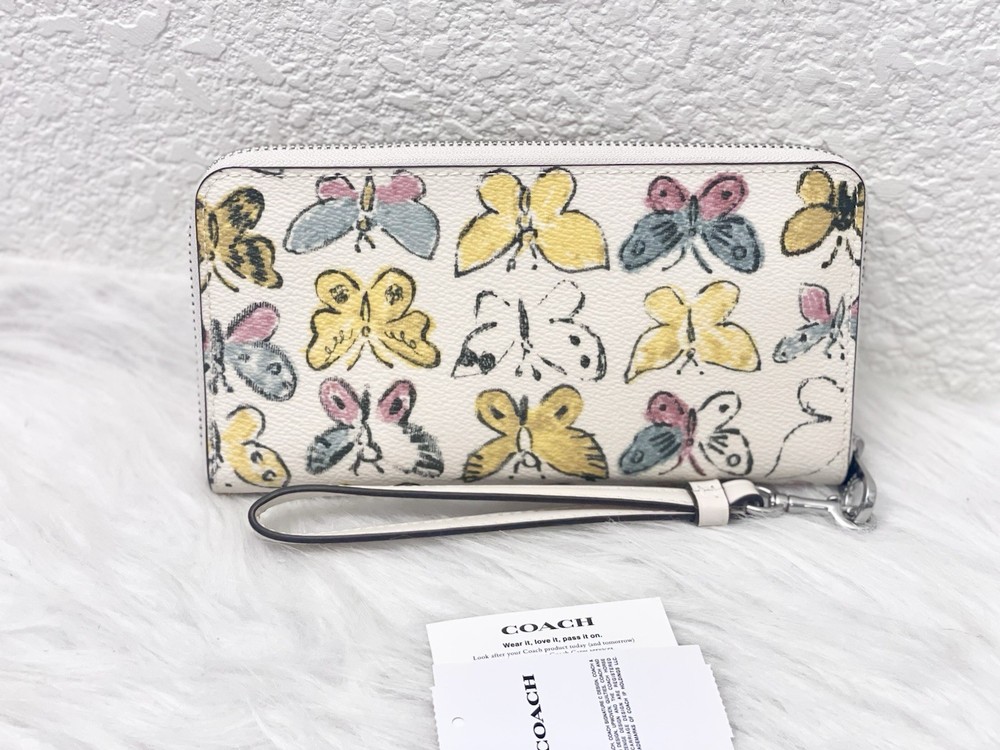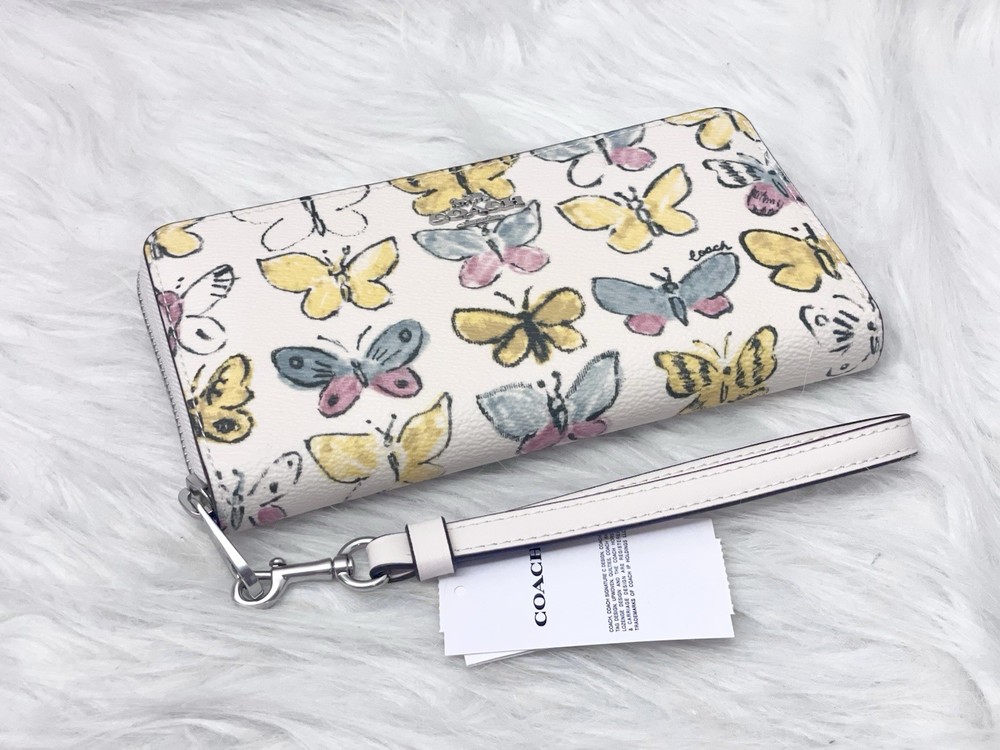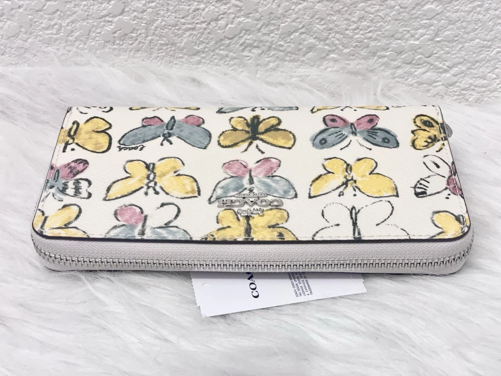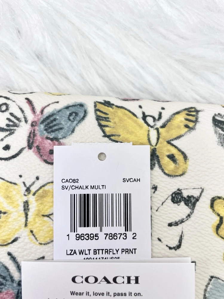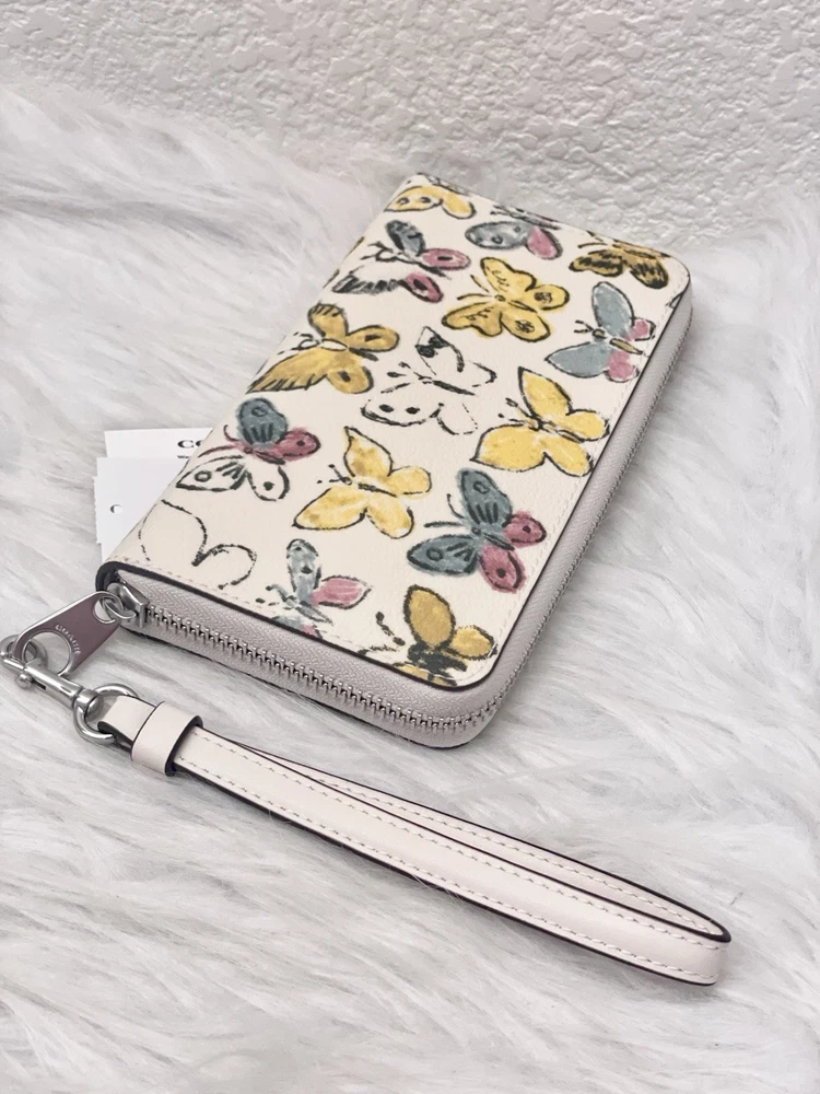 NWT COACH Long Zip Around Wallet/Wristlet W/Butterfly Print COLOR: CHALK Multi 100% Authentic Style Number: CAO82 Measurements Length: 7.5" Height: 4.0" Width: 1.0" Materials Printed coated canvas Strap Detachable wrist strap Features Detachable wrist strap 12 credit card slots Zip-around closure Full-length bill compartments Fits all iPhone and Samsung Galaxy phones Price is firm