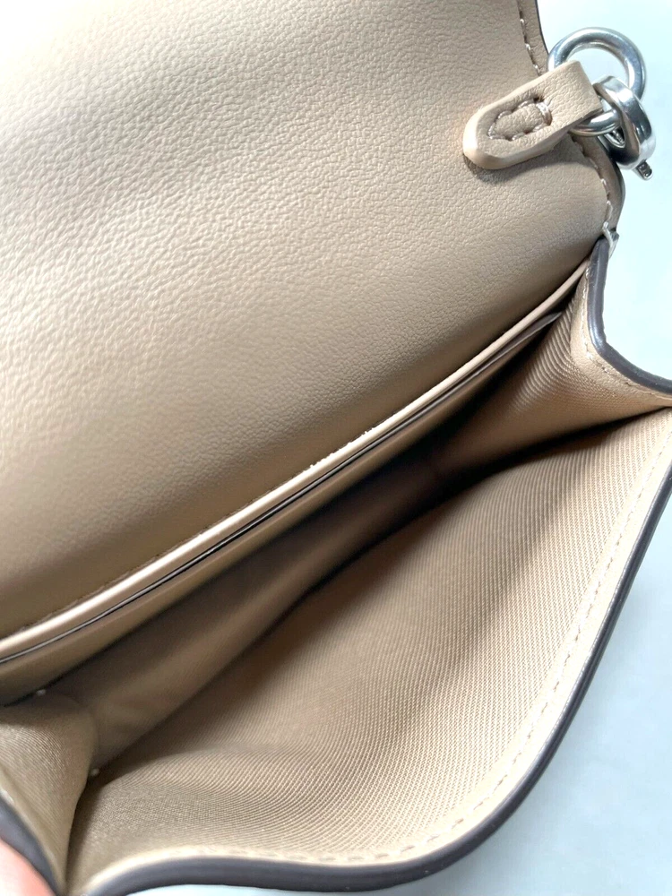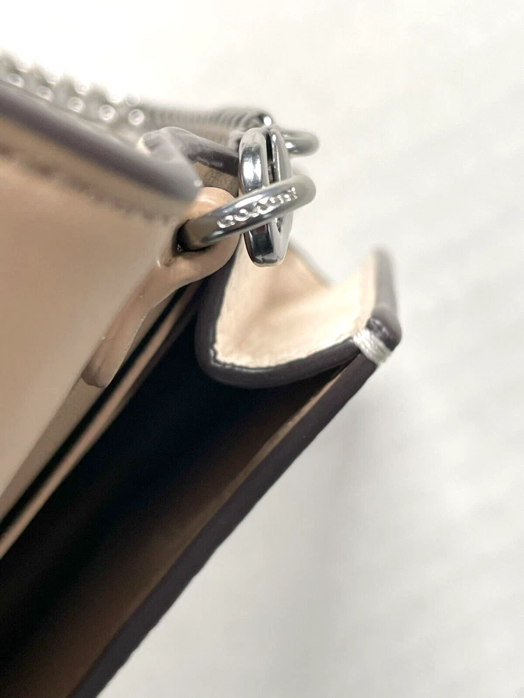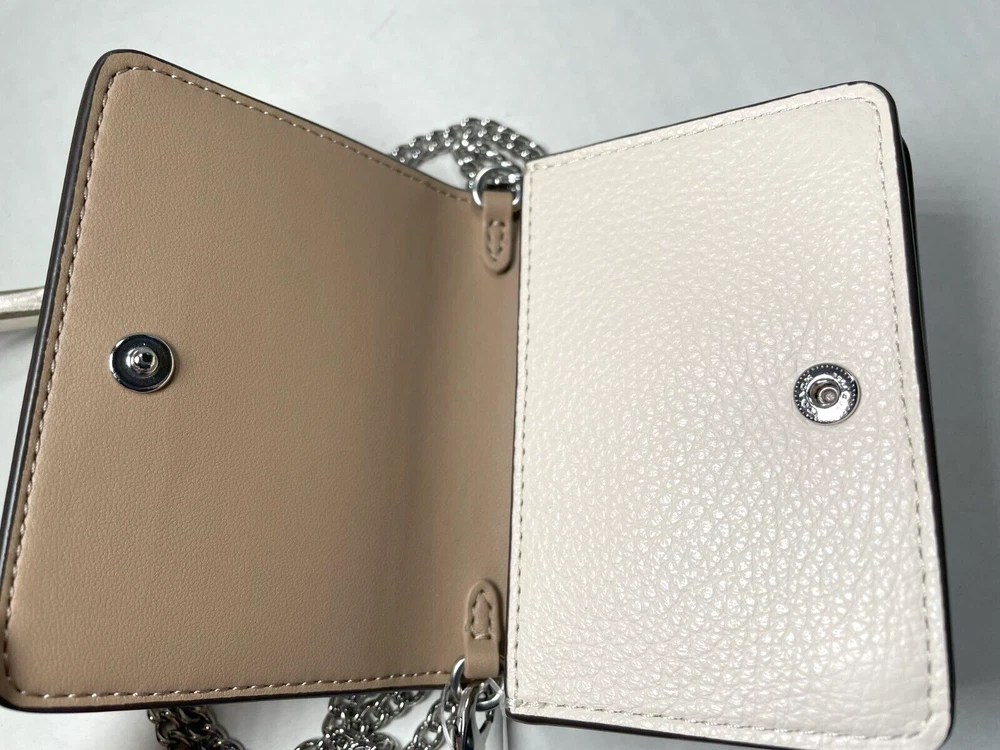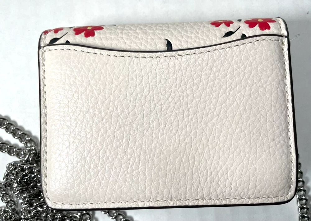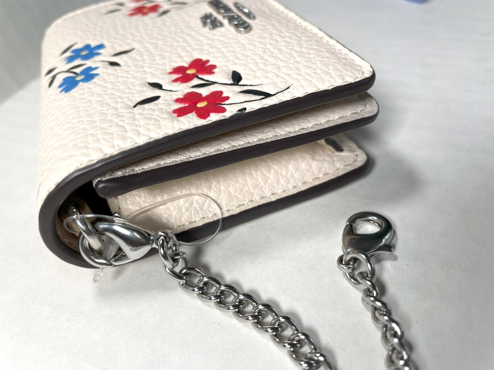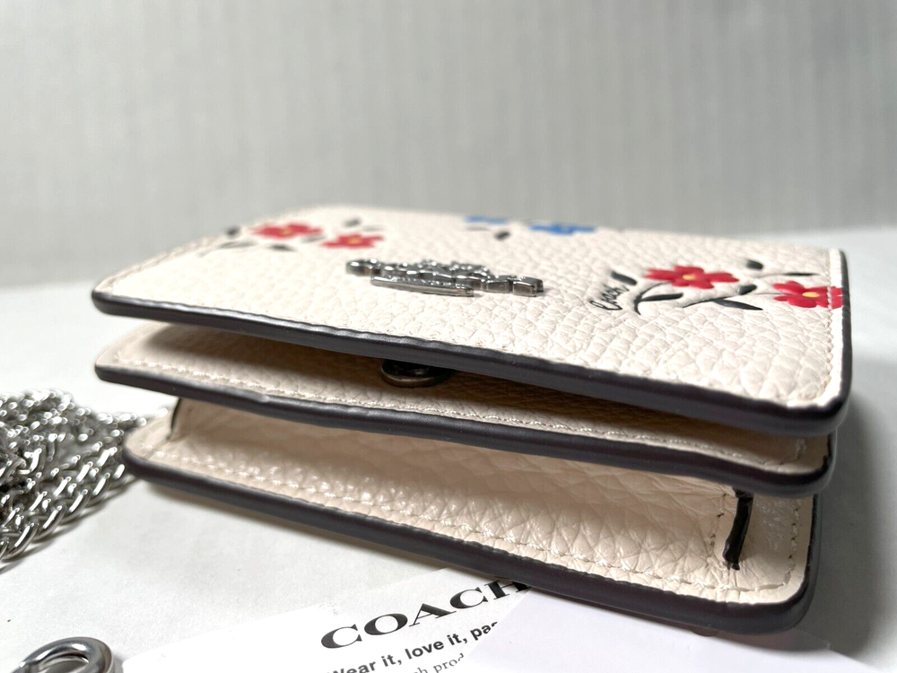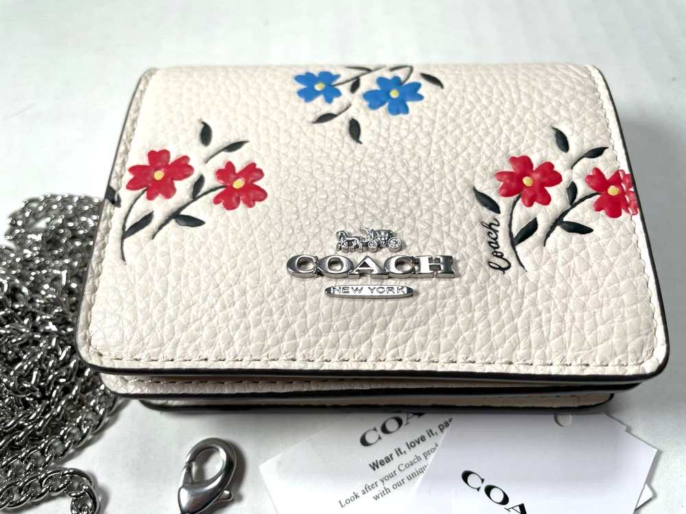 COACH Mini Wallet Pebble Leather with Metal Chain Shoulder strap New with original price tag Absolutely Authentic! Color: Chalk Multi Style: CU005 MSRP: $198.00 Description: Refined pebble leather with Floral Print Front logo metal, in silver tone Chain strap with 22.50" drop for shoulder or crossbody wear Back slide pocket Inside open pocket and slide pocket Fabric lining brown color Length: 4 inches Height: 3 inches Width: 1 inch Please let me know if you have any questions. Comes from a smoke free house. -------------------------------------------------------------------------------------------------------------- Your purchase will be shipped in 24 hours once payment is received and verified. You will be notified of the shipping date via E-Mail -------------------------------------------------------------------------------------------------------------