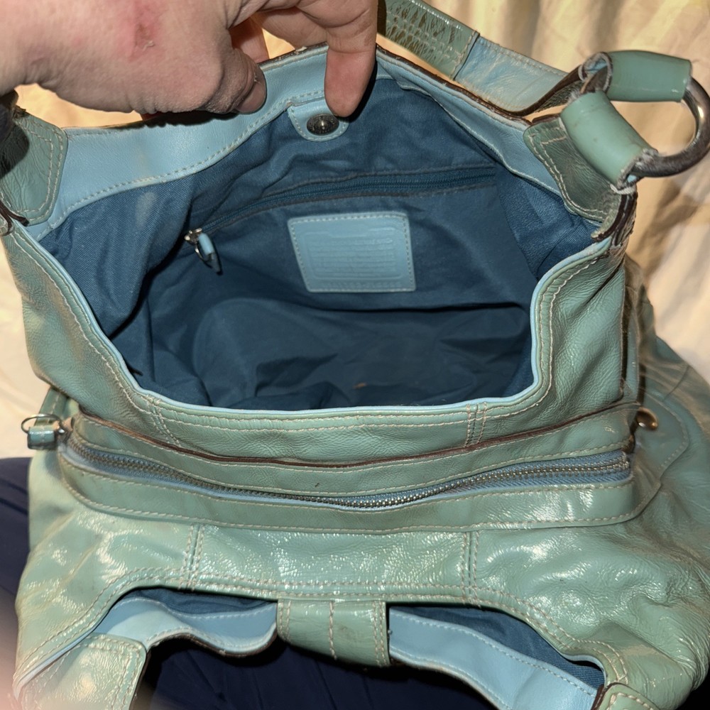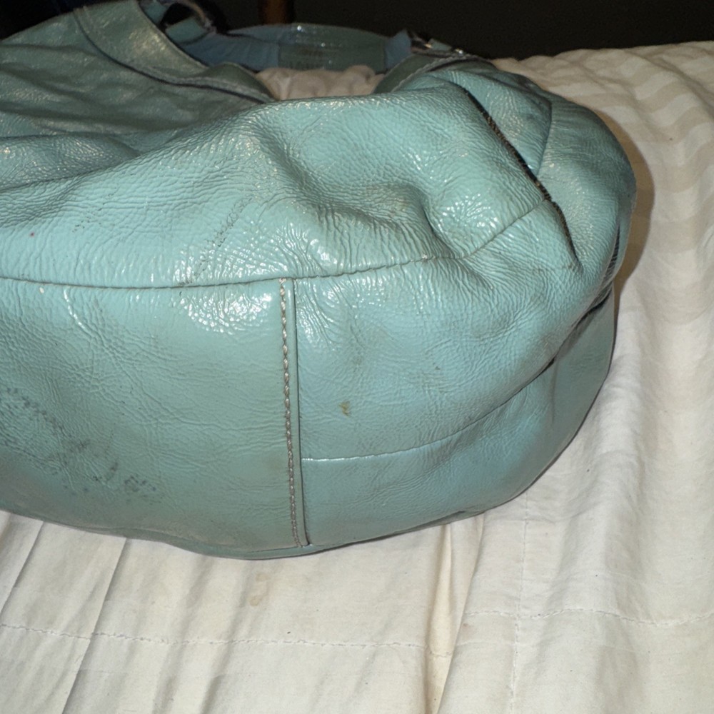 The Coach F16603 Medium Vintage Lynn Soho Light Blue Patent Leather Hobo is a stylish and classic handbag designed for women. Made from a combination of patent leather and canvas, this hobo bag features signature C pattern and hardware in silver. The medium size, brown handle/strap, and fabric lining make it versatile for everyday use. The vintage design adds a touch of timeless elegance to the Coach Soho product line, making it a chic addition to any wardrobe.