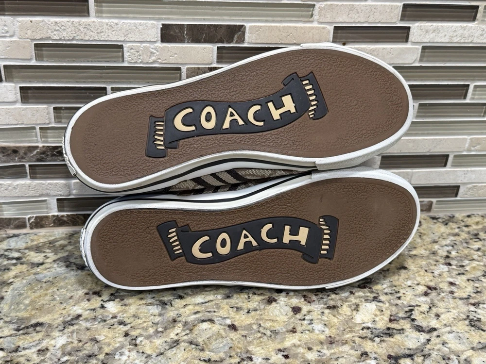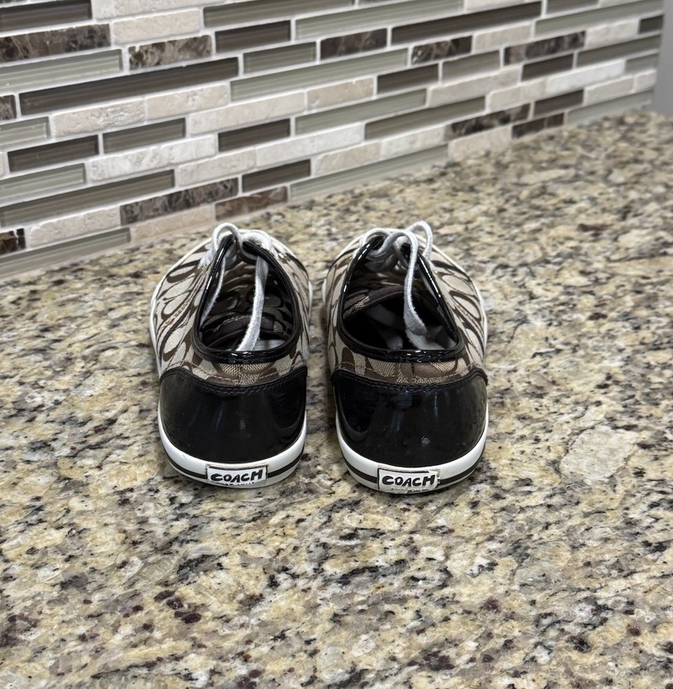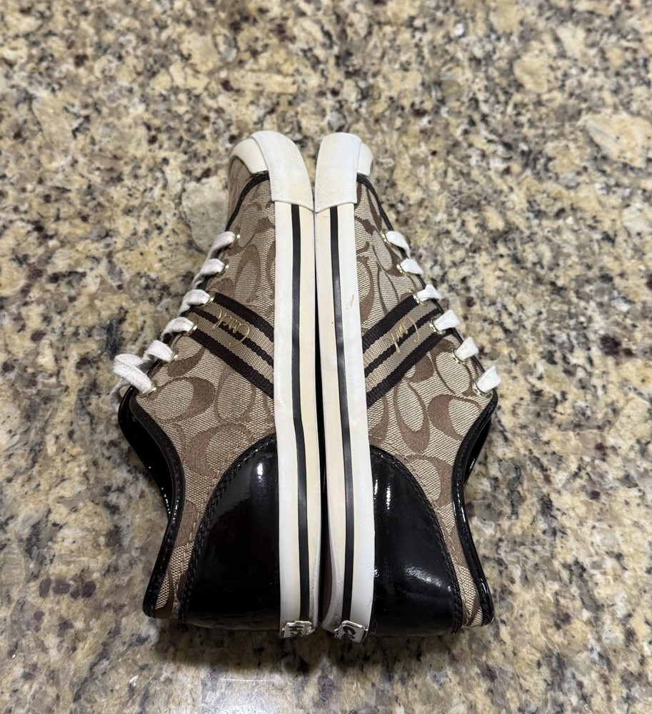 Step into effortless style with the COACH Women's Brown Monogram Signature Folly Lace-Up Sneakers. Crafted for the modern woman, these sneakers feature a chic fabric upper adorned with the iconic COACH logo, delivering a touch of designer elegance to your casual ensembles. The low-top silhouette, combined with a comfortable round toe and flat heel, ensures a smooth stride and all-day comfort. Designed with versatility in mind, these sneakers are suitable for a range of occasions, from a day at the office to a leisurely weekend stroll. The breathable fabric lining and foam insole provide a cozy fit, while the durable rubber outsole offers reliable traction. Whether you're navigating the city streets or exploring the classroom, these sneakers are a smart addition to your footwear collection. Pre-owned condition, minor signs of wear but clean! Heel logo worn due to age/wear. See pictures! Women's size 8. ***OC-boutique.and.more Specifics You Should Know*** Items ship quickly, same day / next day - all through USPS; unless otherwise notated in the listing. (Excluding Weekends & Holidays) I attempt to provide the most affordable shipping carrier available for the size & weight of the package. Shipping Materials Used: clean recycled boxes, new boxes, poly-mailers, bubble mailers, bubble wrap, packing peanuts or any combination of the above to ensure your items are secure and arrive in excellent condition. Please carefully review all pictures & descriptions, as that will clearly express the condition of each item. The listing will state if an item is USED, NEW, and any wear, damages or defects. Please check out my full list of available items and be sure to follow as listings are frequently added! All sales are FINAL. No returns accepted. Please reach out if you have any questions.