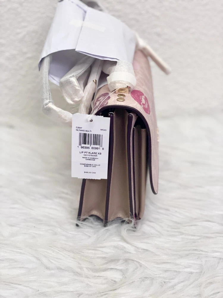 Coach Klare Crossbody Bag In Signature Canvas With Lips Print Brand new with tags 100% Authentic Limited Edition Original packaging COLOR: GOLD/SAND MULTI Style CZ947 Gold/Sand Multi MSRP $398 Product Details: Printed coated canvas and smooth leather Inside multifunction and zip pocket Snap closure, fabric lining Outside open pocket Strap with 22" drop doubles up for three ways to wear: short or long on the shoulder or crossbody style 8.5" (L) x 6.25" (H) x 2.75" (W) Style No. CZ947 Price is firm