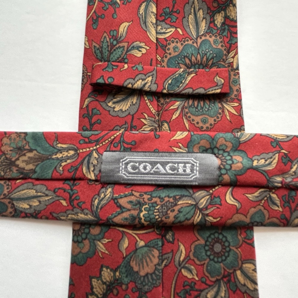 Elevate your formal attire with this exquisite Coach paisley tie, a timeless accessory that effortlessly complements a variety of occasions. Crafted from luxurious silk, the tie measures a classic 57 to 60 inches in length and features a classic width, ensuring a perfect knot and a smooth drape every time. Its vibrant reddish rust, green gold palette is inspired by the ancient madder plant (?), bringing a preppy yet elegant touch to your ensemble. Expertly made in Italy, this designer tie is a testament to Coach's commitment to quality and style. The intricate paisley pattern adds a sophisticated depth to the tie, making it an ideal choice for weddings, Easter events, or any formal gathering. The handmade nature of this tie further emphasizes its unique craftsmanship and enduring appeal. Add a touch of classic luxury to your wardrobe with this exceptional piece.