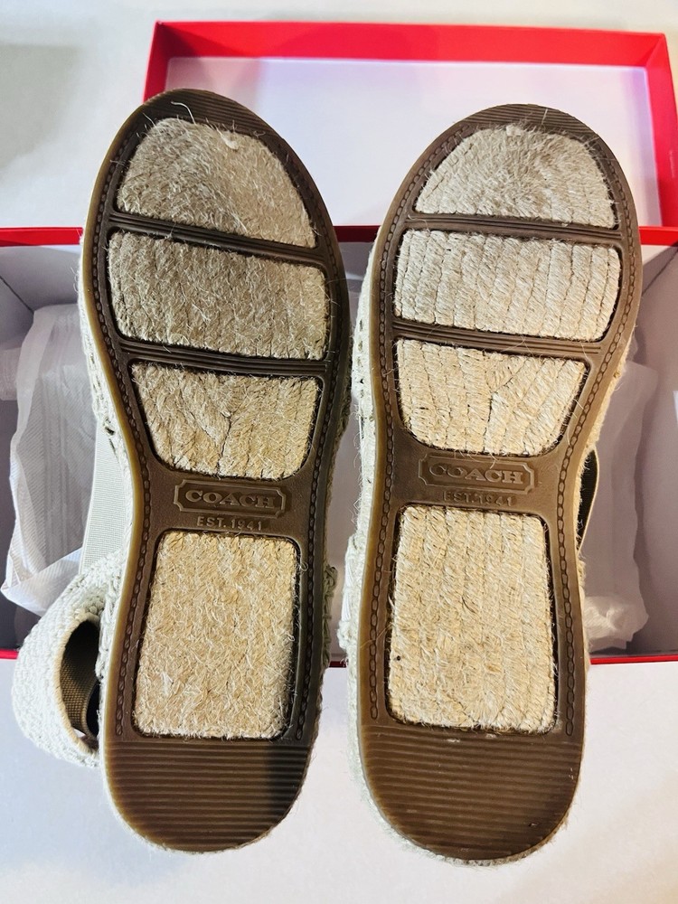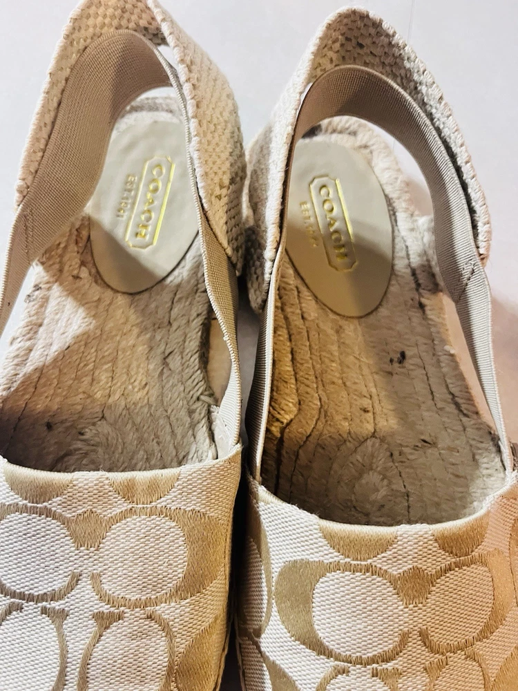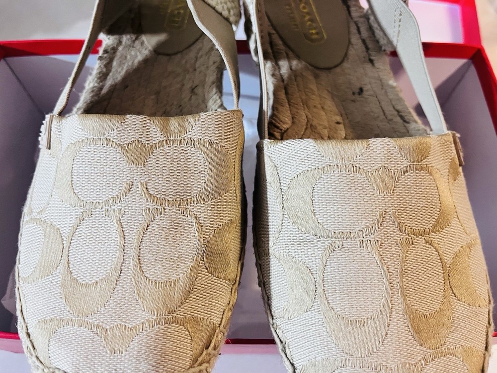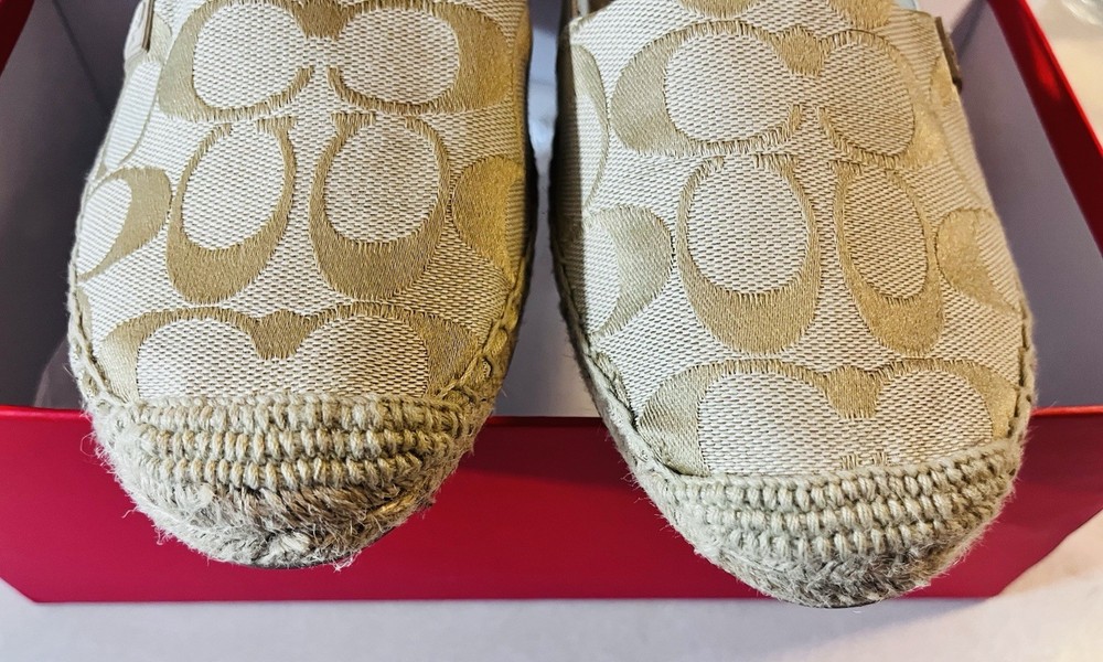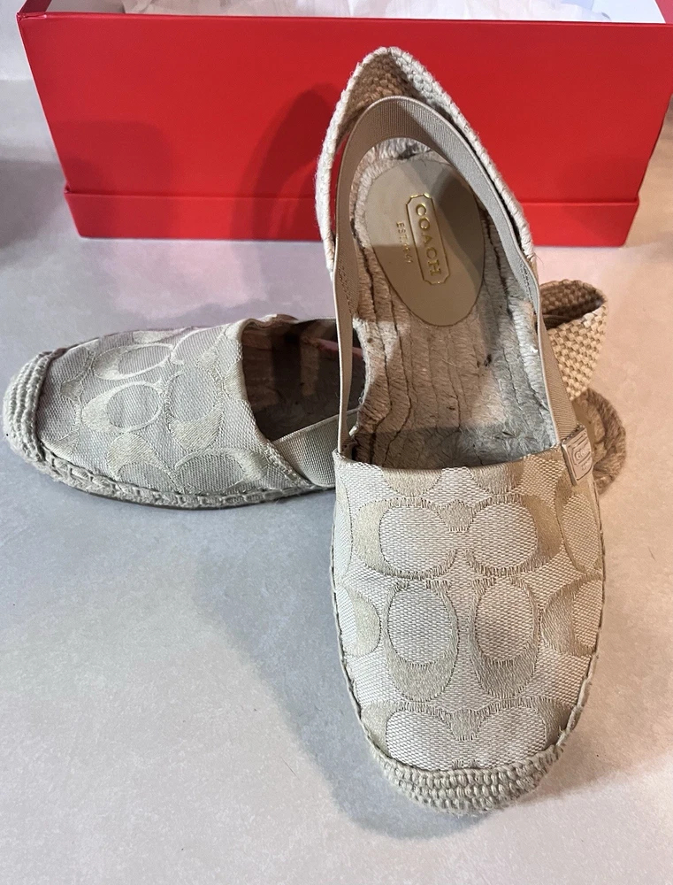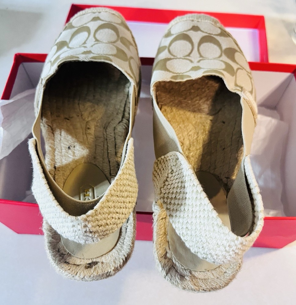 Elevate your style with these Coach Rayanne 12CM Signature C Espadrille in Khaki. These flats are perfect for casual occasions and feature a slip-on closure for added comfort. The buckle and canvas upper material add a touch of sophistication to these loafers. Very clean. See pictures