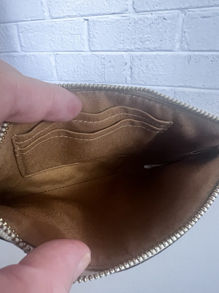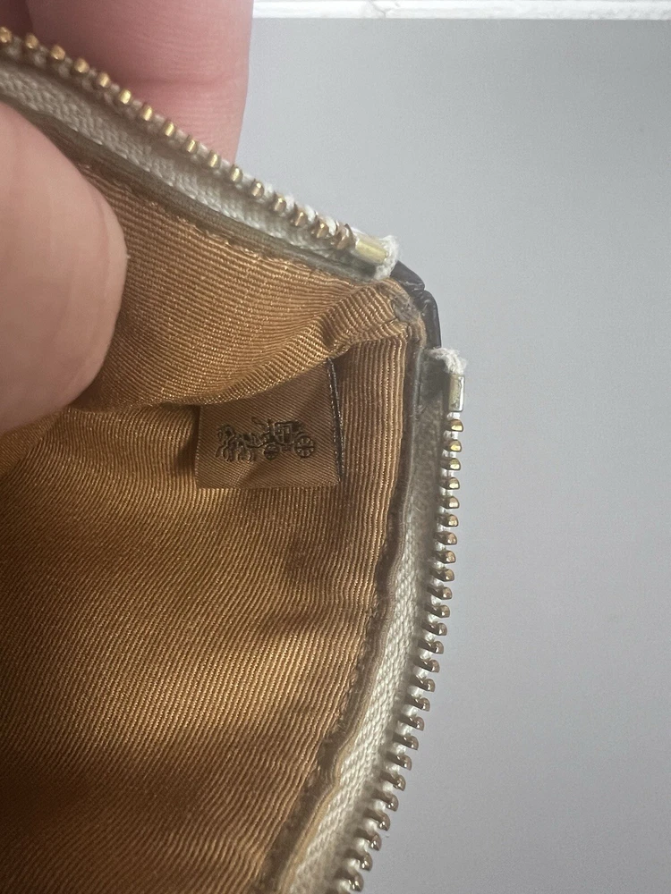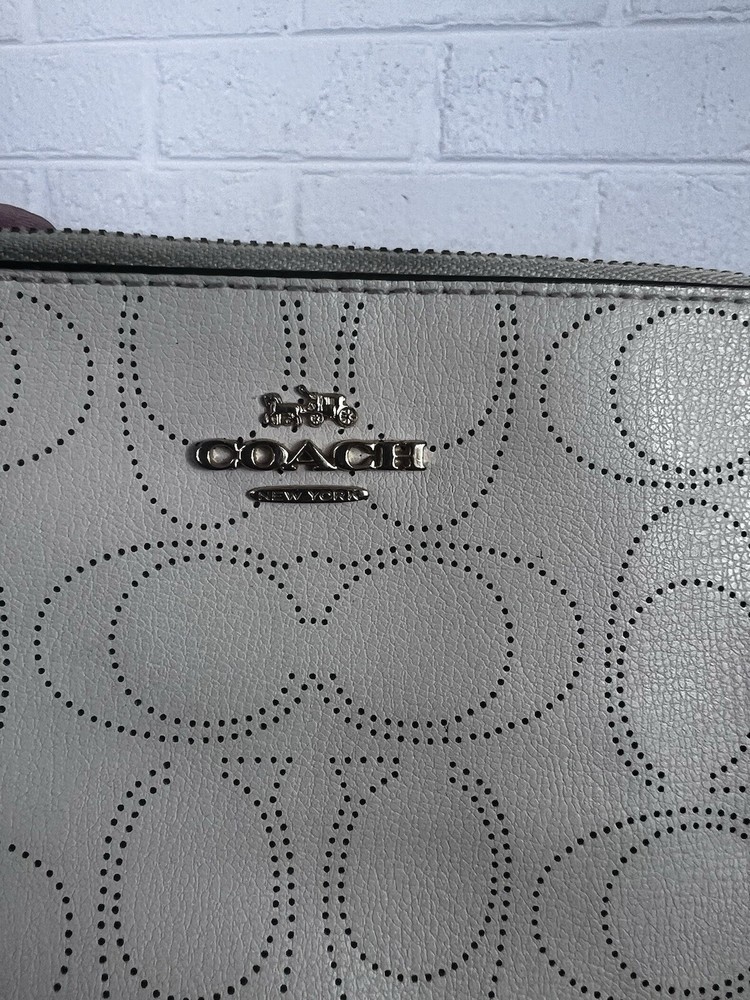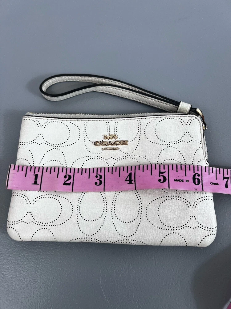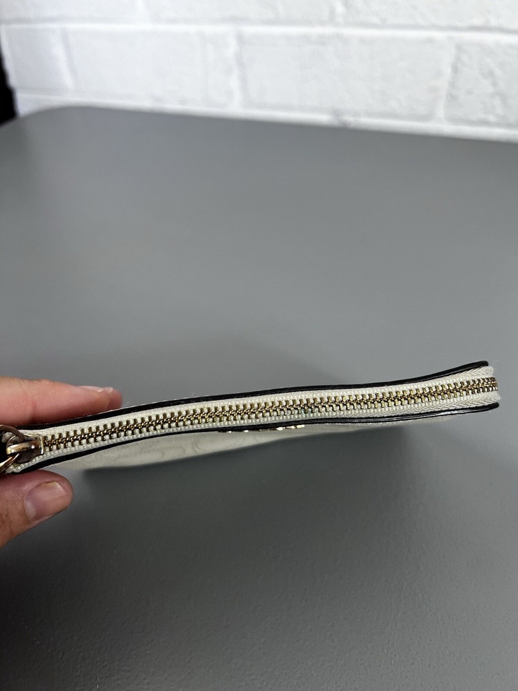 Zip Wristlet (Ivory/Gold - NWT) This COACH Corner Zip Wristlet is perfect for anyone looking for stylish and functional accessories. Lot Details - Corner Zip Wristlet in Light gold/Chalk (Coach Outlet) - Attached wristlet strap - Perforated Leather - Comes from a Smoke-free and pet-free home Some signs of wear !! Please see the pictures