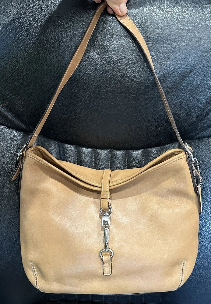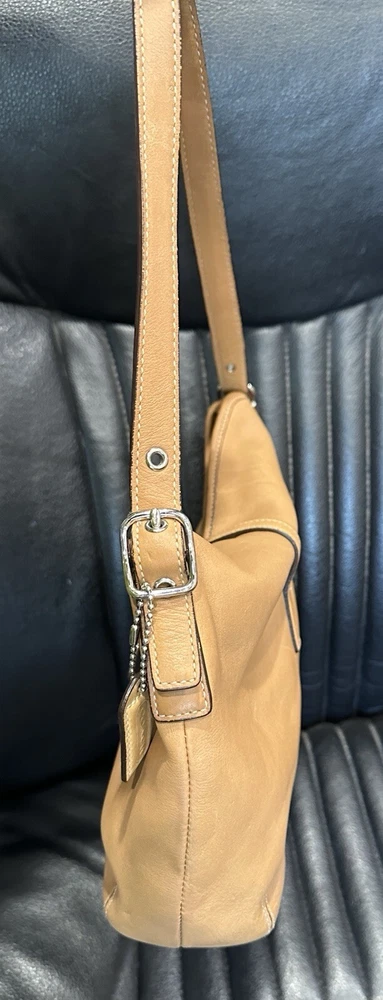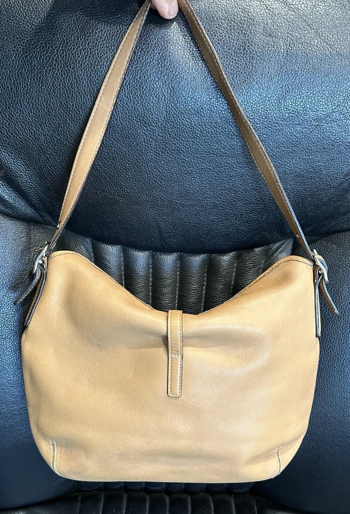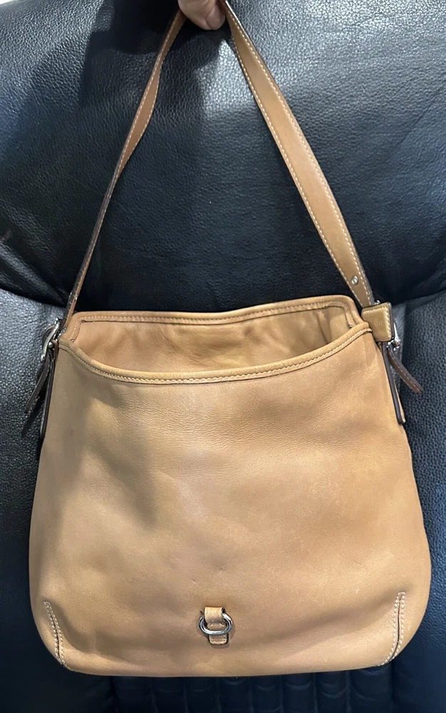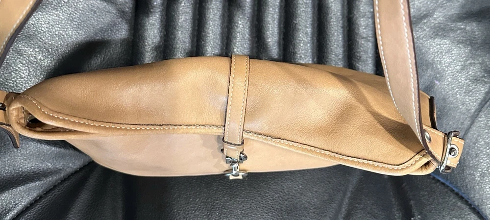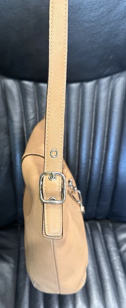 COACH VTG HAMPTON Clip Camel Tan Smooth Leather Shoulder Hobo Bag Beautiful, smaller Coach bag, top rolls over, and clips with unusual front clip closure. Straps adjust somewhat at the buckles.. Size approx. 10" x 8" x 2.5" Strap drops from 9" to 10" Clean inside and out..Inside are a zip pocket and two slip pockets. Leather has been oiled, ready to go. The inside legend must have gotten wet at some point, difficult to read, you decide. Number Looks like: J3S 3285 Items will always be mailed within one business day of purchase, and by using the most reliable and cost efficient method, usually Priority. If there is a huge difference in price, you will receive a shipping credit. I want to foster great lines of communication with my buyers. Please check out all photos, and feel free to ask questions before purchase. Thanks for looking, and check out my other fab handbags for sale.