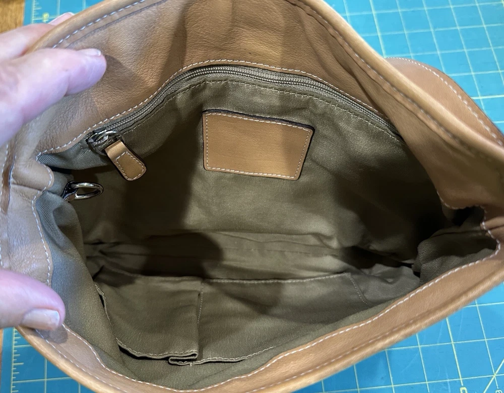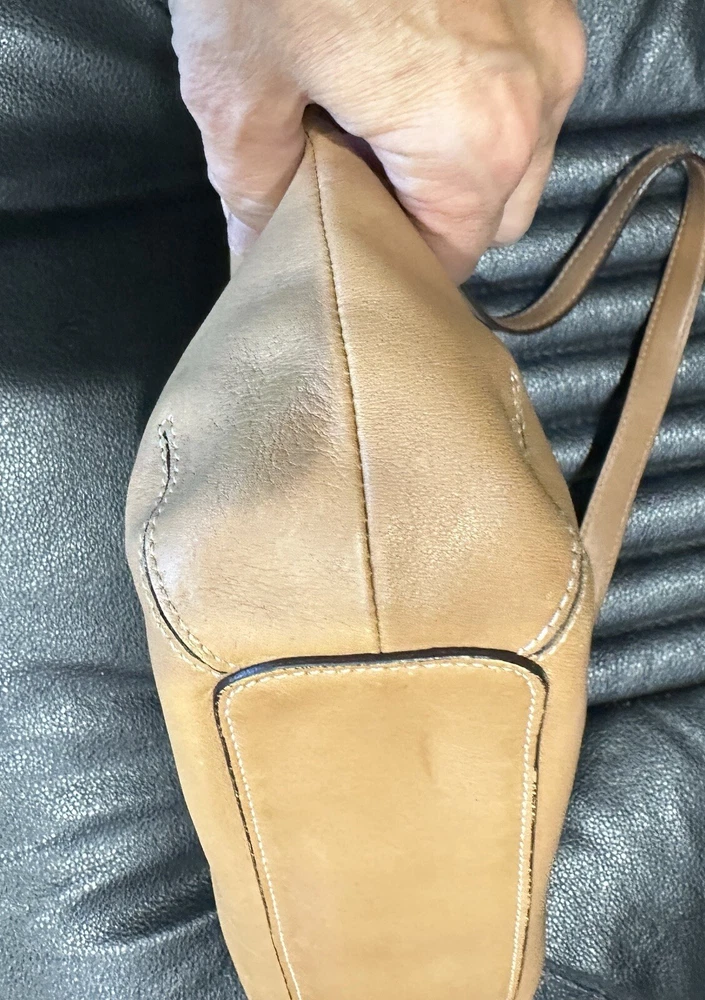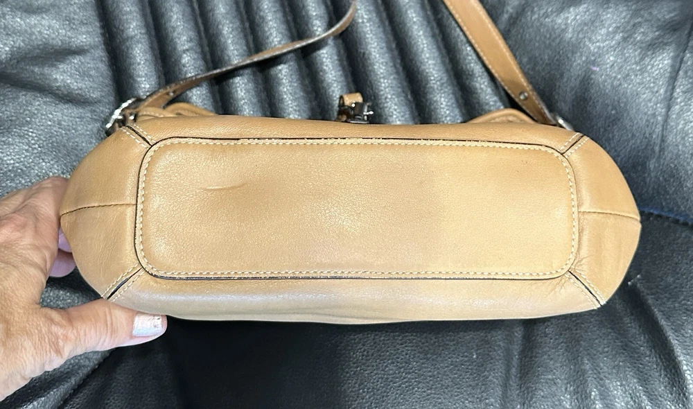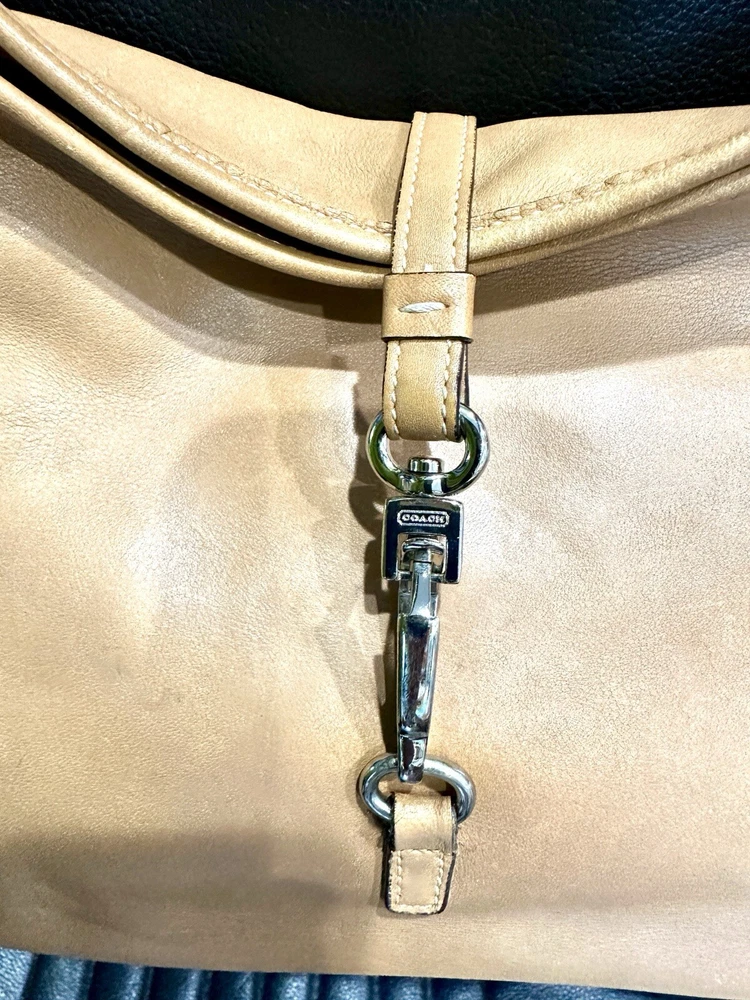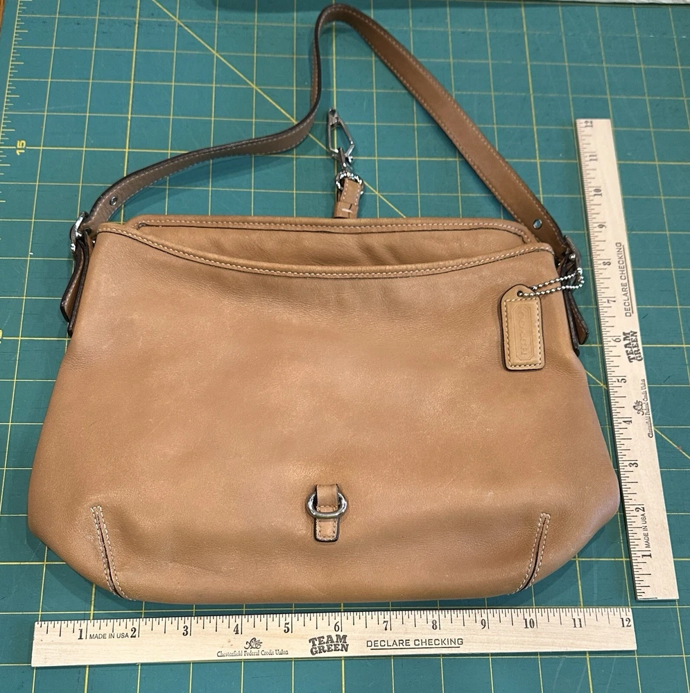 COACH VTG HAMPTON Clip Camel Tan Smooth Leather Shoulder Hobo Bag Beautiful, smaller Coach bag, top rolls over, and clips with unusual front clip closure. Straps adjust somewhat at the buckles.. Size approx. 10" x 8" x 2.5" Strap drops from 9" to 10" Clean inside and out..Inside are a zip pocket and two slip pockets. Leather has been oiled, ready to go. The inside legend must have gotten wet at some point, difficult to read, you decide. Number Looks like: J3S 3285 Items will always be mailed within one business day of purchase, and by using the most reliable and cost efficient method, usually Priority. If there is a huge difference in price, you will receive a shipping credit. I want to foster great lines of communication with my buyers. Please check out all photos, and feel free to ask questions before purchase. Thanks for looking, and check out my other fab handbags for sale.