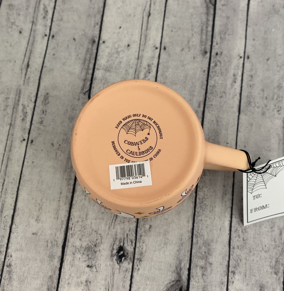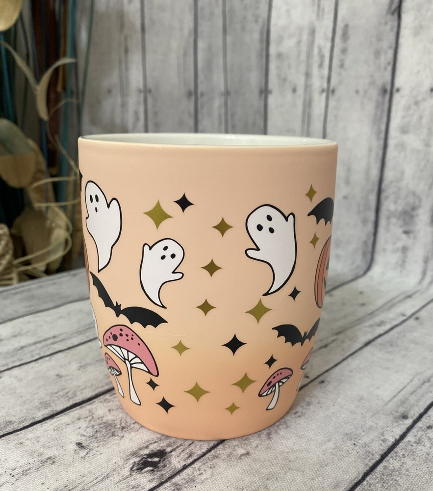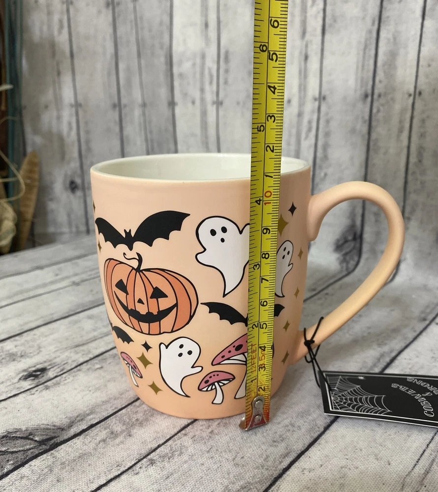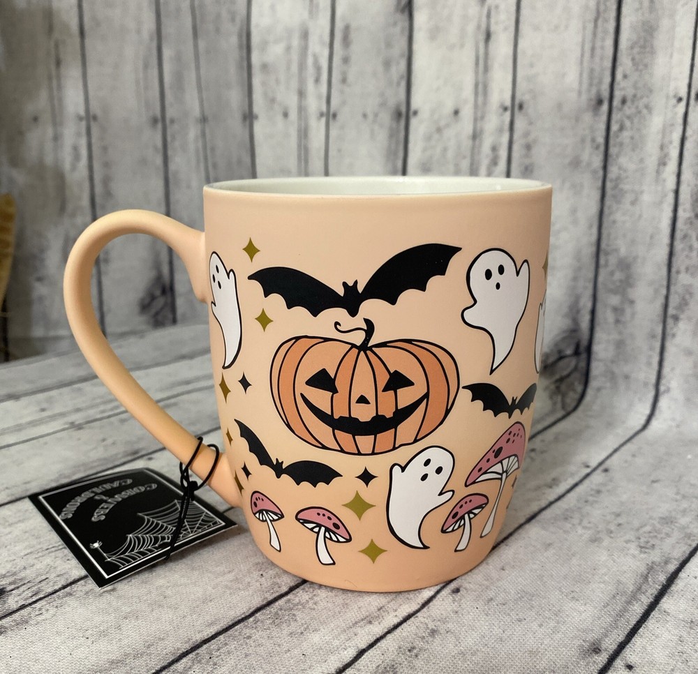 Get into the spooky spirit with this COBWEBS & CAULDRONS Halloween Pumpkins-Ghosts -Bats & mushrooms Soft Touch Mug. The ceramic mug features a peach color with gold and black stars is decorated with a pumpkin ghosts bats -With a capacity of 16 fl oz and a height of 4.5 inches. Whether you're sipping your favorite hot beverage or just looking for a spooky addition to your mug collection, this COBWEBS & CAULDRONS mug is a must-have.