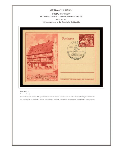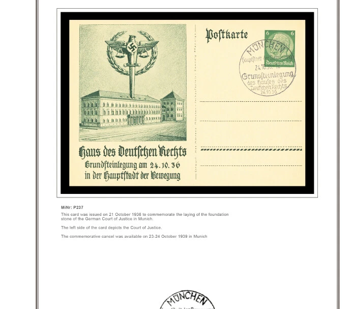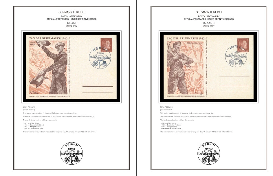 GERMANY III REICH STATIONERY: OFFICIAL POSTCARDS [ Postkarte Deutsches Reich | Vol.01: Hindenburg Definitives+Airmail Issues+Hitler Definitives & Vol. 02: Commemorative Issues ] 1933-1944 COLOR PRINTED STAMP ALBUM PAGES (169 pages) Full color printed pages f o r Germany III Reich official postcards 1933-1944 . The postcard illustrations are ordered chronologically and according to Michel catalogue. Top quality color stamp album pages printed on heavy stock 200 g/m 2 (75 lbs cover weight) acid-free couchet silky white paper. US letter size 8.5 x 11” . Technical Specifications: Country Germany (III Reich) Period 1933-1944 Print Full color Paper 200 g/m 2 (75 lbs) Nr. Pictures 169 (100% coverage) Package Weight 1/1.23 kg (2.20/2.71 lbs) NOTE: Info on postcard emissions, front /back illustrations and postmark pictures displayed (when/if available). Please note: These are full-color printed pages. They are NOT hingeless. For protection of both the pages and the postcards, we recommend using stamp mounts or similar instead of hinges. The pages are sent unpunched – this allows you to punch them as needed (for 2 or more ring binders). Black and white printing available on request. NO POSTCARDS INCLUDED. INTERNATIONAL STANDARD SHIPPING [Contact us first if you desire registered shipping or for shipping rates within Europe] [Stampextras won´t be responsible for losses under international standard shipping ] GERMANY III REICH OFFICIAL POSTCARDS 1933-1944