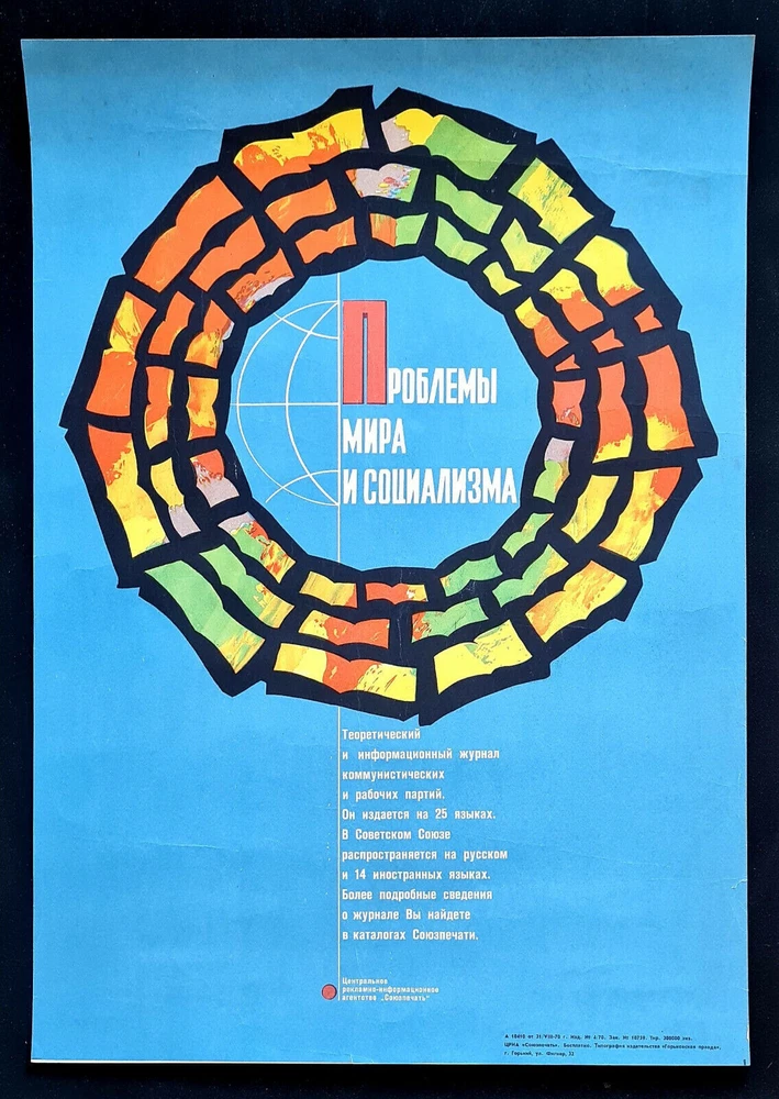 Original slogan on the poster: ПРОБЛЕМЫ МИРА И СОЦИАЛИЗМА ТЕОРЕТИЧЕСКИЙ И ИНФОРМАЦИОННЫЙ ЖУРНАЛ КОММУНИСТИЧЕКСКИХ И РАБОЧИХ ПАРТИЙ. ОН ИЗДАЕТСЯ НА 25 ЯЗЫКАХ. В СОВЕТСКОМ СОЮЗЕ РАПРОСТРАНЯЕТСЯ НА РУССКОМ И 14 ИНОСТРАННЫХ ЯЗЫКАХ. БОЛЕЕ ПОДРОБНЫЕ СВЕДЕНИЯ О ЖУРНАЛЕ ВЫ НАЙДЕТЕ В КАТАЛОГАХ СОЮЗПЕЧАТИ. Literally English translation: PROBLEMS OF PEACE AND SOCIALISM THEORETICAL AND INFORMATIONAL JOURNAL OF THE COMMUNIST AND WORKERS' PARTIES. IT IS PUBLISHED IN 25 LANGUAGES. IN THE SOVIET UNION IT IS DISTRIBUTED IN RUSSIAN AND 14 FOREIGN LANGUAGES. YOU WILL FIND MORE DETAILED INFORMATION ABOUT THE JOURNAL IN SOYUZPECHAT CATALOGS. POSTER ARTIST: UNKNOWN PRINT YEAR: 1970 SUBJECT: COMMUNIST MAGAZINE PROMOTION LANGUAGE: RUSSIAN PRINT RUN: 300.000 PUBLISHED BY: "SOUYZPECHAT" SIZE: IN: 15 ¾ x 22 ½ = CM: 40 x 57 CONDITION: ROLLED, GOOD The artwork is in condition, but looks impressive alive. Before your bid please consider the poster condition from attached pictures and text description, if you still need more information please feel free to require additional pictures or video, it would be my pleasure to assist you with any questions regarding this auction. Shipping rolled in a hard plastic tube. www.facebook.com/sovietartposters Listing and template services provided by inkFrog