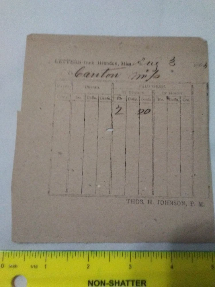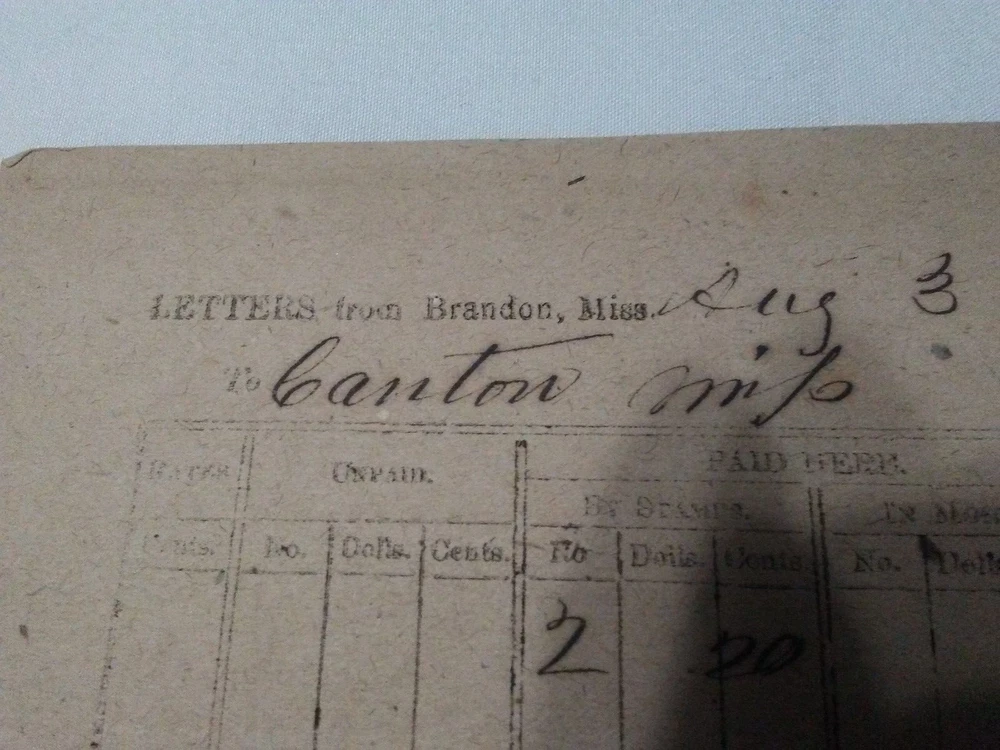 CONFEDERATE POSTAL RECEIPT FOR LETTERS TRANSFERRED FROM BRANDON TO CANTON 1864