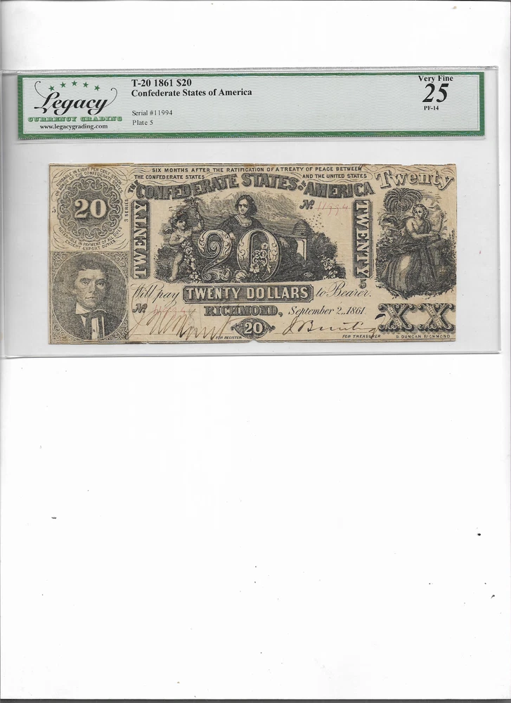 CONFEDERATE STATES OF AMERICA T-20 1861 $20 VERY FINE 25 SHIPS USPS FIRST CLASS COMBINED SHIPPING AVAILABLE